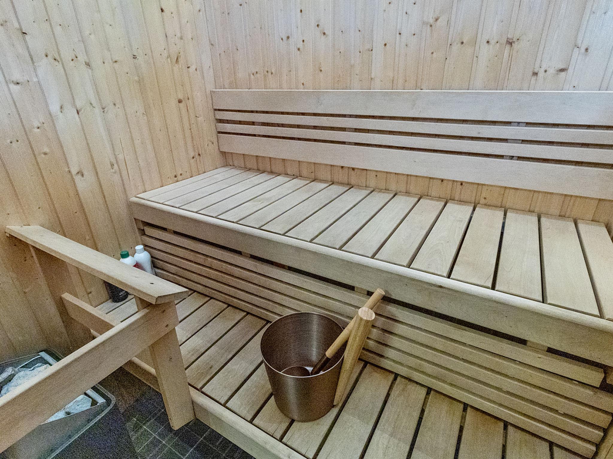 In the ground floor kitchen/living room, bed room 2 beds, washroom, sauna (elect. stove), WC, open porch. Upstairs loft (30 sqm) with 4 beds. Child safety gate at the top of the stairs. Air source heat pump.