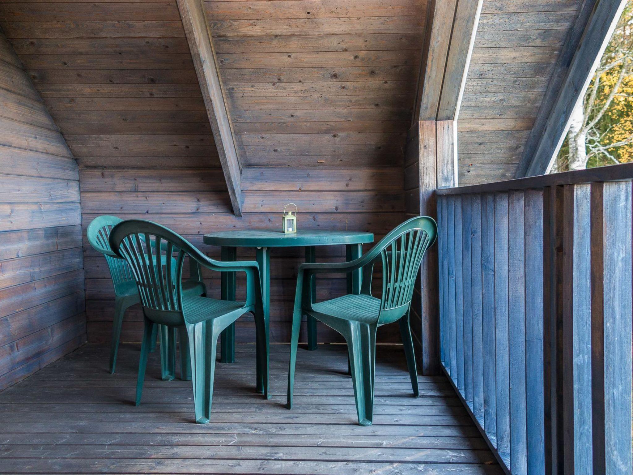 Log cabin, which is built in 2000, has two floors; in the ground floor kitchen, washroom, sauna (wood-burning stove), hall, terrace. Upstairs 2 bedrooms with double beds (140 cm wide) + 1 bed in each, balcony. Rather steep stairs to the upper floor.