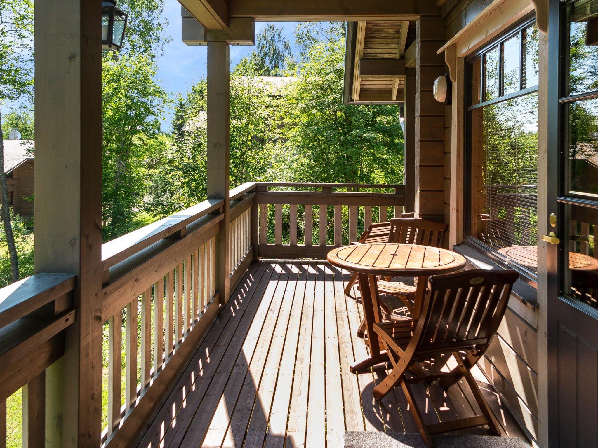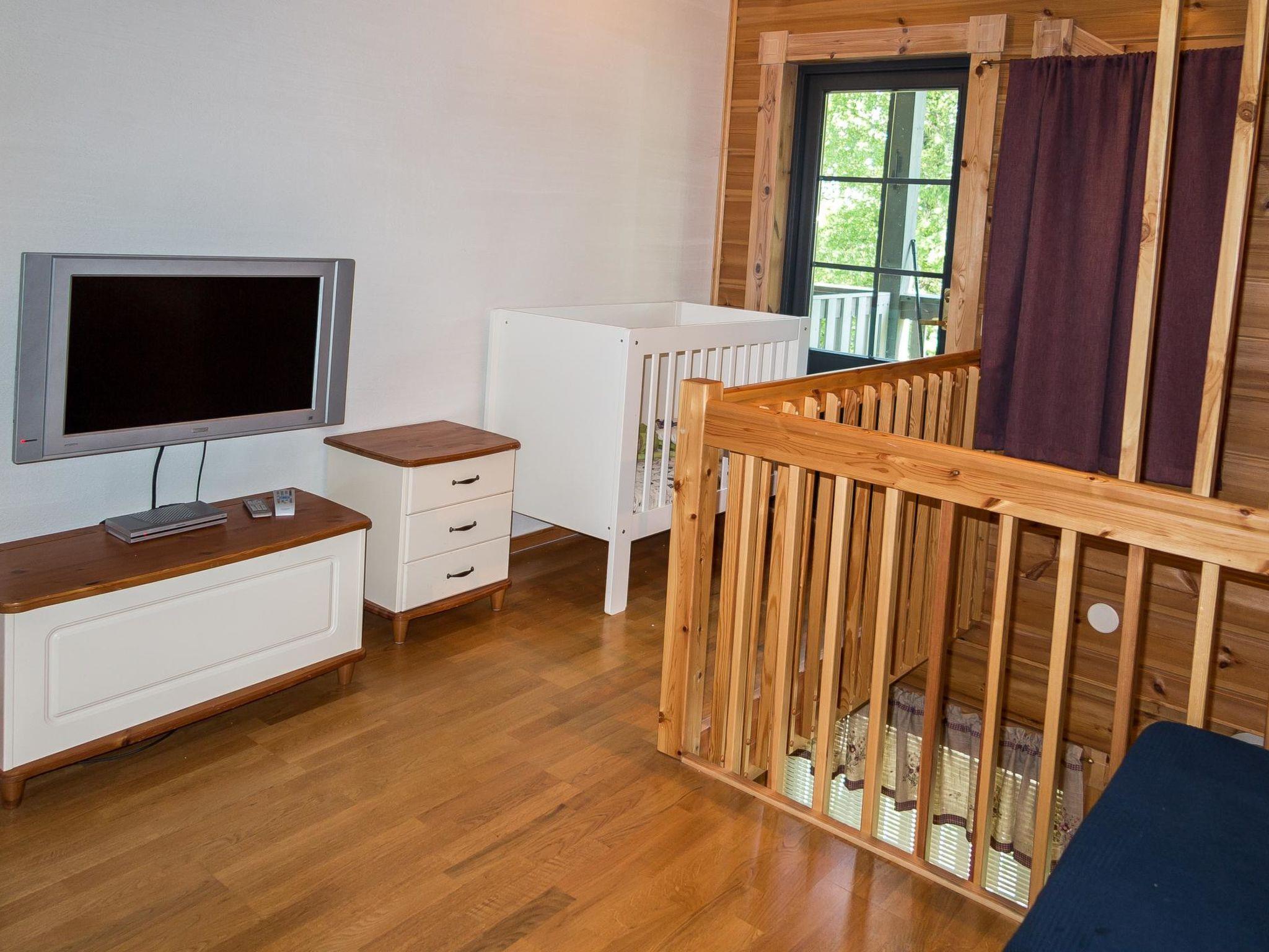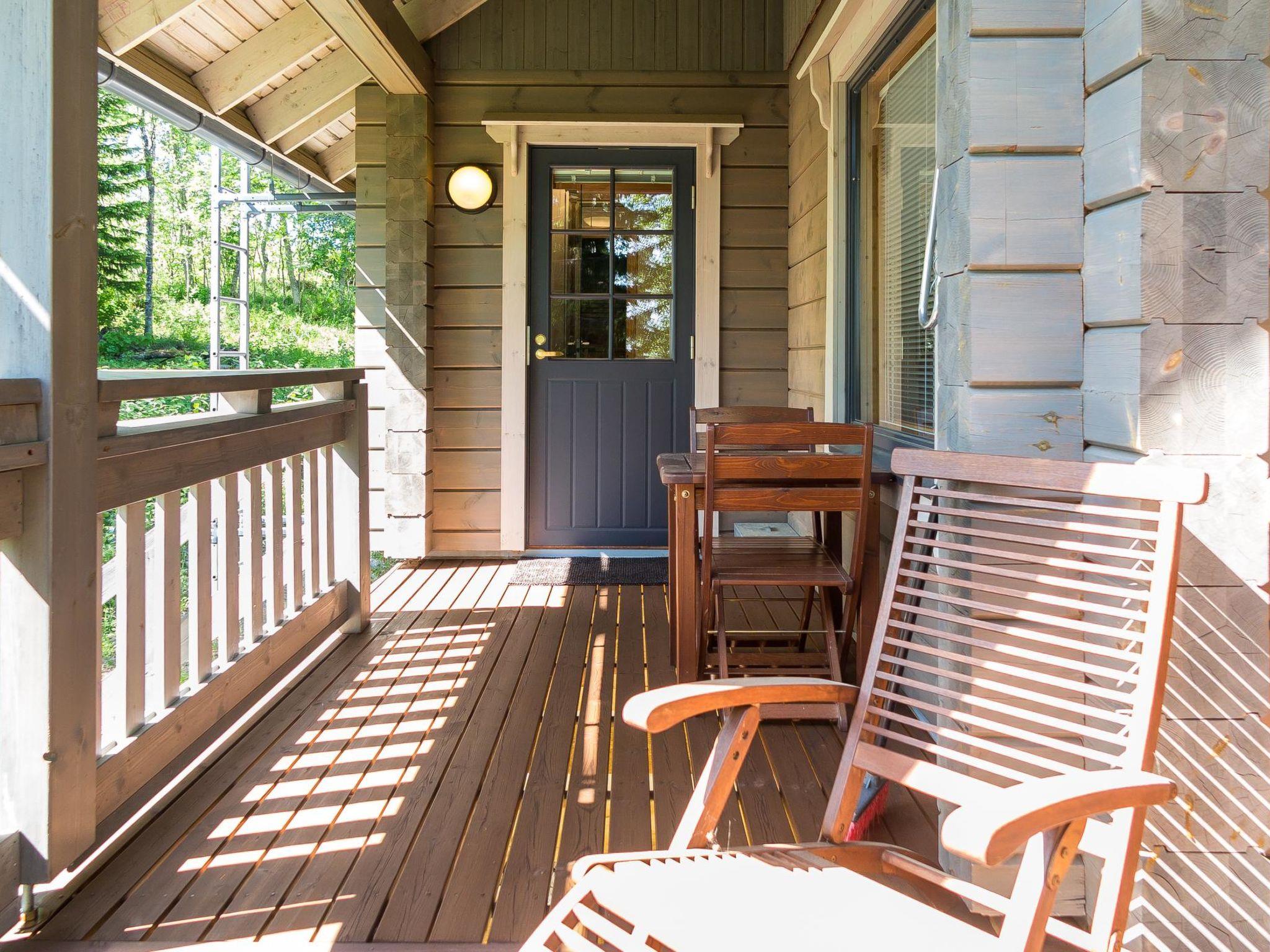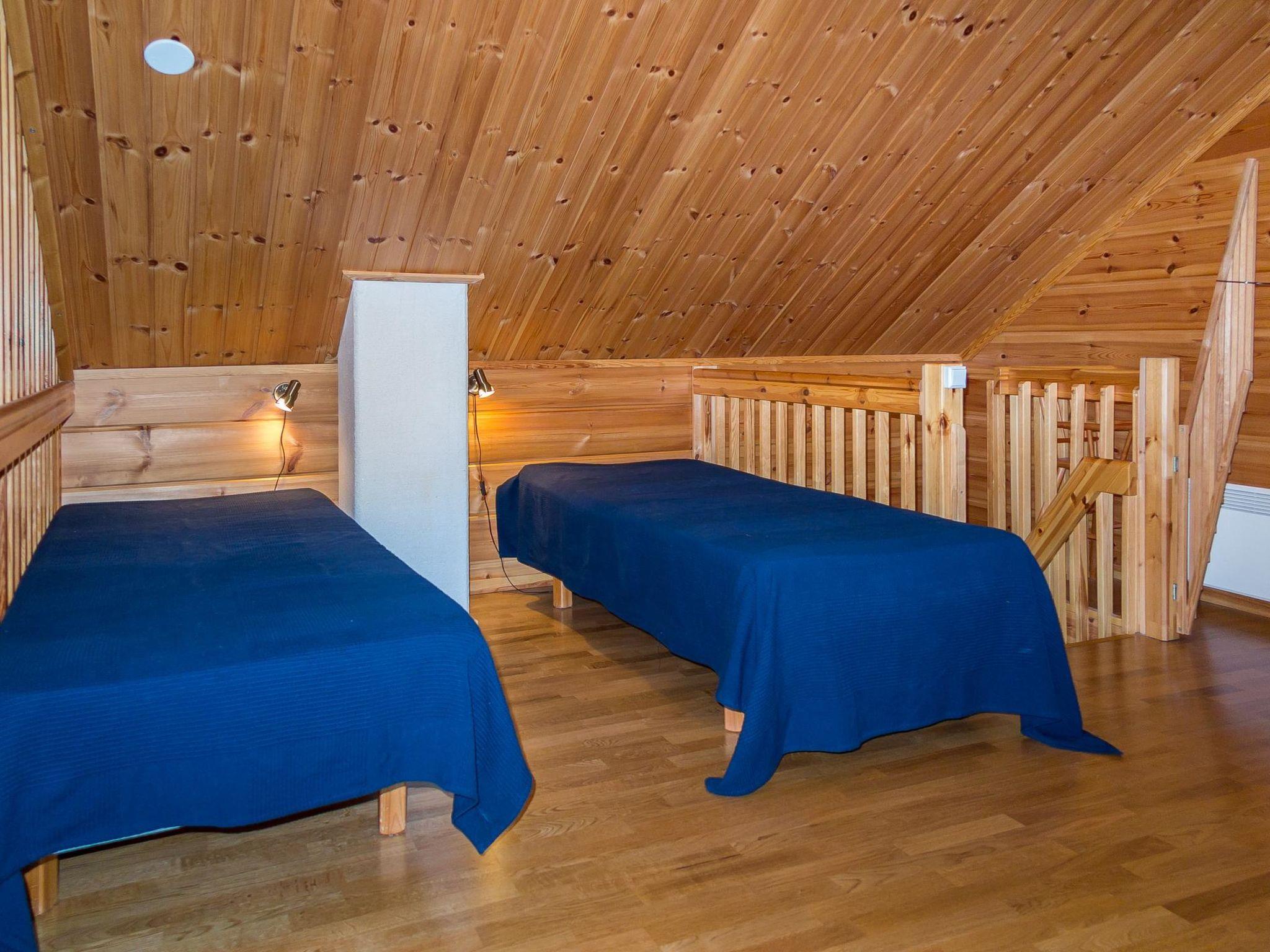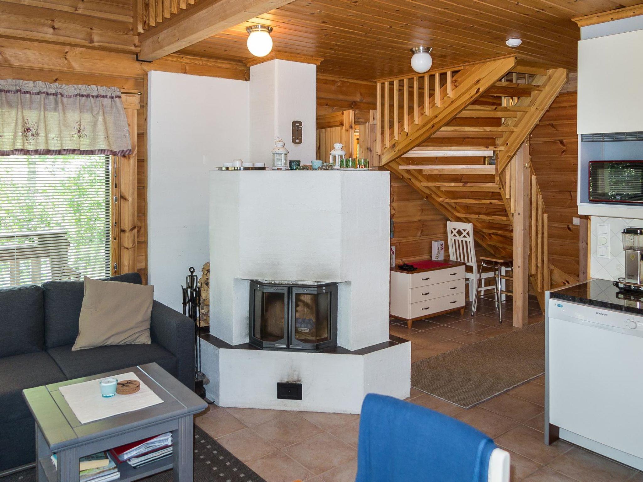 Semidetached log home from 2007, living room/kitchen with sofa-bed for 1 person, bedroom with double bed, washing room, dressing room, WC, sauna (electric stove) terrace, upstairs bedroom with 2 separate beds +1 child bed, hall with 2 beds, TV and WC. A shared washing machine is located in the basement floor, access from outside.
