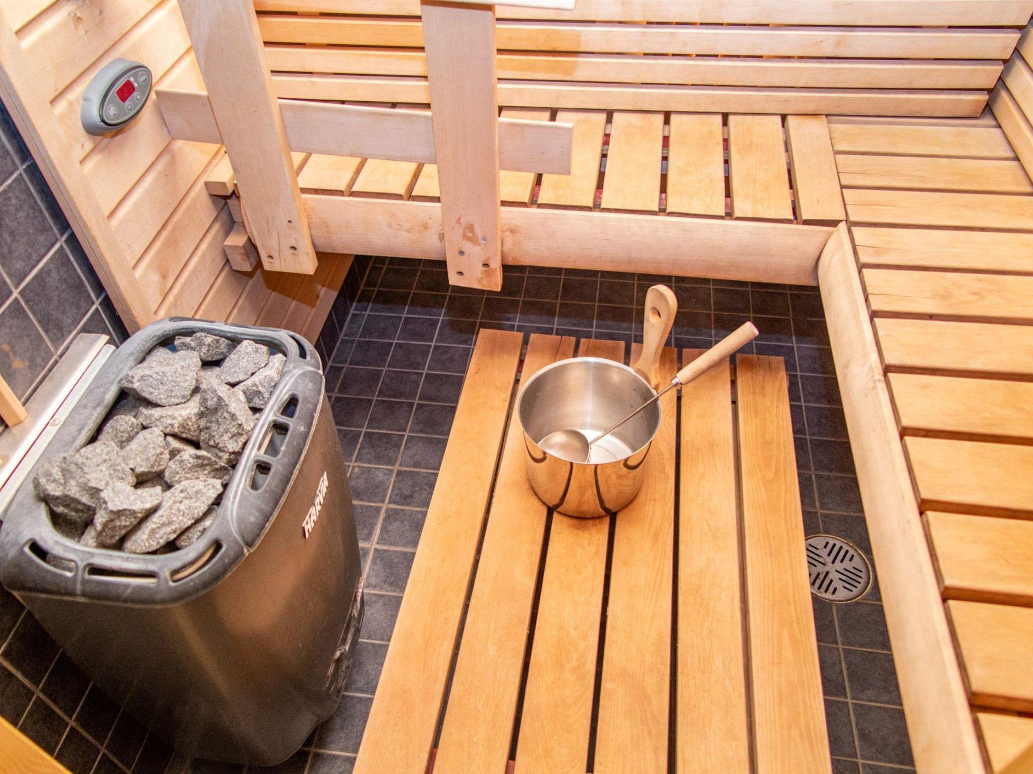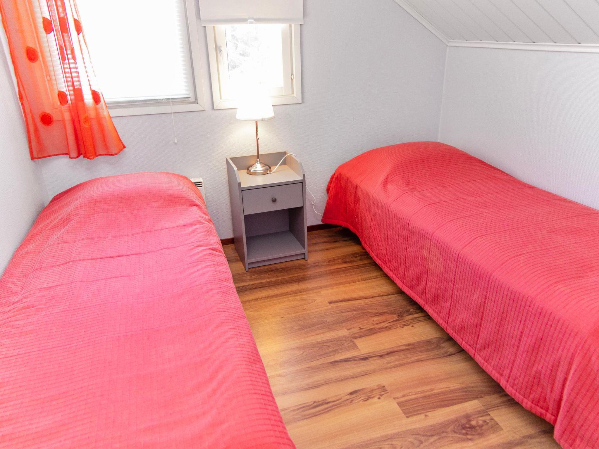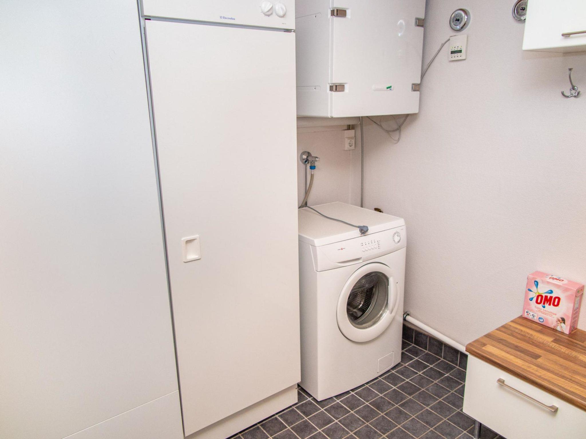 Wooden apartment from 2006, on the middle floor a kitchen, a bedroom with a double bed, an entrance hall, a separate toilet and a terrace. Upstairs, a hall and 2 bedrooms with 2 beds each. Downstairs is a laundry room, a fireplace room with a sofa bed for 2, a utility room, a sauna (electric stove) and a terrace. Air source heat pump, which also has cooling.