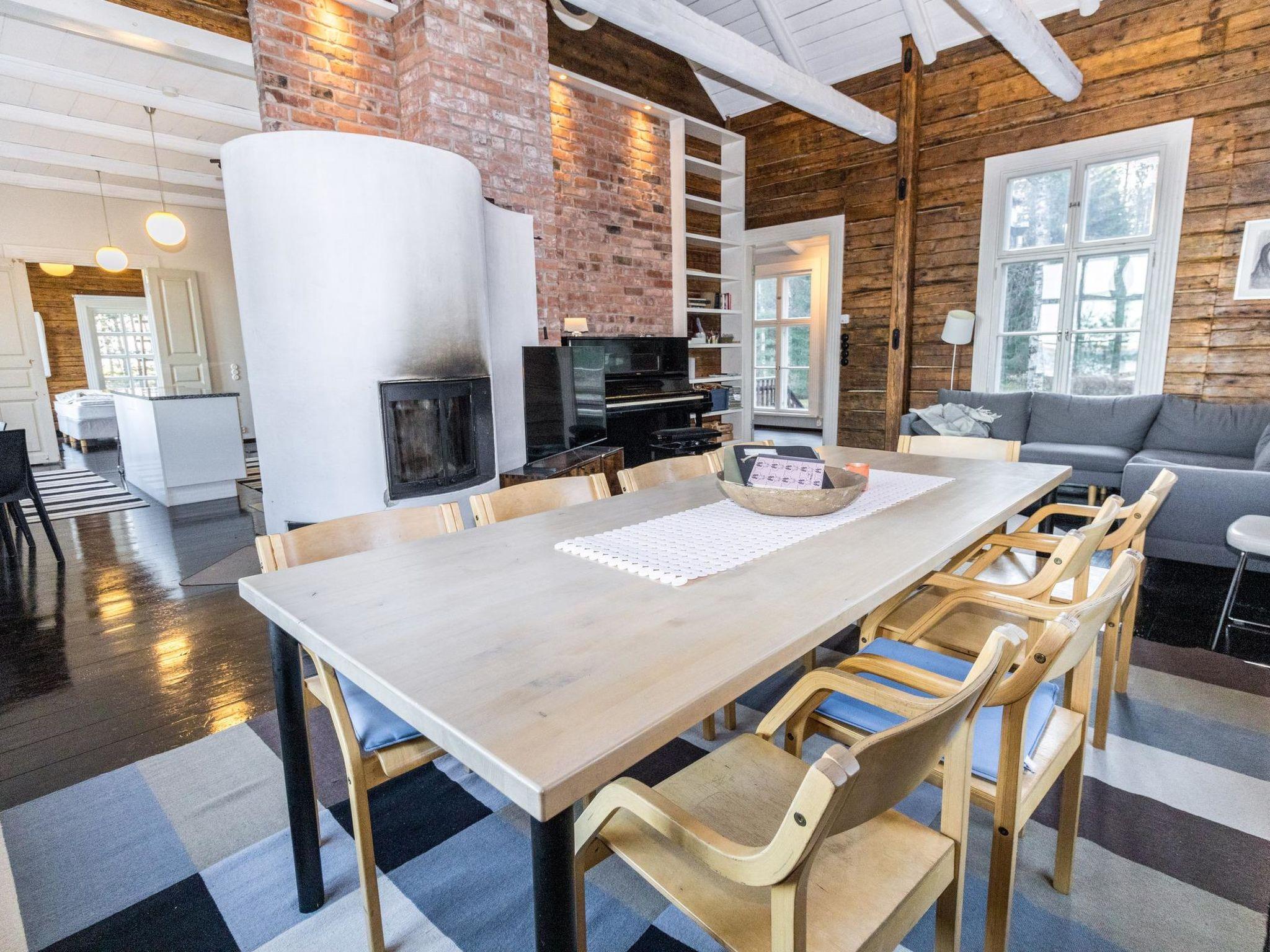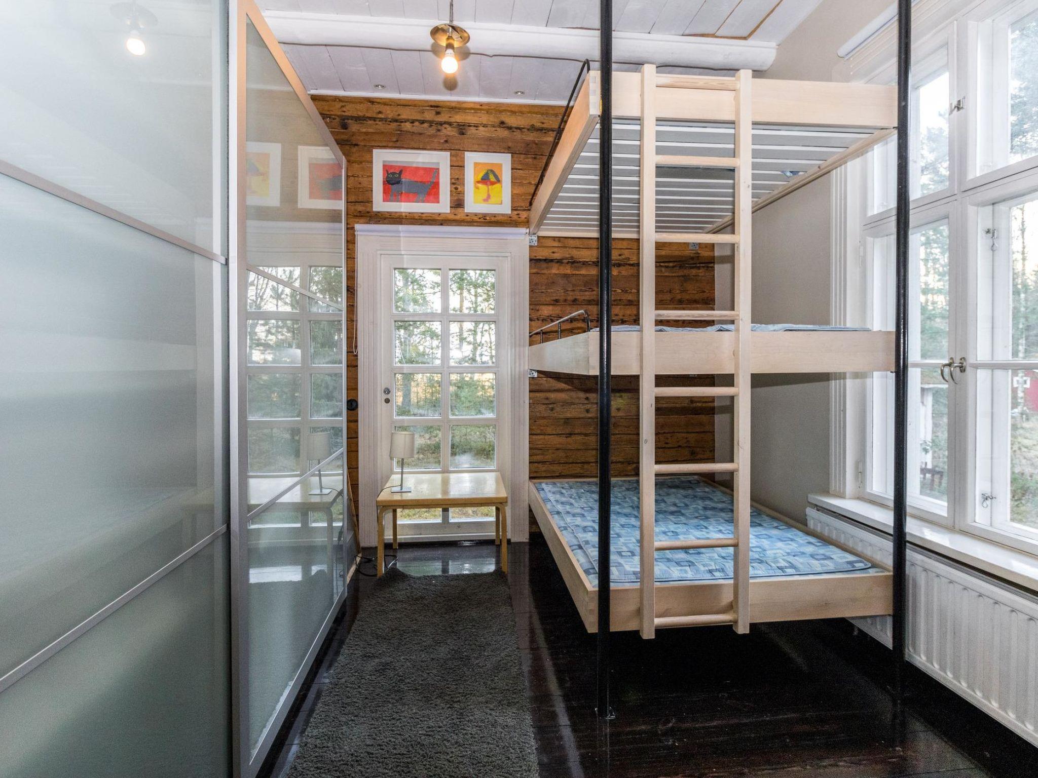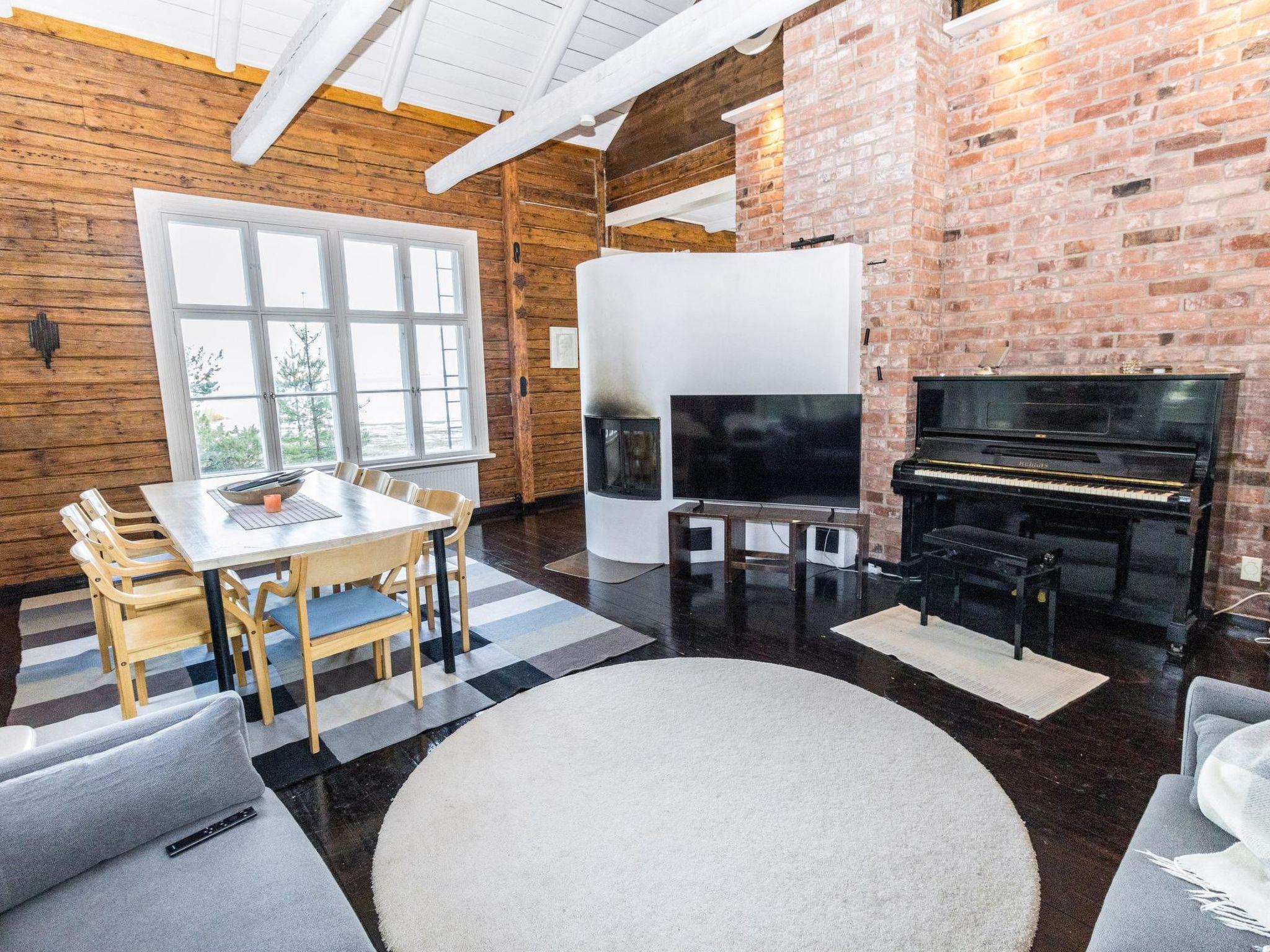 13 km south-west of Oulu, Bothnian Bay/Kempeleenlahti area 50 m, shallow shore, hard sand bottom, no boat. Log chalet, log house built in 1890 and moved to present location in 2009, equipped with modern conveniences, large living room, kitchen, bedroom double bed (width 180 cm), bedroom bunk with three levels (width 120 cm), 2 movable extra beds (mattresses) for children, sauna (electric stove), washroom, separate WC, glazed veranda. Chalet has geothermal heating and wireless 4G internet (Wifi) connection. Extra equipment includes wood-fired range-type stove, and piano. Fireplace is ‘open’ on two sides. Rented only for families or adult couples, not for youth groups.