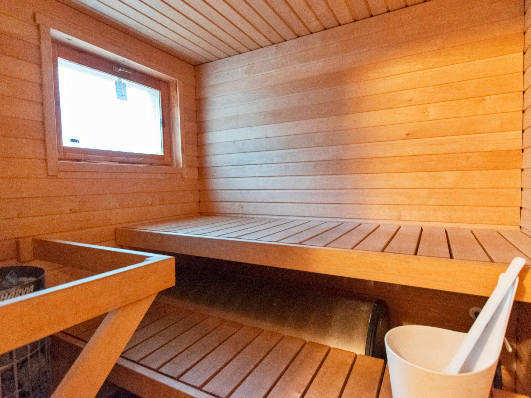 Log panel semi-detached house with living room/kitchen, downstairs bedroom with 140 cm wide double bed, toilet, washroom and sauna (electric stove), loft with 4 beds, open porch.