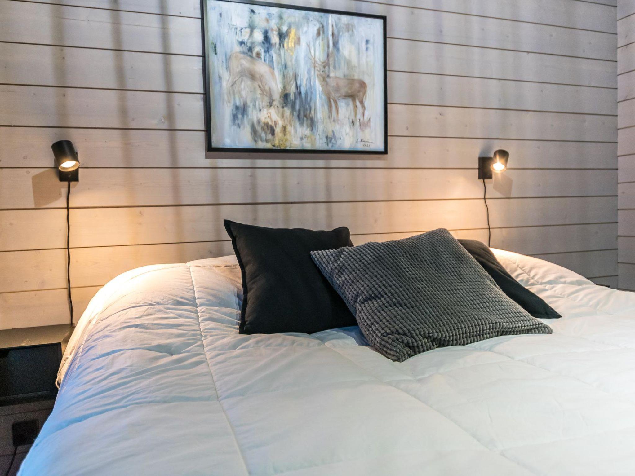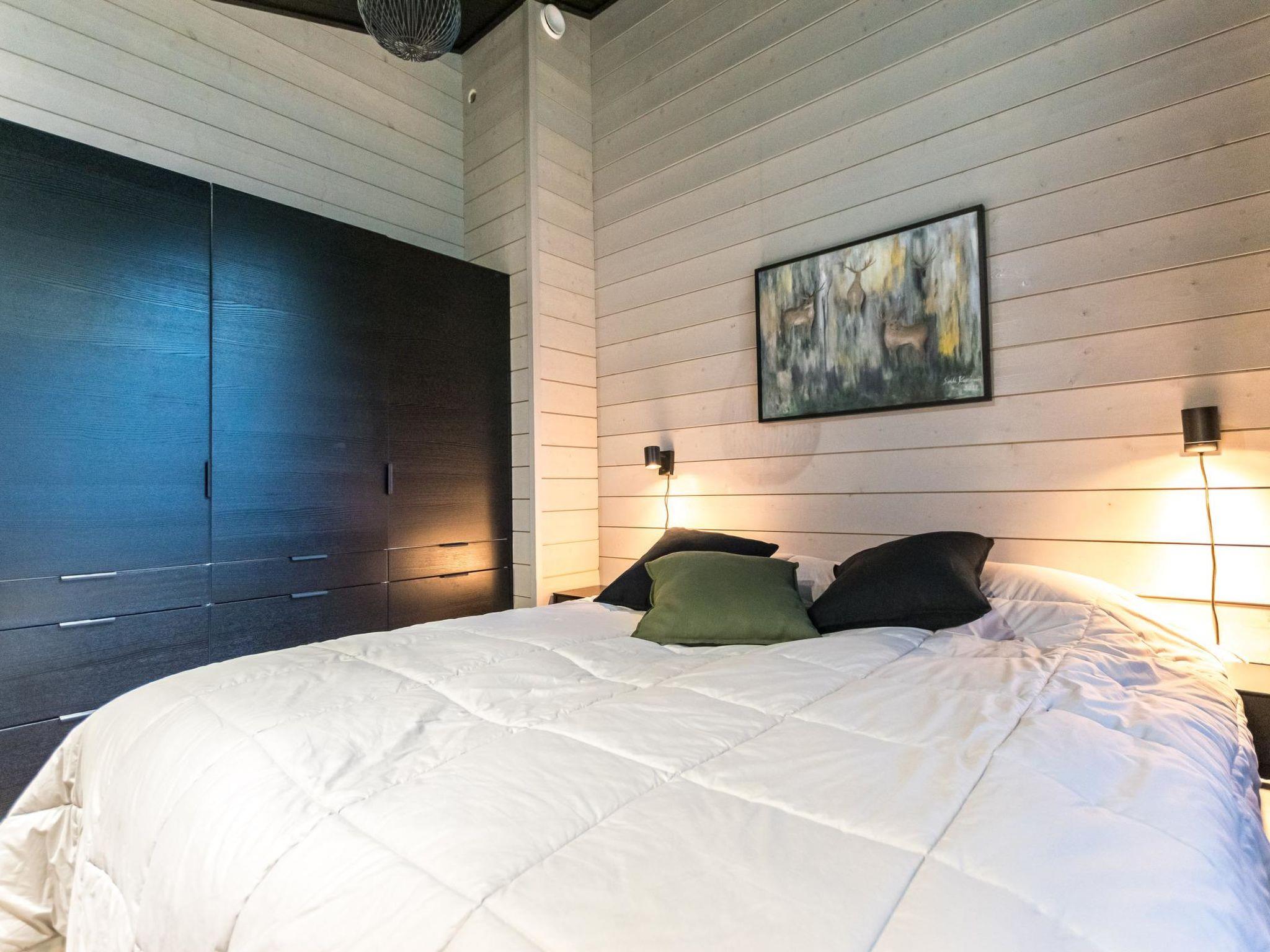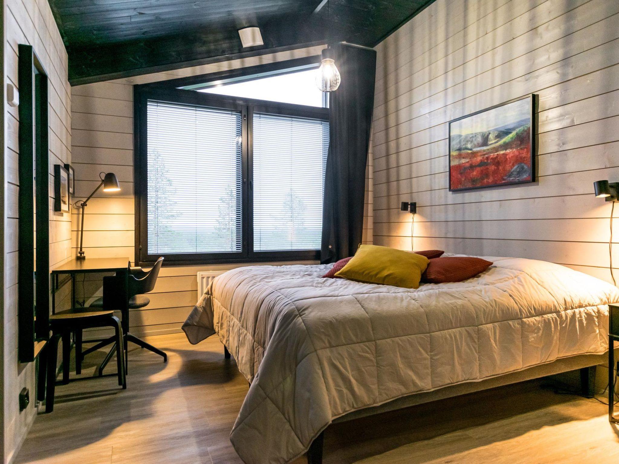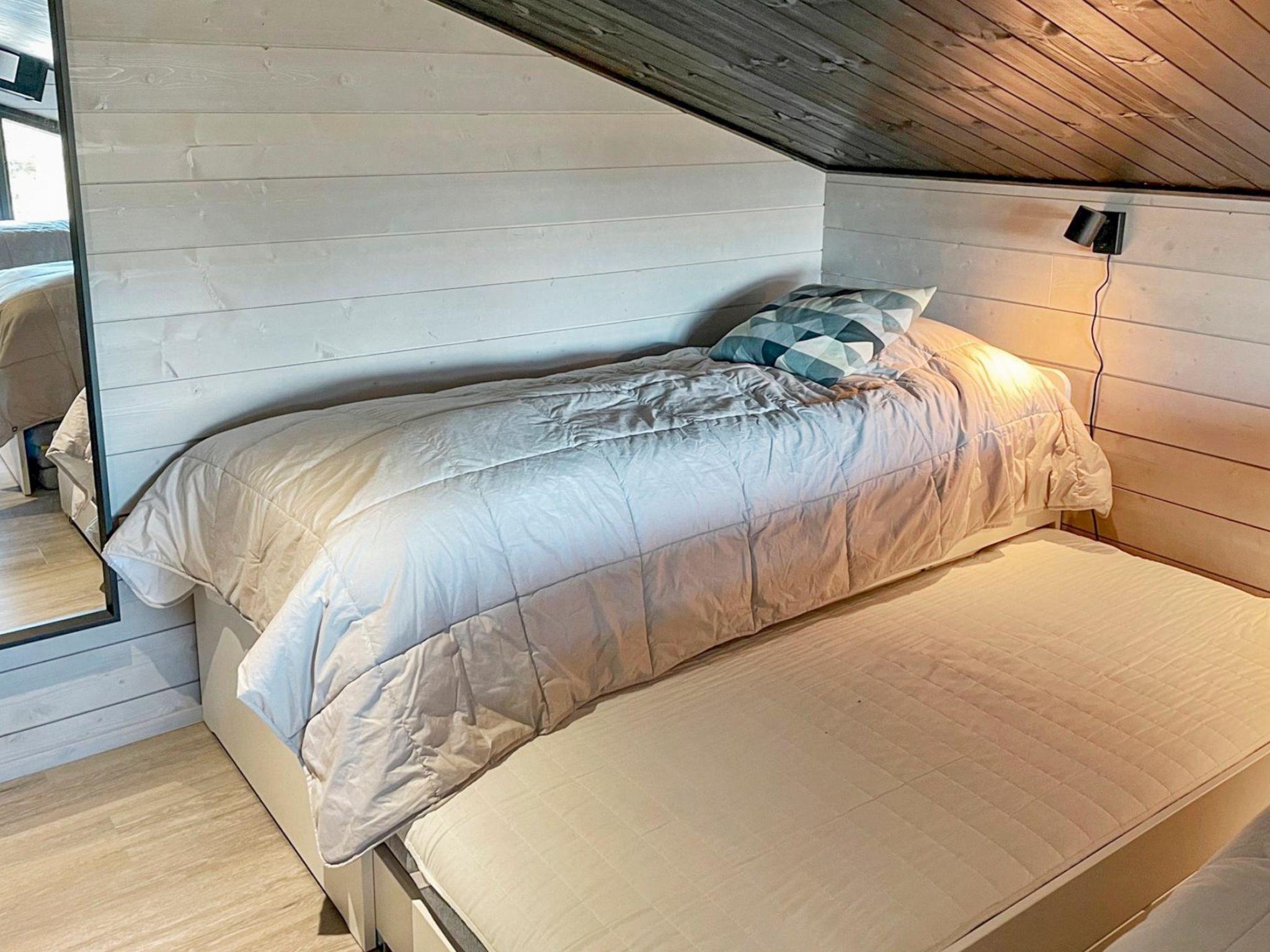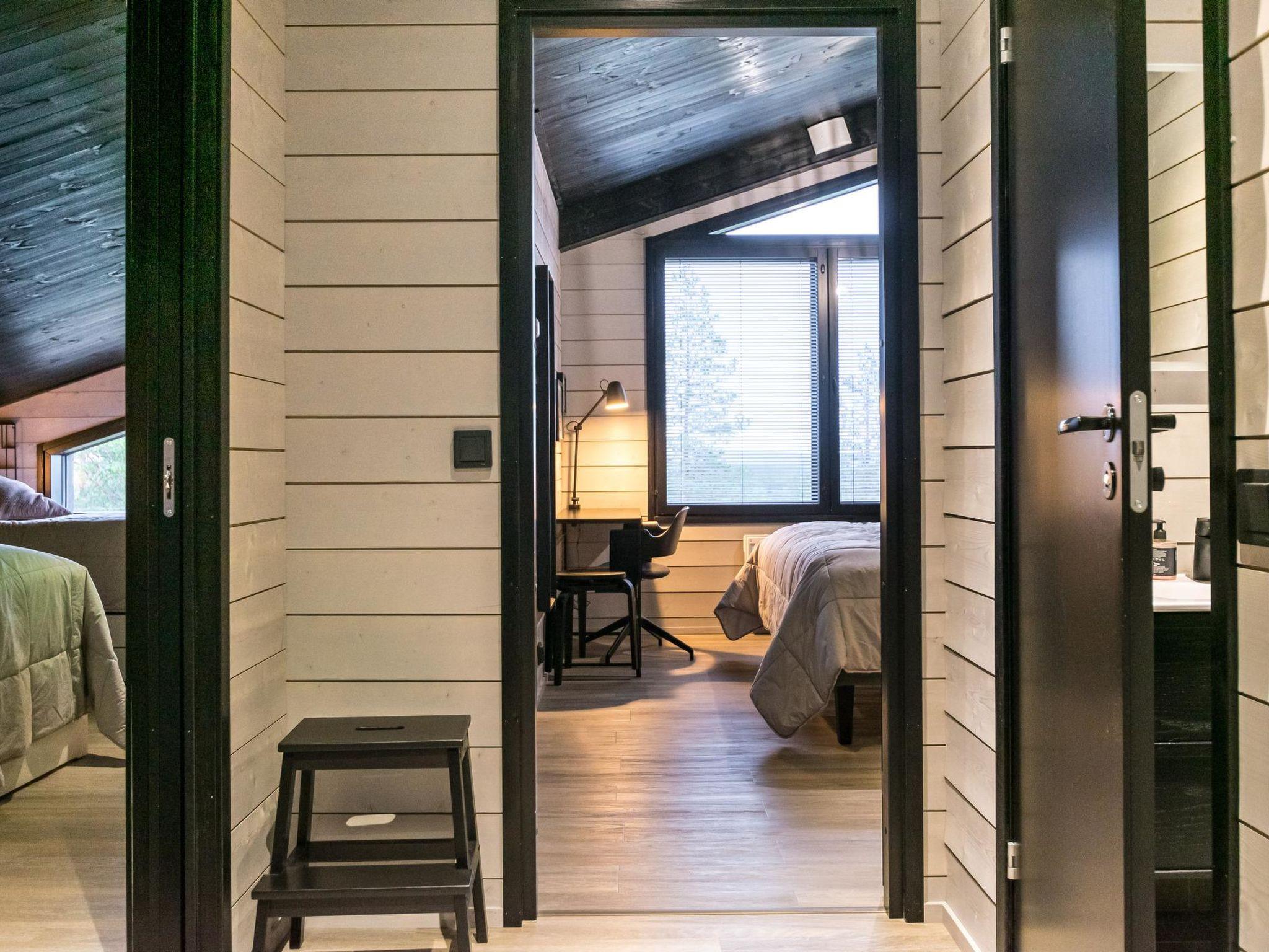 4 bedrooms, 3 rooms with double beds and 1 room with 3 single beds 90 cm. Working desks in 2 bedrooms. 2 x wc, sauna, washroom with double showers and a changing room. Big terrace 30m². Air conditioner heat pumps in both upstairs and downstairs. The cabin also has a fireplace and electric grill.