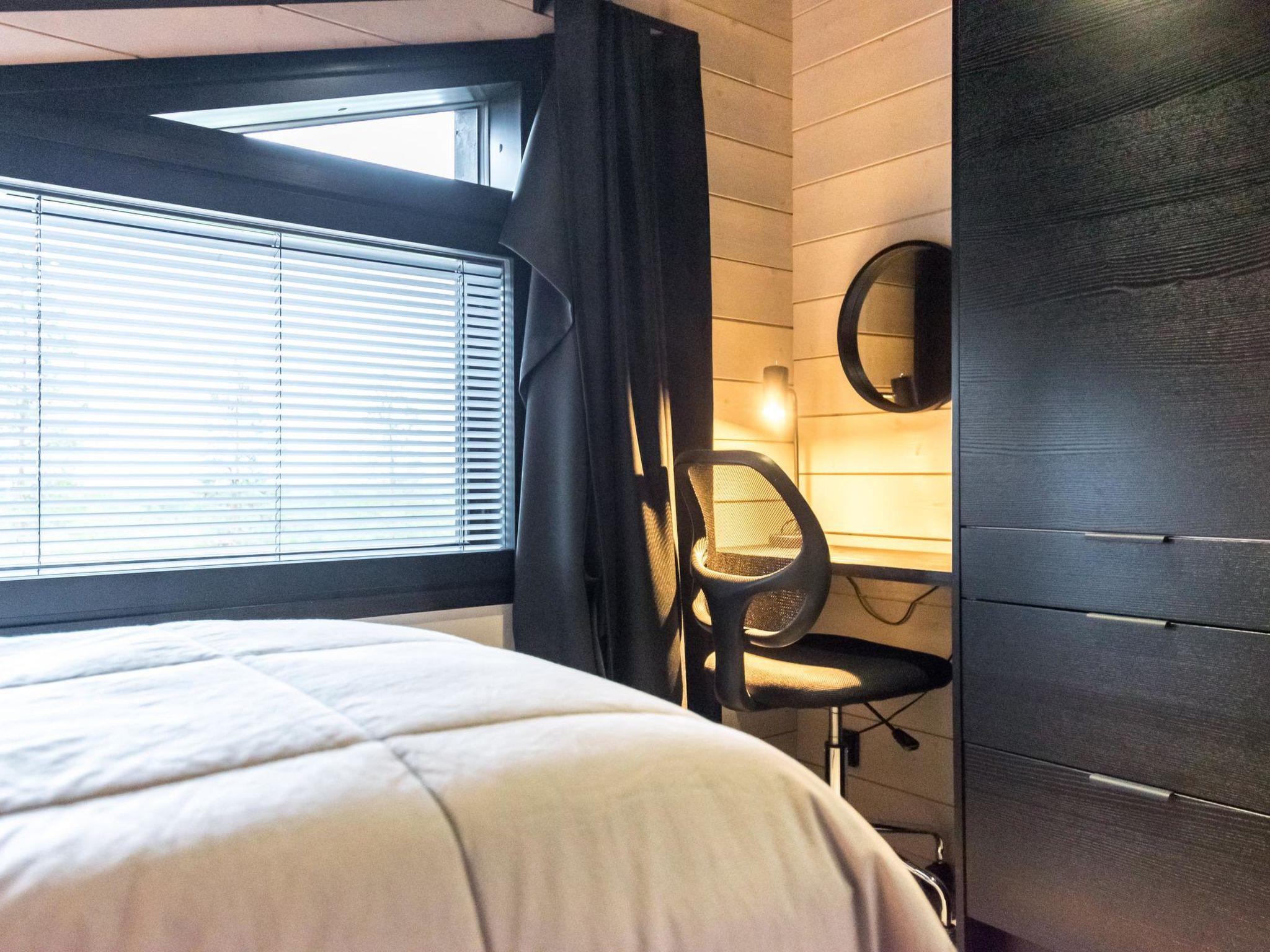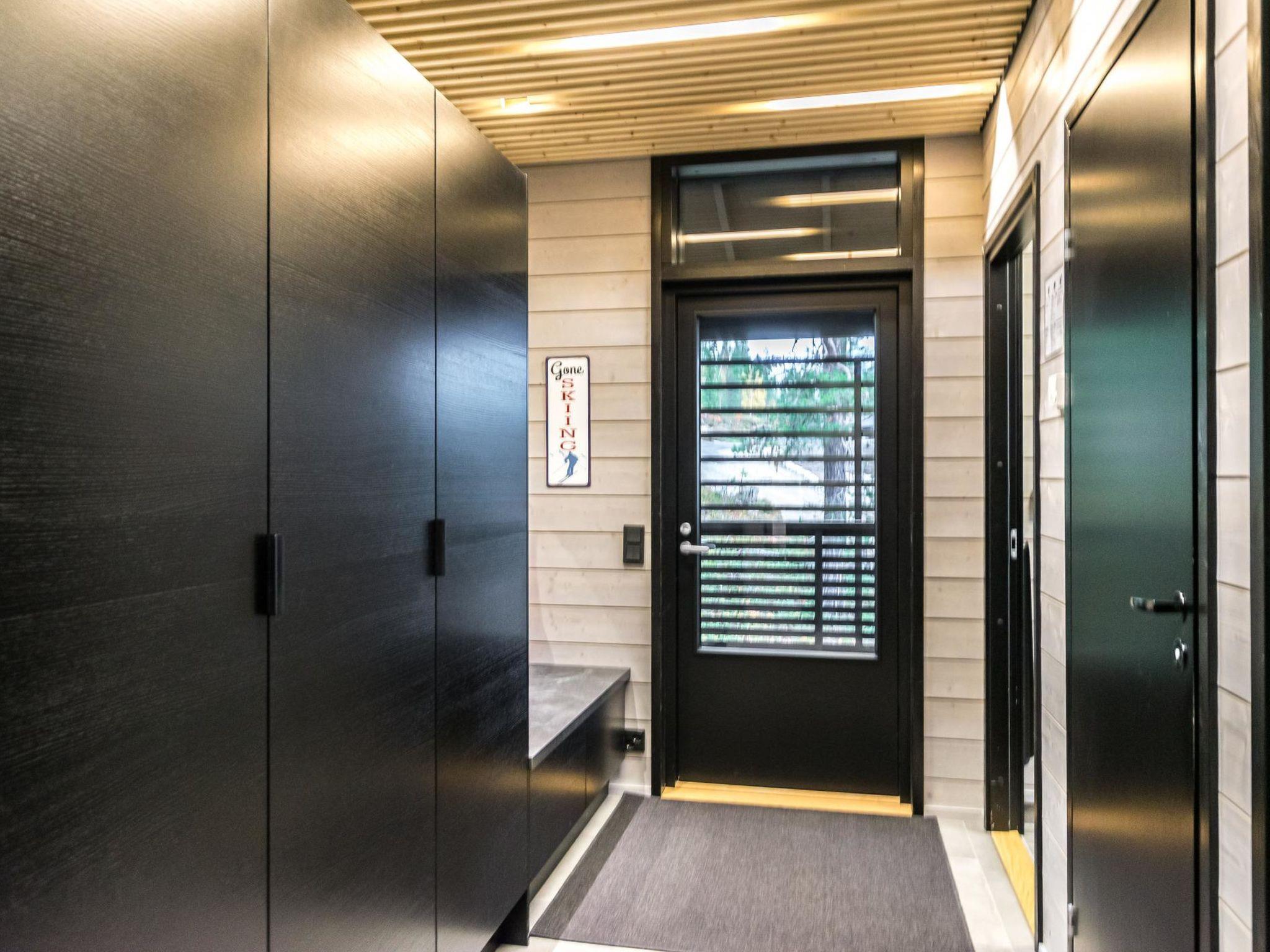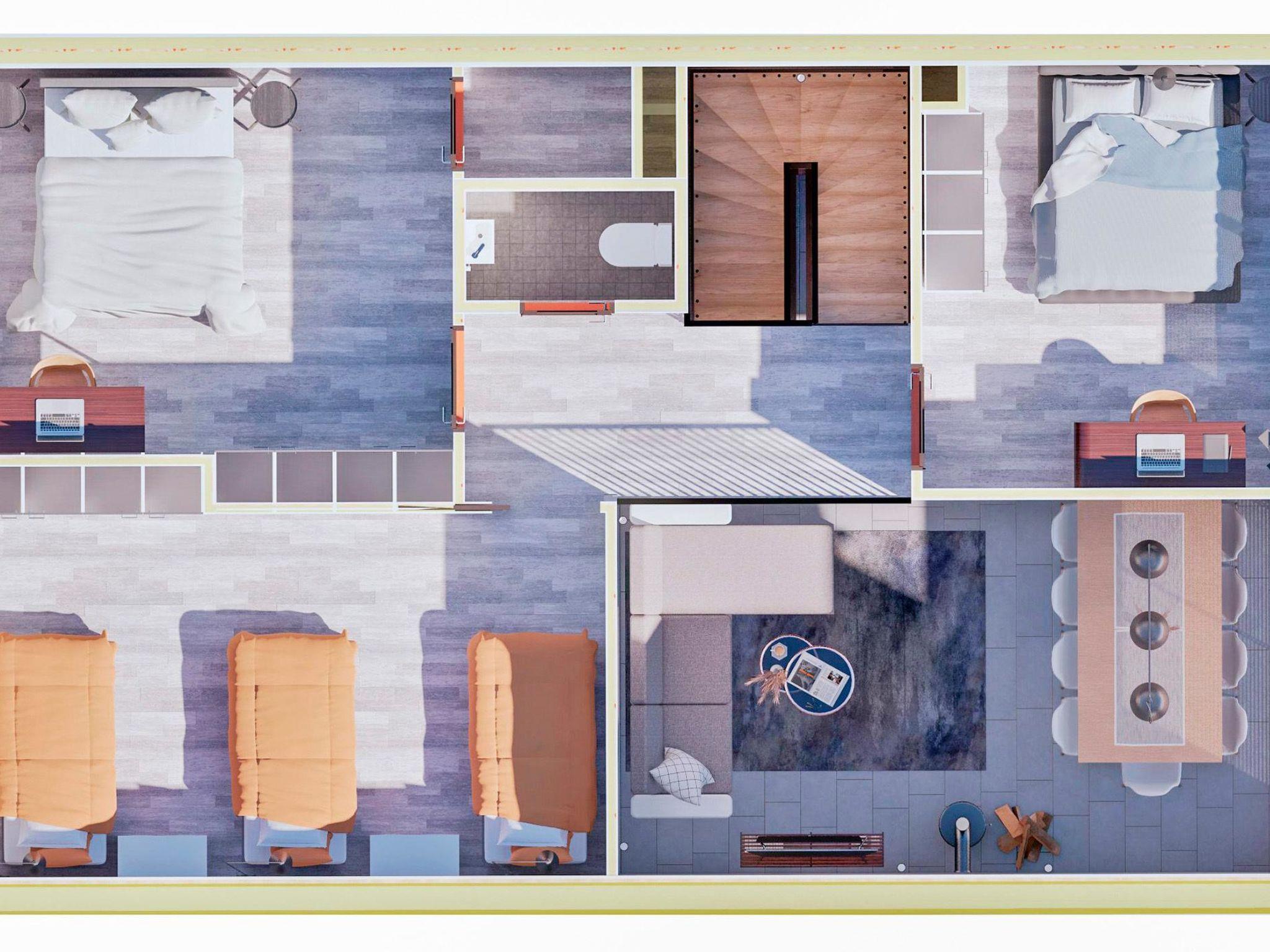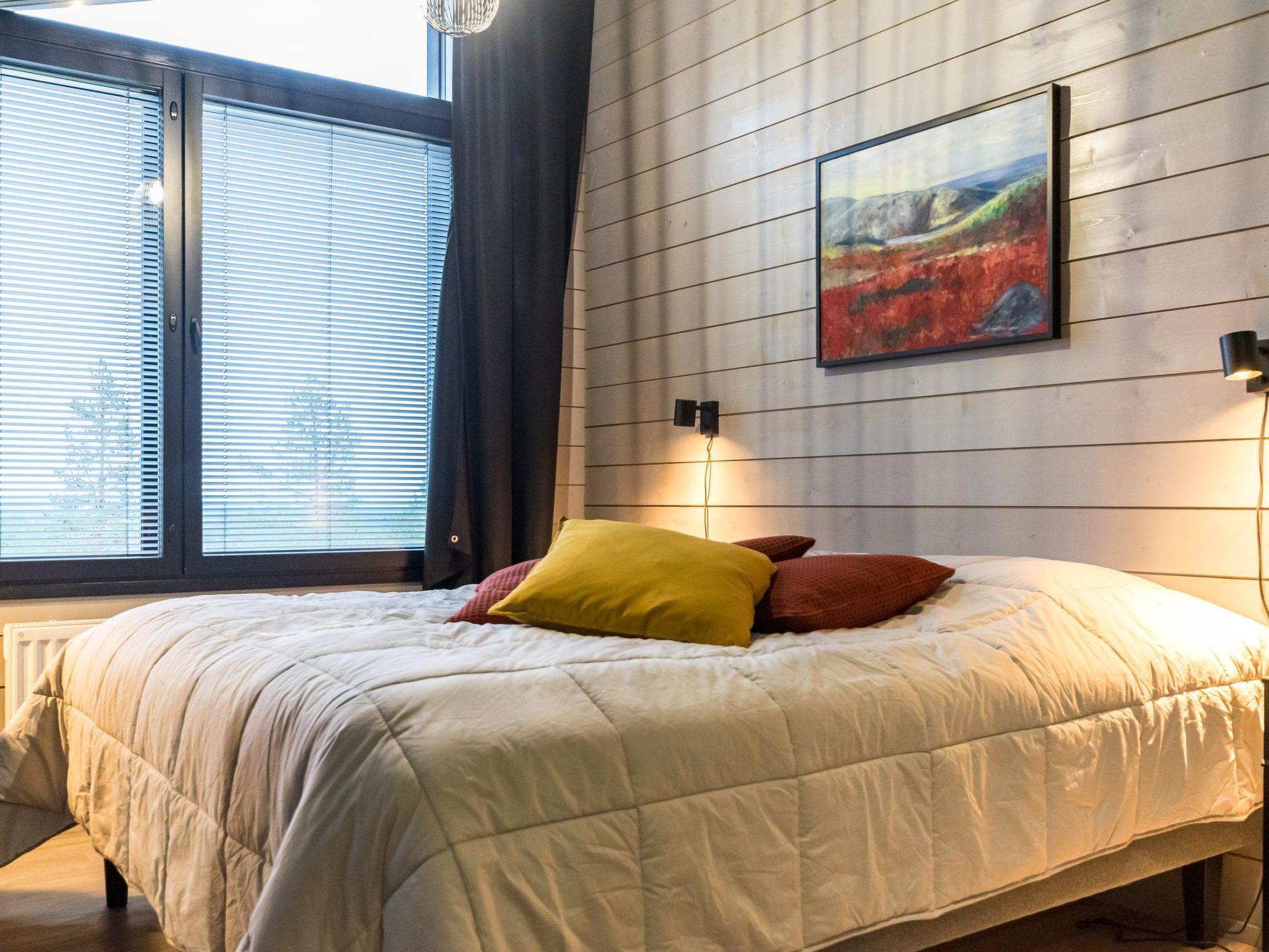 4 bedrooms, 3 rooms with double beds and 1 room with 3 single beds 90 cm. Working desks in 2 bedrooms. 2 x wc, sauna, washroom with double showers and a changing room. Big terrace 30m². Air conditioner heat pumps in both upstairs and downstairs. The cabin also has a fireplace and electric grill.