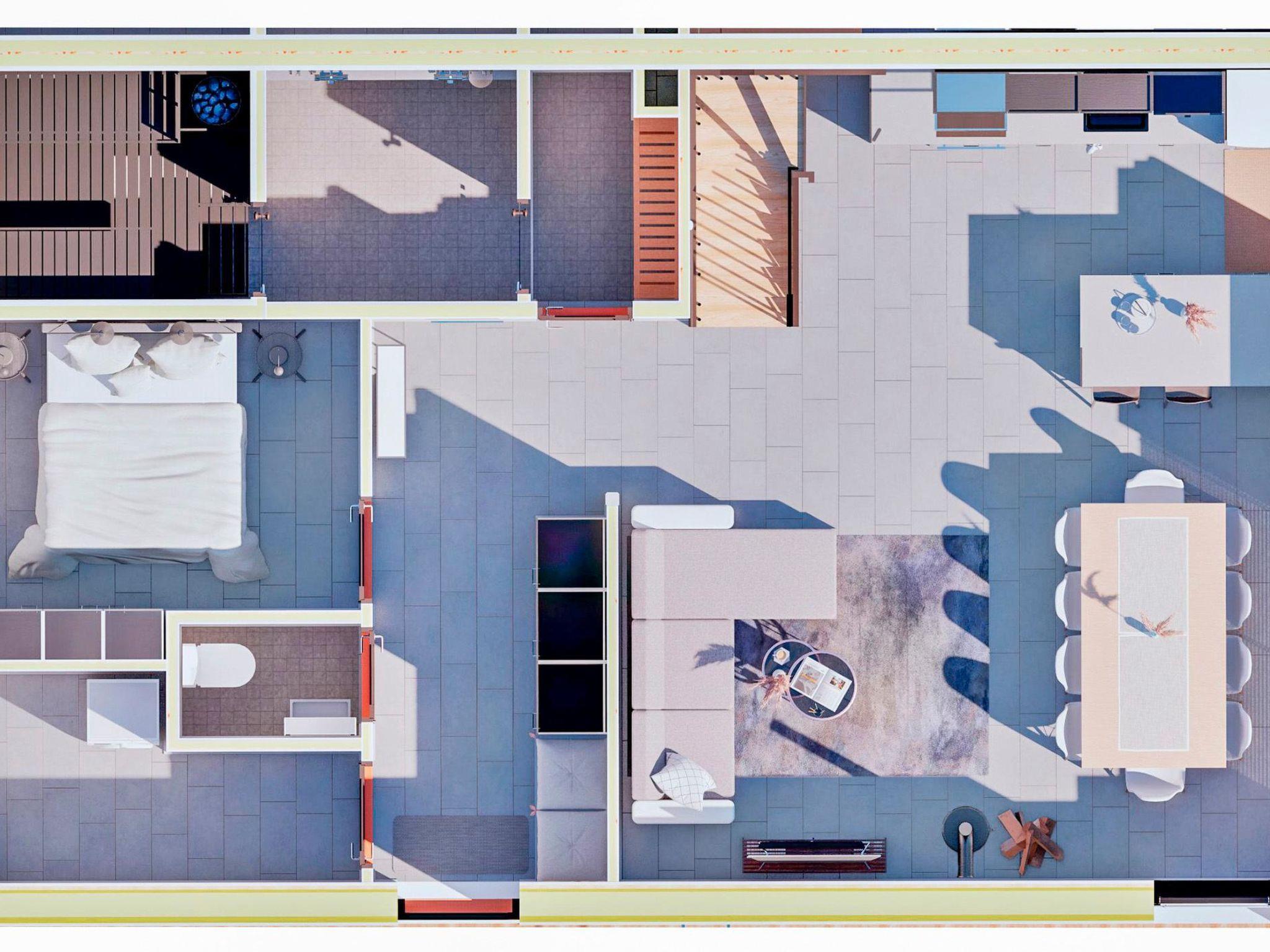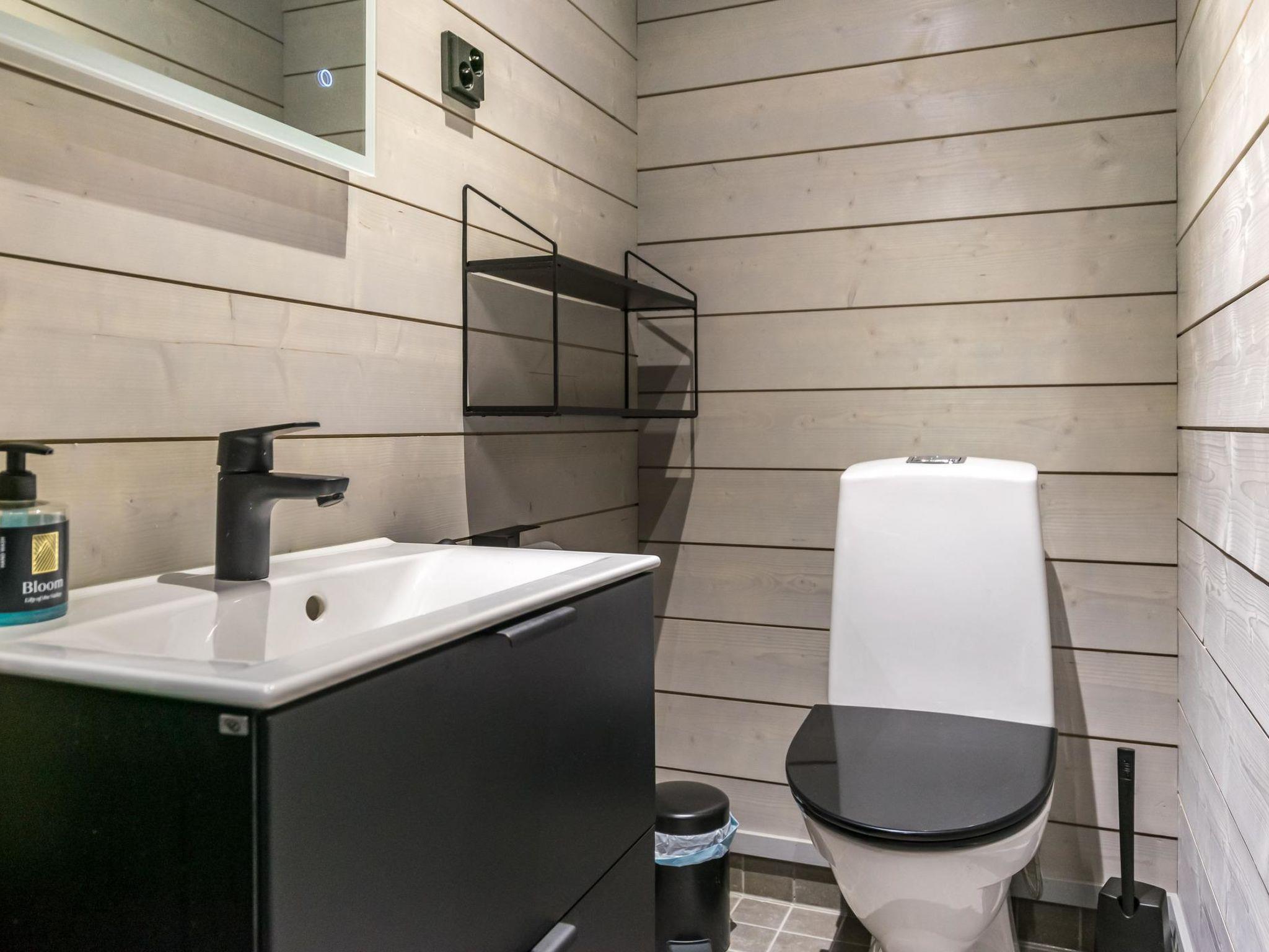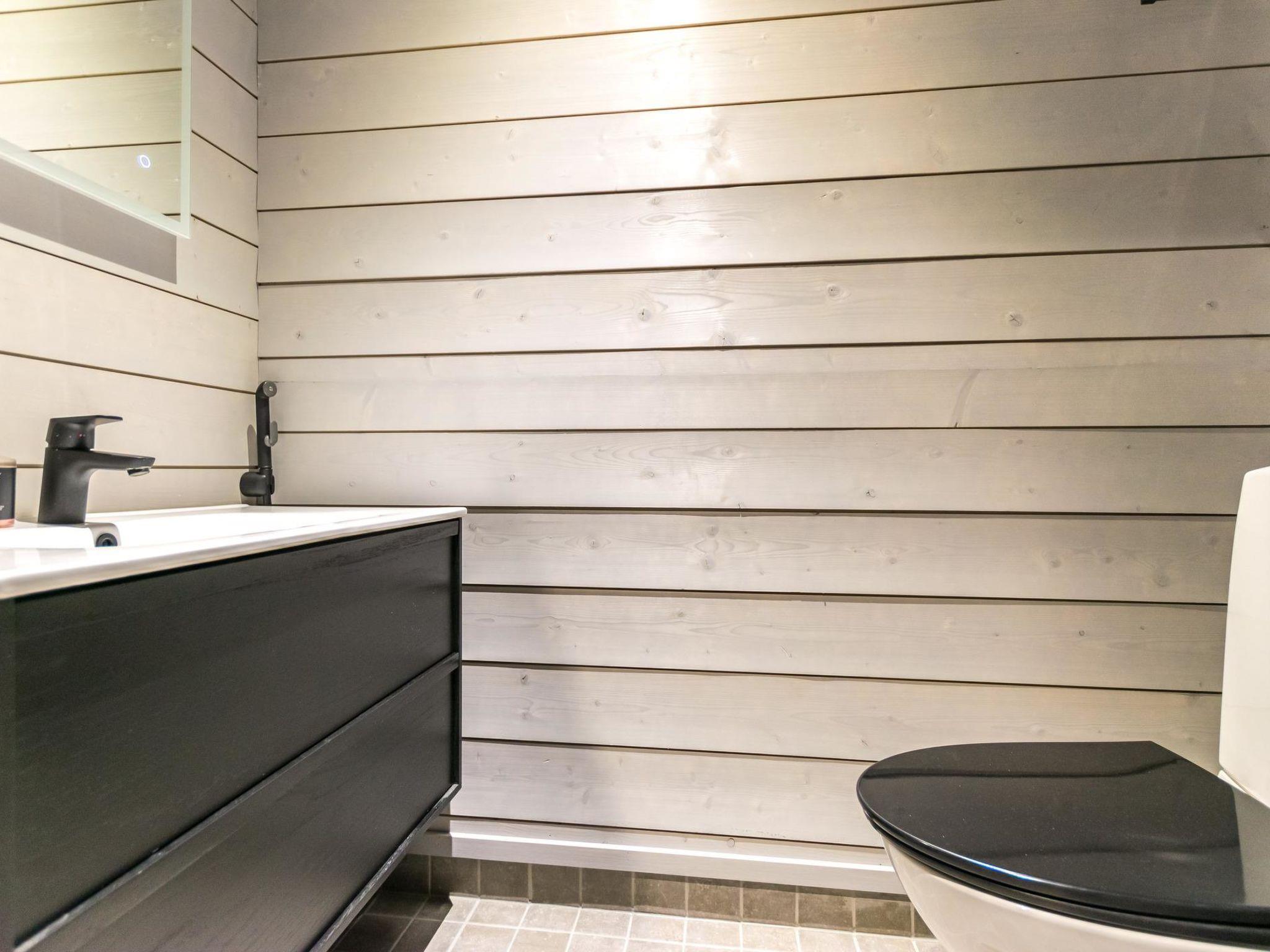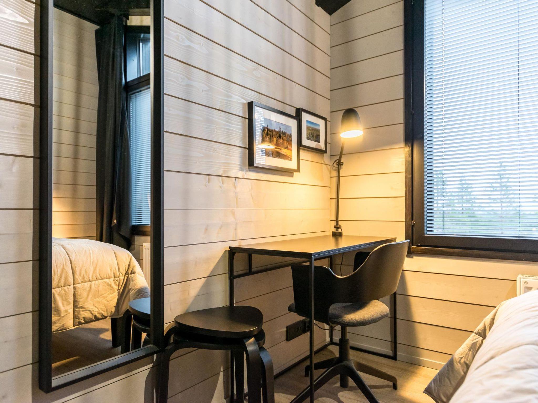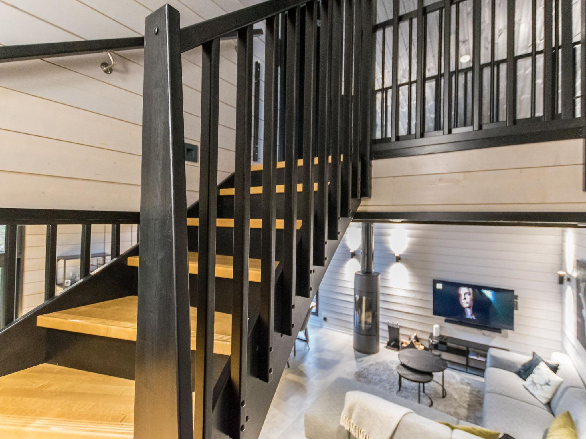 4 bedrooms, 3 rooms with double beds and 1 room with 3 single beds 90 cm. Working desks in 2 bedrooms. 2 x wc, sauna, washroom with double showers and a changing room. Big terrace 30m². Air conditioner heat pumps in both upstairs and downstairs. The cabin also has a fireplace and electric grill.