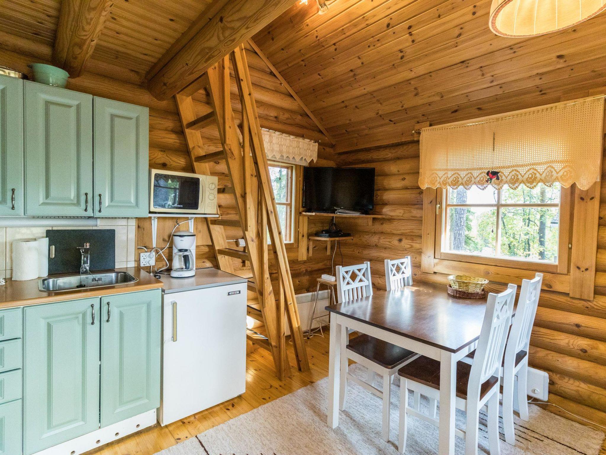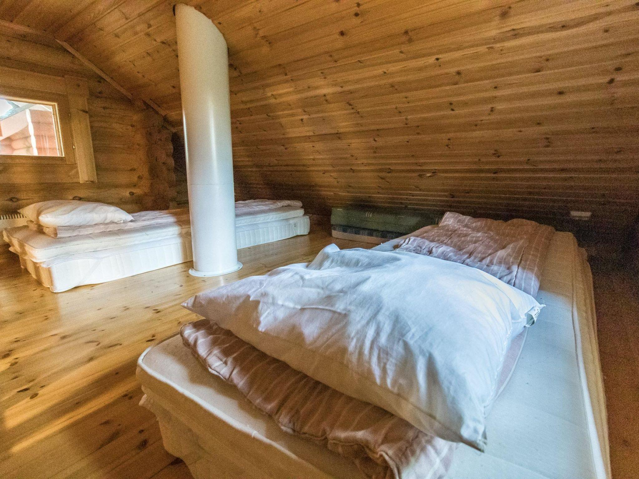 44 km north from Kemijärvi, round log cabin built in 2003. Downstairs kitchen/living room, alcove with 120cm wide bed, toilet, bathroom and sauna. Shallow loft with 2 mattresses. Steep stairs to the loft.