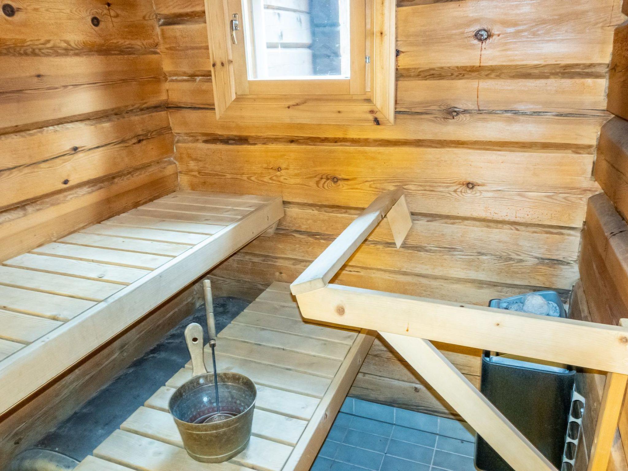 Living room, kitchenette, double bed in the bedroom (width 140 cm), 4 beds in the loft, sauna, washroom/WC and storage room.