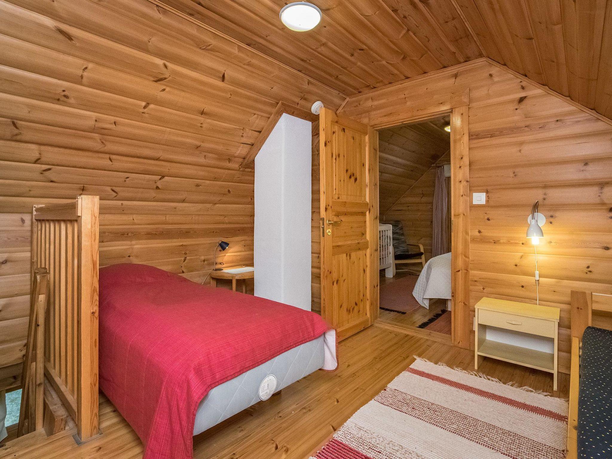56 km south of Savonlinna. Lake Saimaa 25 m, shallow water, firm gravel bottom. Own boat. Log cabin 1989, living room/kitchen with 2 extra beds, washroom, sauna (electric sauna stove), foyer, open veranda. Upstairs: bedroom 2 beds, vestibul with 1 bed (+ cot), balcony (steep stairs to upstairs). Lakeside sauna.