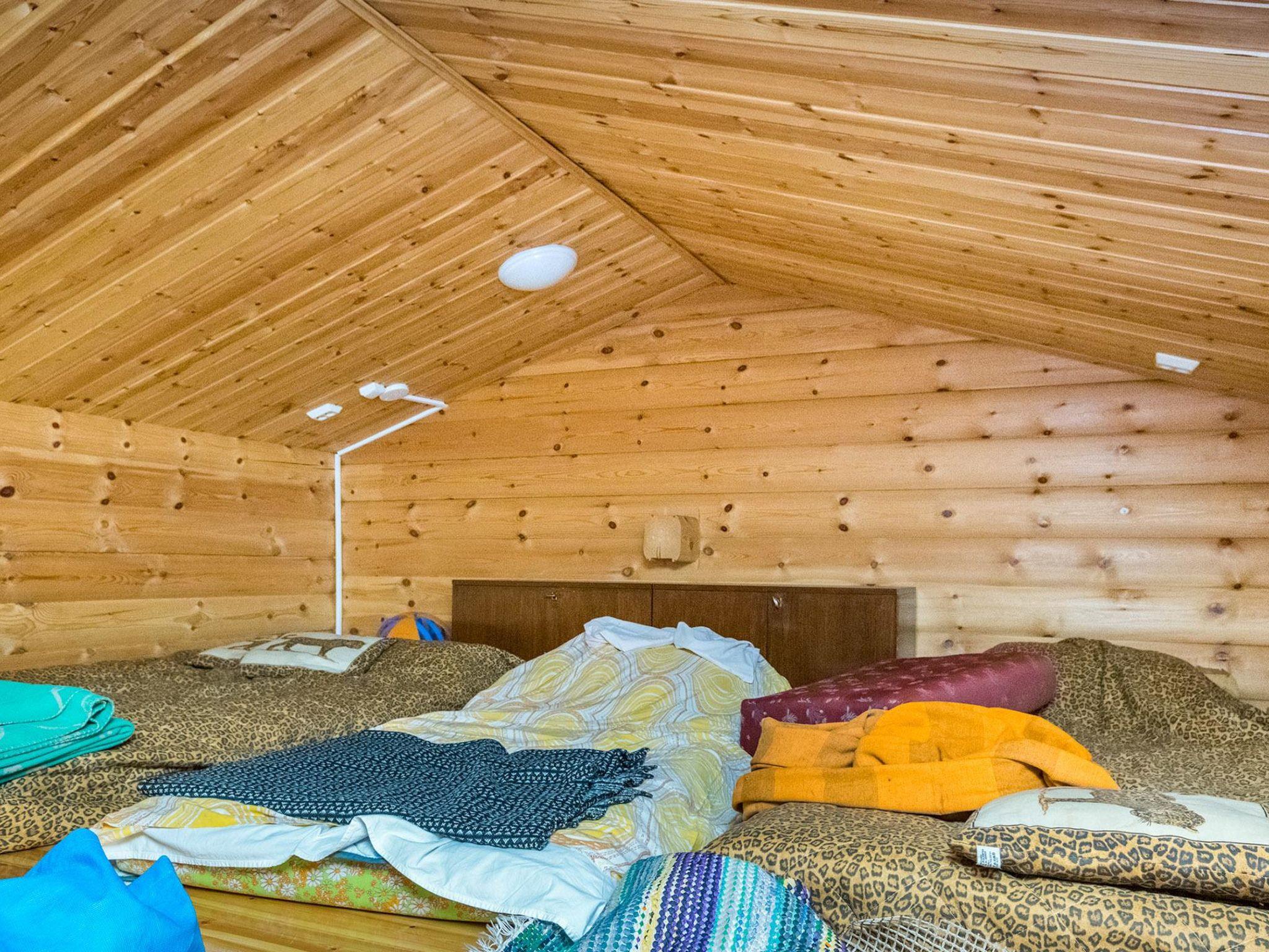 Log cabin 2002, living room, kitchenette, bedroom (10 m²) double bed, bedroom (9 m²) 120 cm bed, loft above kitchen (steep stairs) with two mattresses, washroom with WC and shower cubicle, sauna, covered porch.