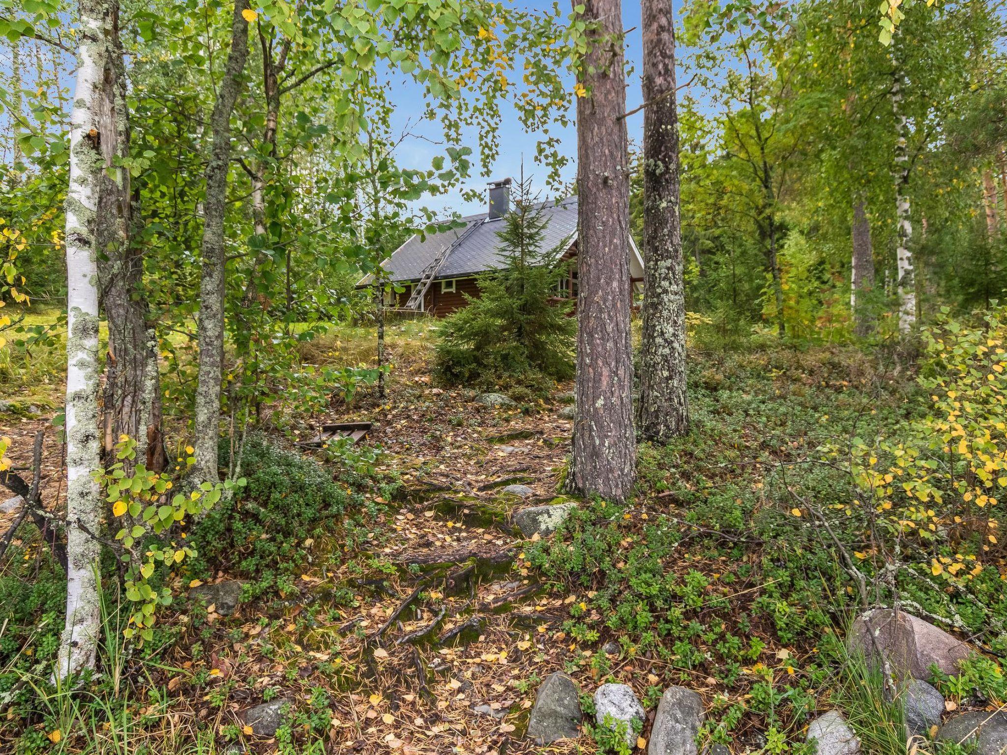Round log-built cabin 1997, living room/kitchen, bedroom (7 m²) on the ground floor has double bed, washroom with shower and WC, sauna with wood-burning sauna stove, covered porch. Loft with two mattresses, balcony.