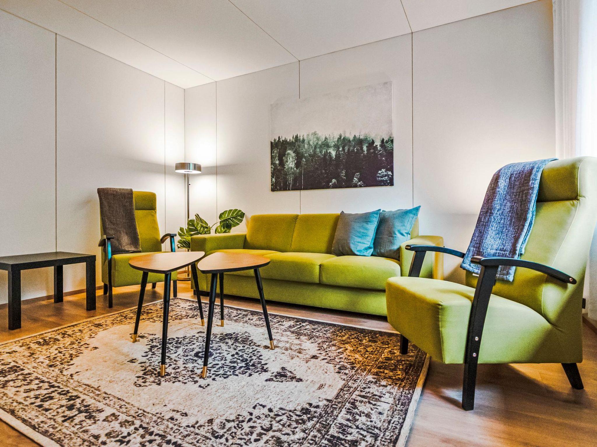 Apartment in wood-built row house, house is built in 1980 and renovated in 2022. Apartment has kitchen, living room, bedroom with 2 beds, washroom with shower, WC and terrace.