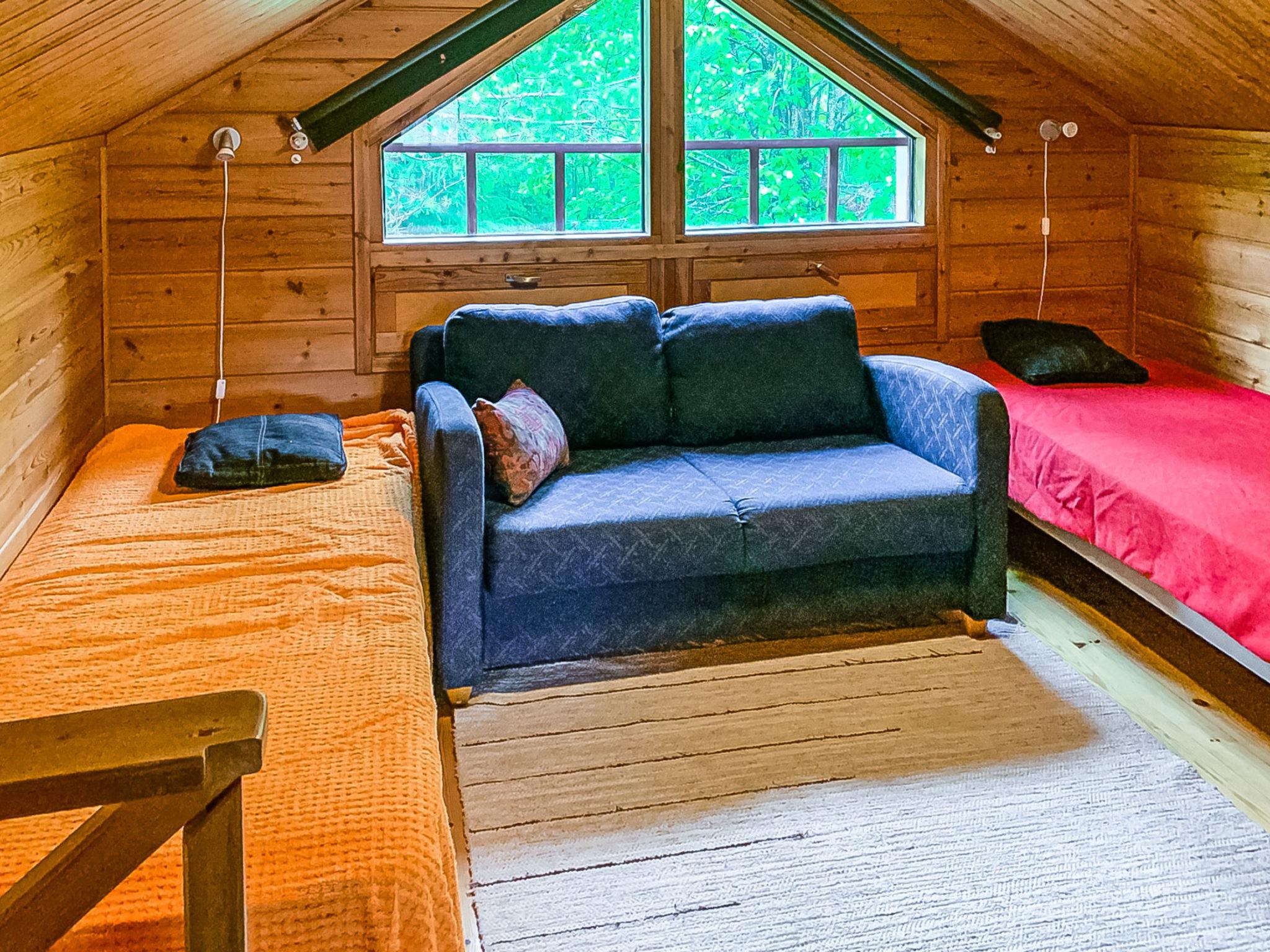 Downstairs living room, kitchen and bedroom with a double bed. Upstairs bedroom with double bed and 1 single bed and an attic with a sofa bed for two persons and a single bed. The sofa bed in the living room can be used as a spare bed. Sauna with adjoined washroom and separate WC. A cot and an infant high chair.Firewood includes in price.