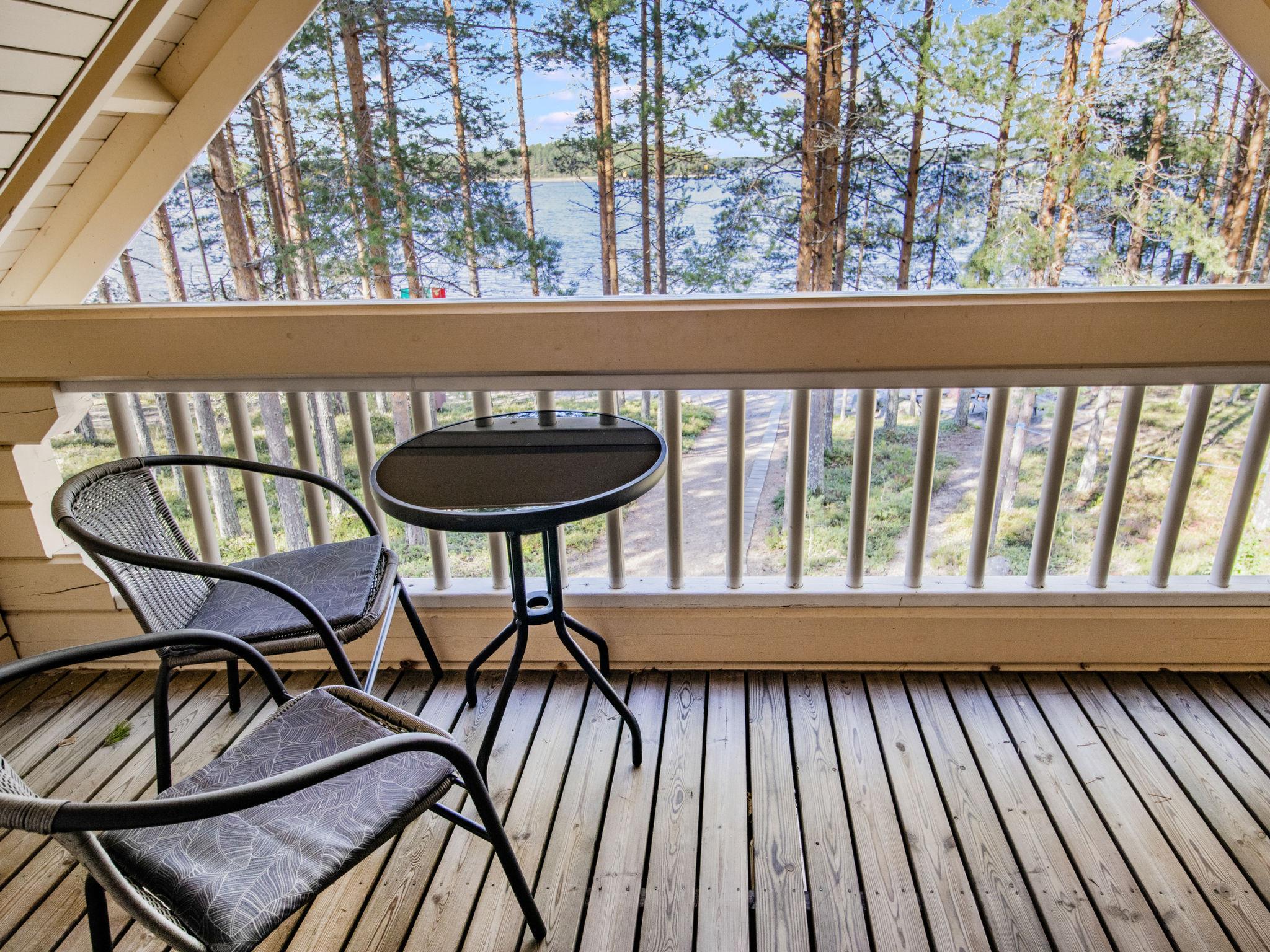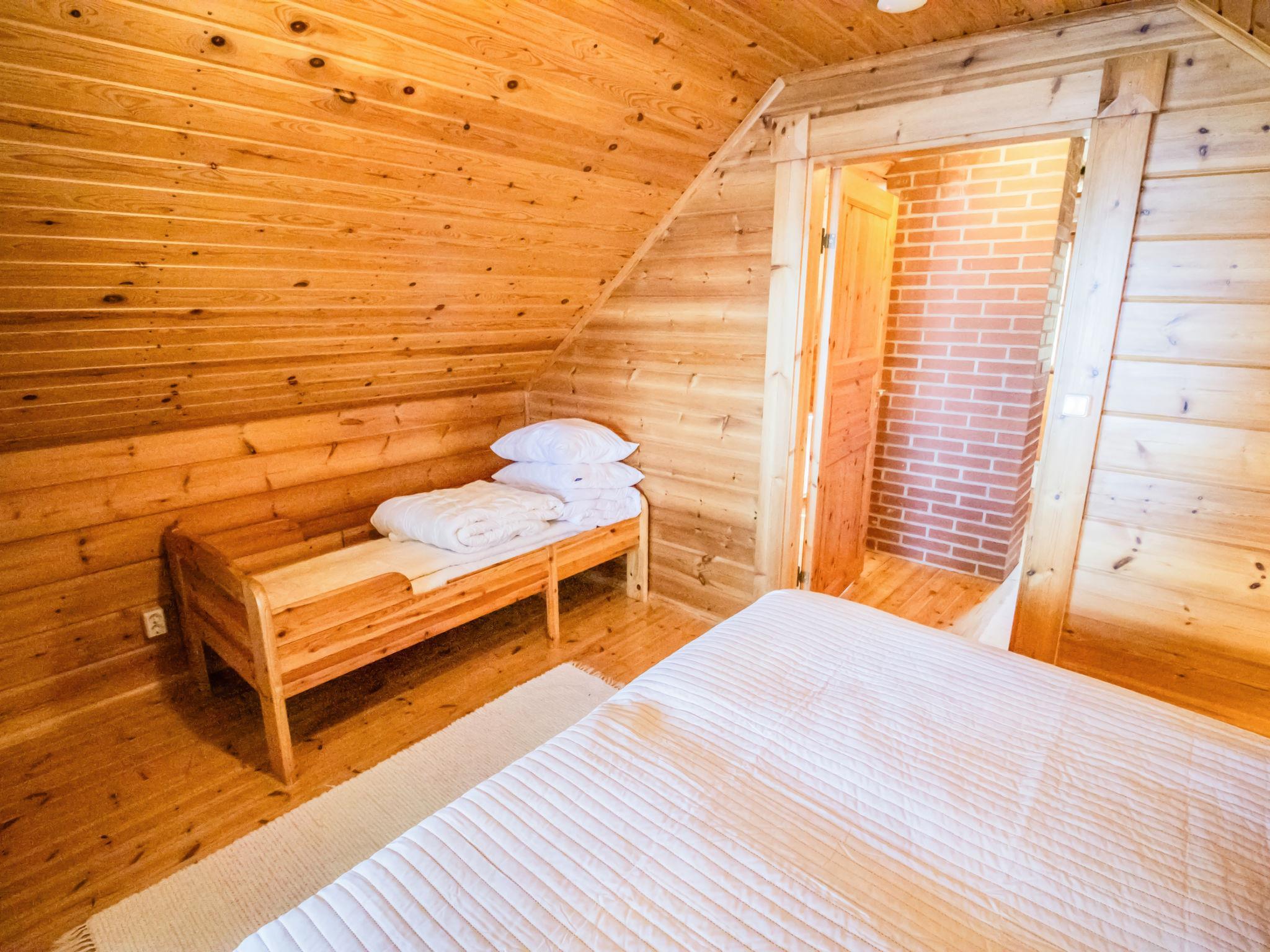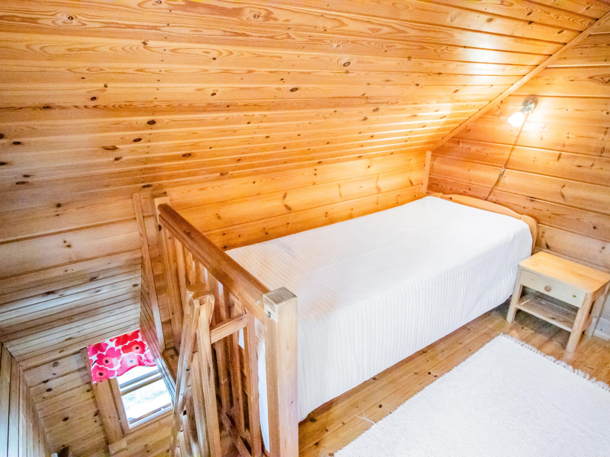 The ground floor features an open-plan kitchen/living area, a separate dressing room with its own entrance and access to a WC, a spacious washroom, and a wood-heated sauna. On the upper floor, there is one bedroom with a double bed, a furnished balcony, and a loft with two single beds. The bedroom also includes a children’s bed. In the living room, a sofa bed provides additional sleeping space if needed.