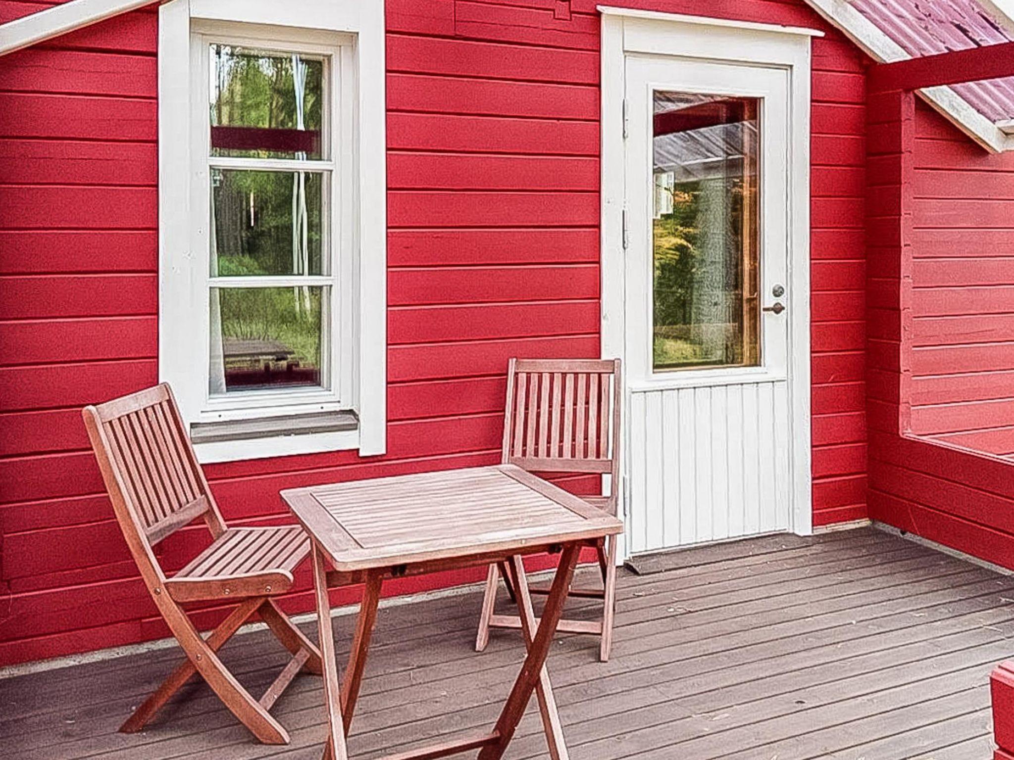 The wood-heated sauna includes a shower, WC, and washing machine in the washroom. The cabin also features a glazed porch with a seating area and a gas grill, as well as a small covered porch with a table and two chairs. A woodshed is located in the yard building.