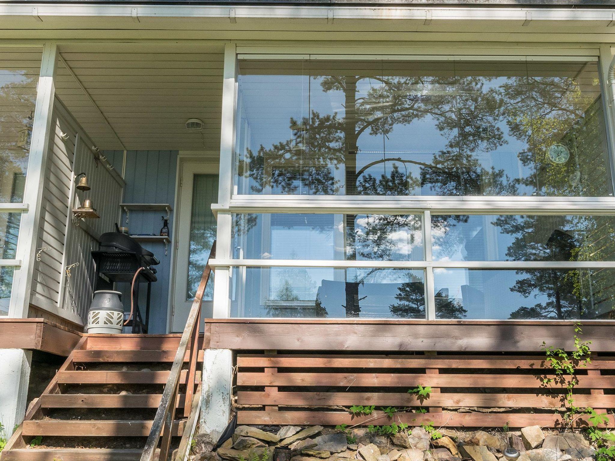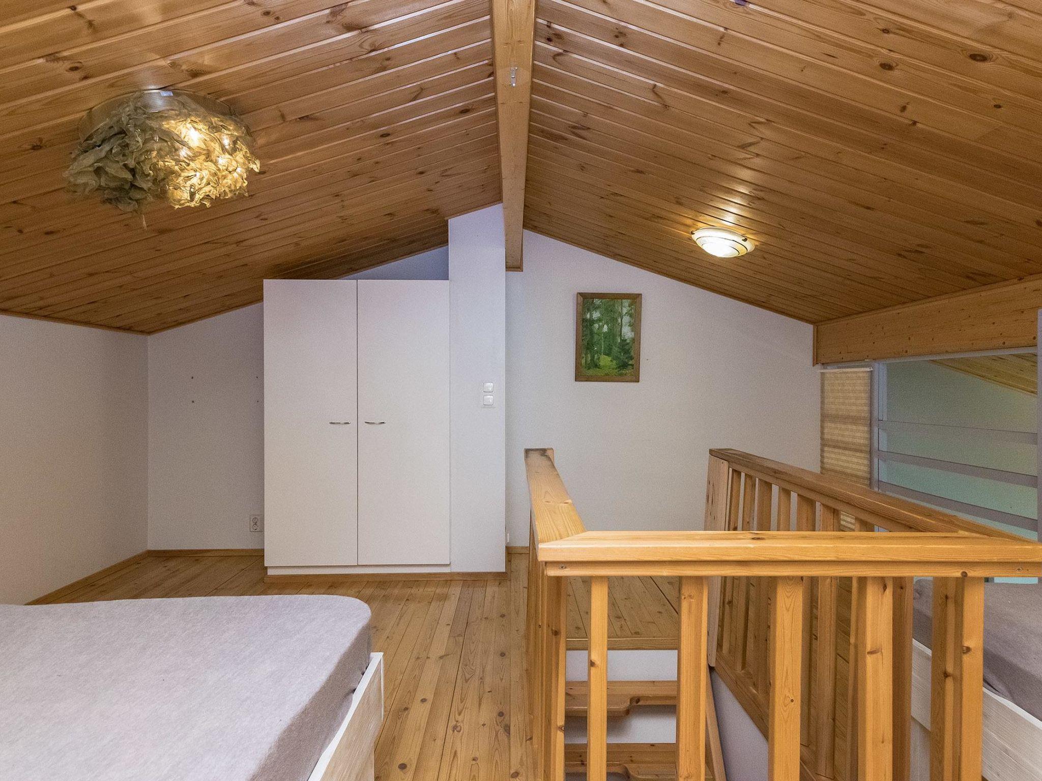 Apartment in a row house (built in 1990), living room with sofa bed for two, kitchenette (renovated in 2012), washroom with WC and shower, electric sauna, glazed terrace. Three beds in the loft, steep stairs lead to the loft.