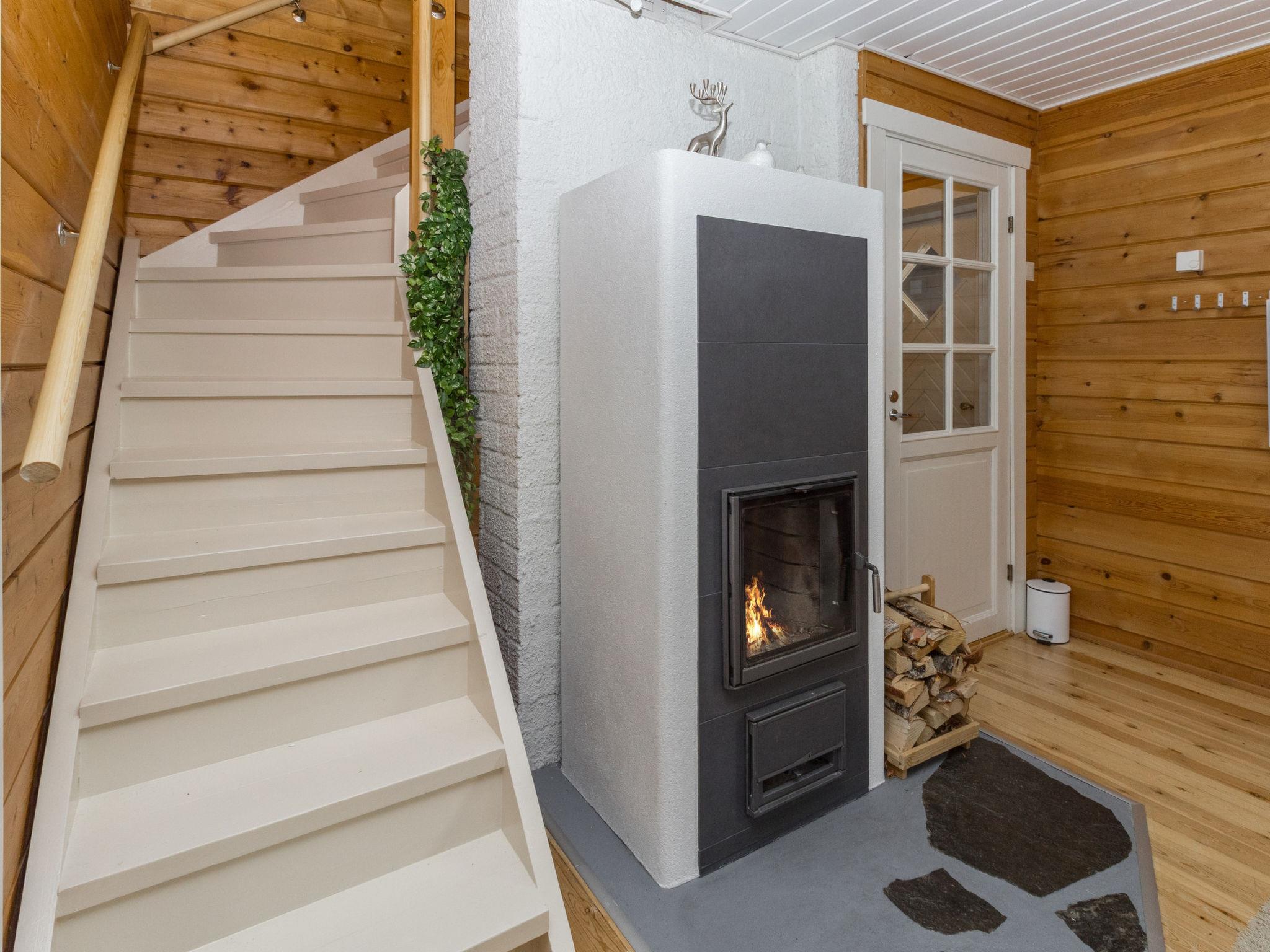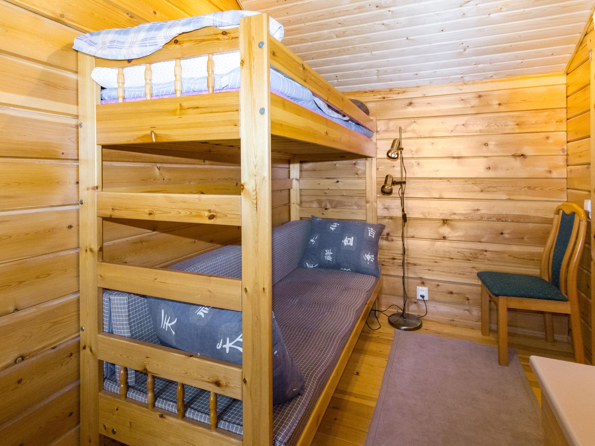 The ground floor features an atmospheric living room with a heat-storing fireplace and a combined kitchen/living room, equipped with a convenient breakfast cabinet. On the same floor, there is also a separate toilet, a bathroom, and a sauna. Upstairs, there are two bedrooms: one with a 160 cm wide double bed and the other with an 80 cm wide bunk bed, which can be extended to 140 cm wide on the lower level.