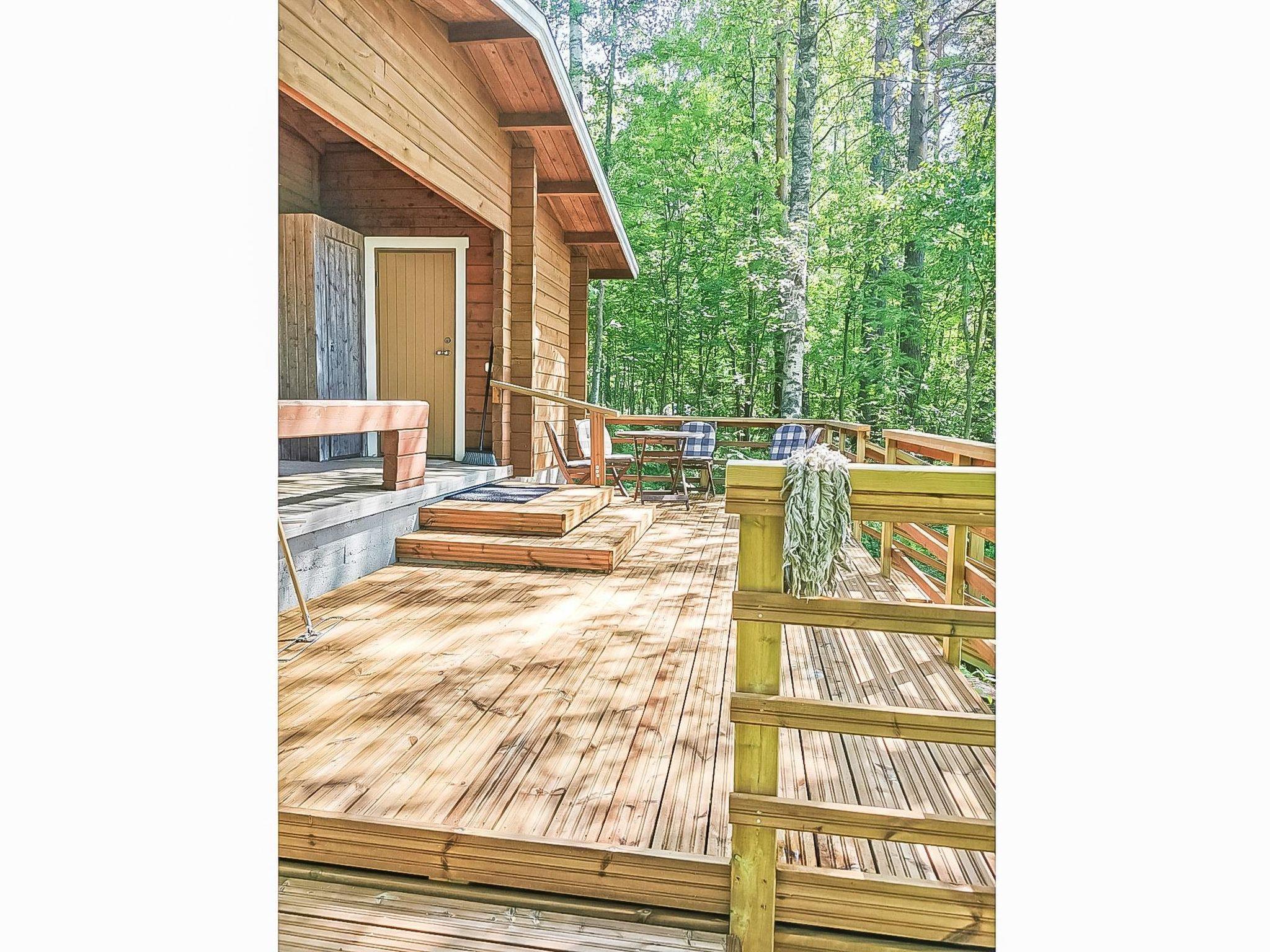 Log house 1983, kitchenette (renovated 2021), 2 bedrooms each with 2 beds, living room with 1 bed, sauna (electric), washroom with toilet and shower, porch. Sauna and washroom renovated 2022.