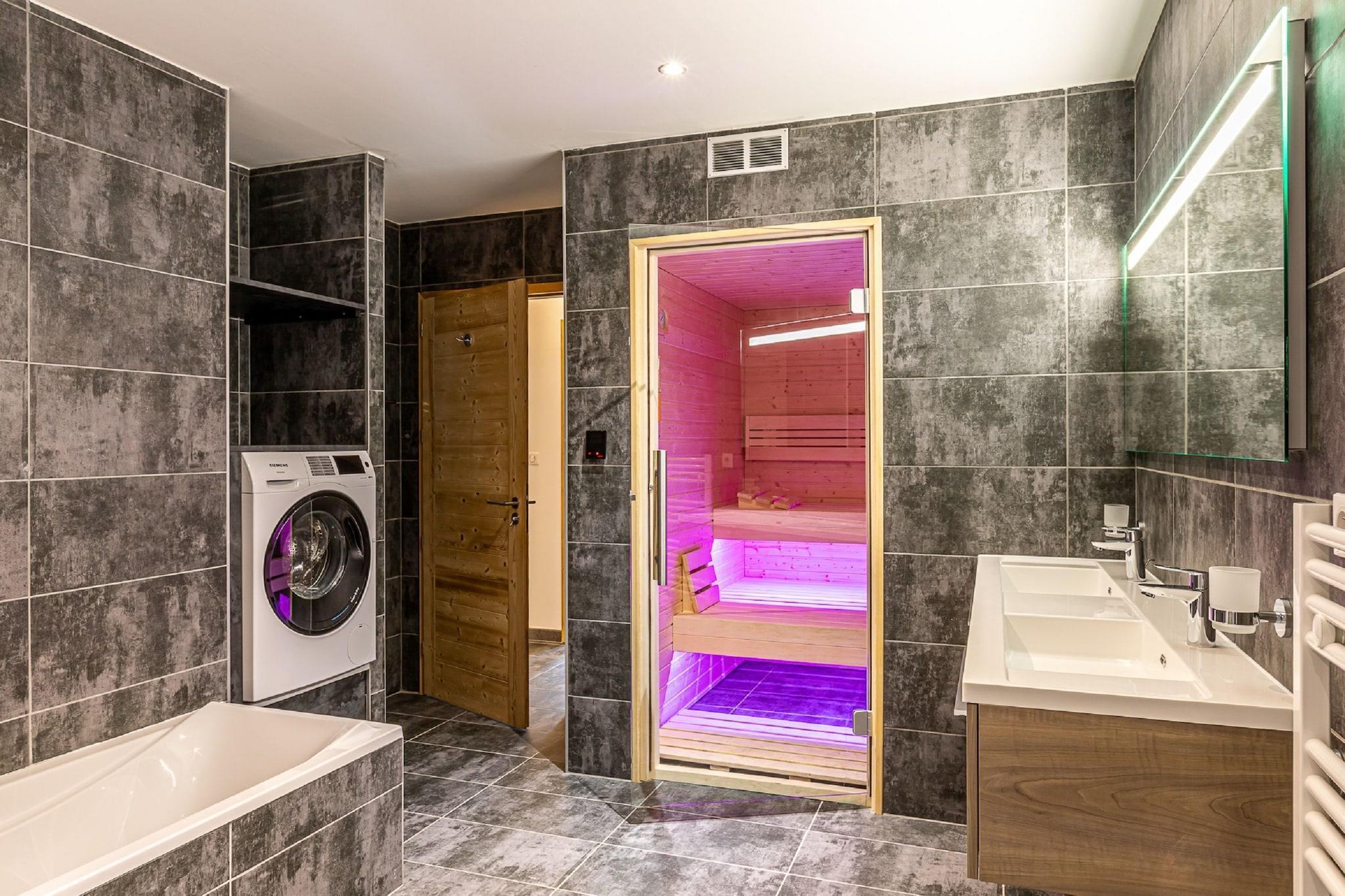 Denne luksuriøse penthouse med sauna ligger i den 5-stjernede bolig AlpChalets Portes du Soleil. Det er 1,3 km væk. fra centrum af den autentiske franske landsby La Chapelle d'Abondance og kun 1,5 km. fra skiliften. Denne penthouse i stueetagen med opvarmet træ- og/eller stengulv er luksuriøs og fuldt møbleret i den atmosfære, der er karakteristisk for dette område. I den rummelige og attraktive stue finder du komfortable møbler, et TV (med udenlandske kanaler) og en Bluetooth Soundbar. Det luksuriøse og åbne køkken er fuldt udstyret med blandt andet opvaskemaskine, Nespresso kaffemaskine og vinklimaskab. Penthousen består af fire soveværelser, hver med to 1-pers. senge, hvis ikke i en 2-pers. arrangement, et badeværelse med badekar, bruser, sauna og toilet, et andet badeværelse med bruser og toilet og et separat toilet. Derudover har taglejligheden vaskemaskine og tørretumbler. For ekstra bekvemmelighed er dine senge allerede rede ved ankomst Direkte fra stuen er der udgang til en rummelig altan med havemøbler, hvor du har en betagende udsigt over Abondance dalen. Der er parkering til én bil på parkeringspladsen AlpChalets Portes du Soleil. I Alpchalets Portes du Soleil kan du booke forskellige luksuslejligheder og penthouses til fire til ti personer.