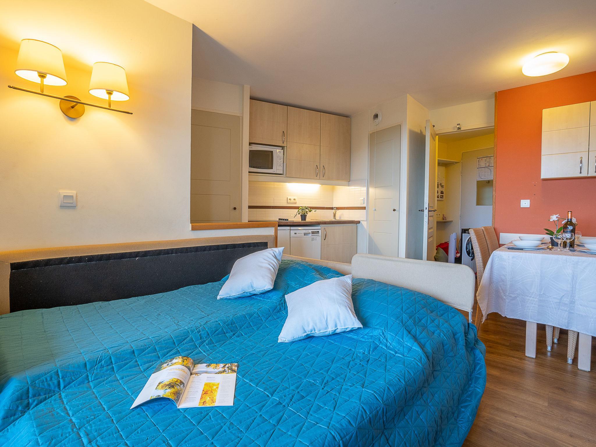 "Le Belvédère (D4 257)", 2-room apartment 27 m2 on 1st floor. Living room with 1 pull-out bed (2 x 80 cm, length 190 cm), TV (flat screen), electric heating and air conditioning. Exit to the terrace. 1 room with 1 french bed (140 cm, length 190 cm), TV (flat screen). Exit to the terrace. Kitchenette (4 hot plates, dishwasher, toaster, kettle, microwave, electric coffee machine, Capsules for coffee machine (Senseo) extra). Bathroom, sep. WC. Electric heating. Small terrace. Terrace furniture. View of the sea. Facilities: Internet (WiFi, free). Parking space n 2612 (roofed, 1 car), height 180 cm. Please note: non-smokers only. Smoke alarm. Offer by a private individual according to Art. 155, IV of CGI.