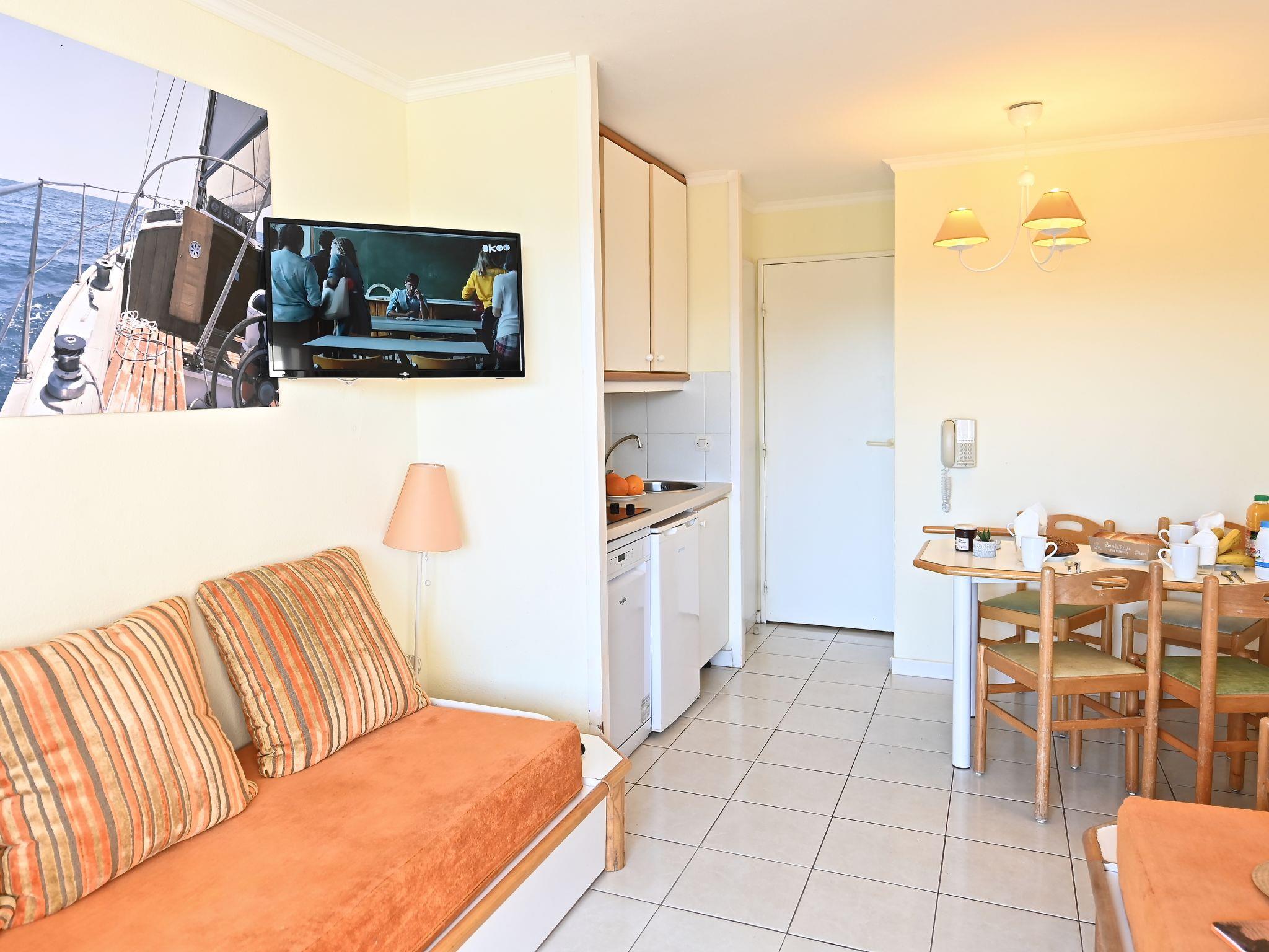 "L'Esquinade (F2 105)", 2-room apartment 28 m2. Living/sleeping room with 1 pull-out bed (2 x 80 cm, length 190 cm), TV (flat screen). Exit to the terrace. 1 small room with 1 french bed (140 cm, length 190 cm). Kitchenette (4 hot plates, dishwasher, toaster, kettle, microwave, electric coffee machine). Bathroom, sep. WC. Electric heating. Terrace 10 m2, roofed. Terrace furniture. View of the sea. Facilities: Internet (WiFi, extra). Parking space n 2598 (roofed). Please note: non-smokers only. Maximum 1 small pet/ dog allowed. Smoke alarm.