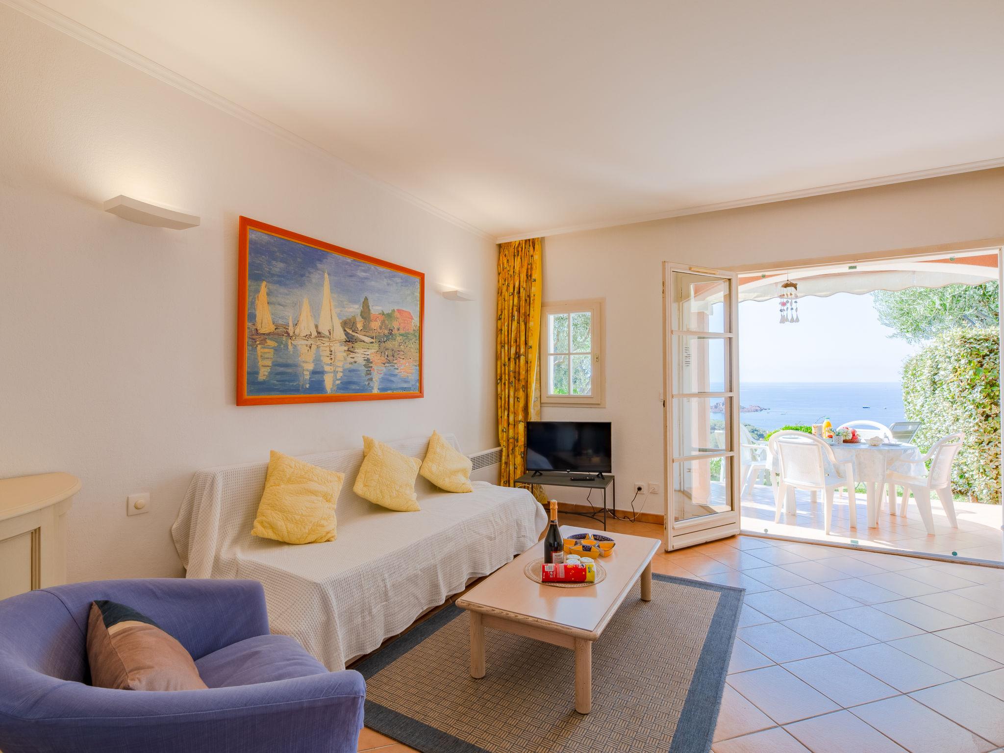 "Cap Estérel - Le Hameau (Mini Villa 35)", 3-room terraced house 35 m2 on 2 levels on 2nd floor. Beautiful and cosy furnishings: living/dining room with TV (flat screen). Exit to the terrace, to the patio. Open kitchen (oven, dishwasher, 4 ceramic glass hob hotplates, toaster, kettle, microwave, electric coffee machine). Sep. WC. Upper floor: 1 room with 2 beds (80 cm, length 190 cm). 1 room with 1 french bed (1 x 160 cm, length 190 cm), bathroom. Shower/WC. Electric heating. Terrace 15 m2, patio 15 m2. Terrace furniture, deck chairs. Marvellous view of the sea. Facilities: washing machine. Internet (WiFi, extra). Parking (1 car). Please note: suitable for families. Non-smokers only. Smoke alarm. Offer by a private individual according to Art. 155, IV of CGI.