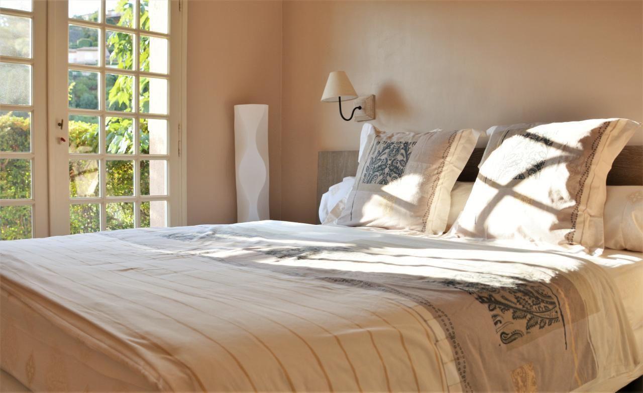 The bright villa offers a large dining room with sliding glass doors to the covered balcony with marvelous sea views. The open living room allows direct access to the upper terrace with a large table, barbecue and sun loungers invites to rest in the Mediterranean vegetation with orange and lemon trees. From here you can also listen to the concert of the cicadas with a glass of rosé in hand and forget the time passing by watching the sea and the view on St. Tropez. You will feel comfortable and safe in this wonderful place.