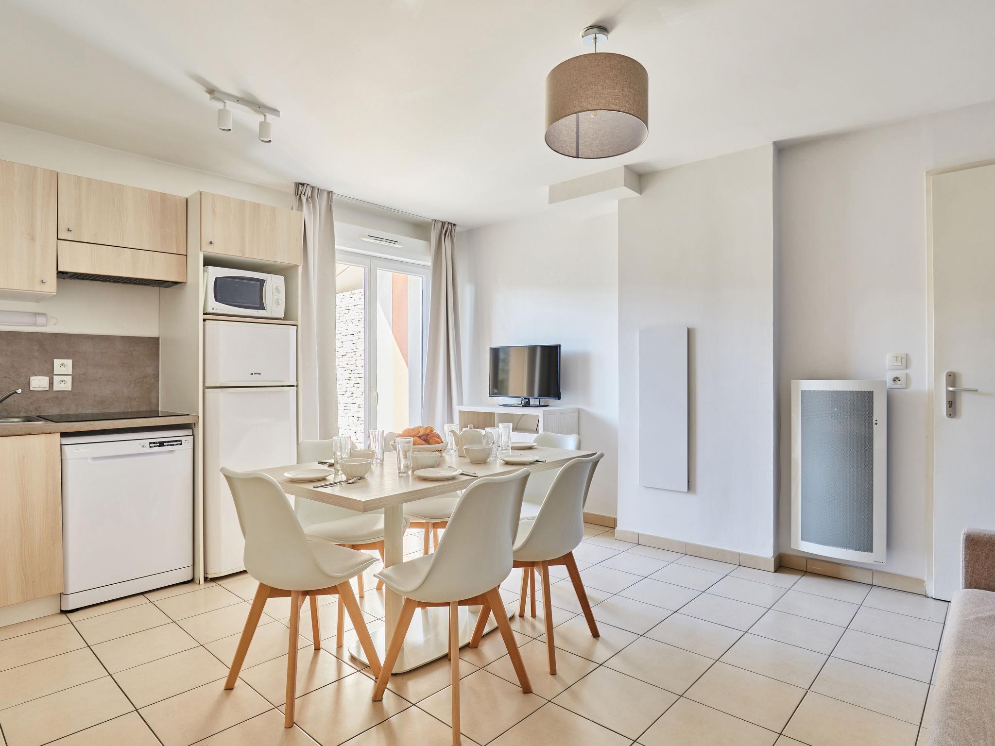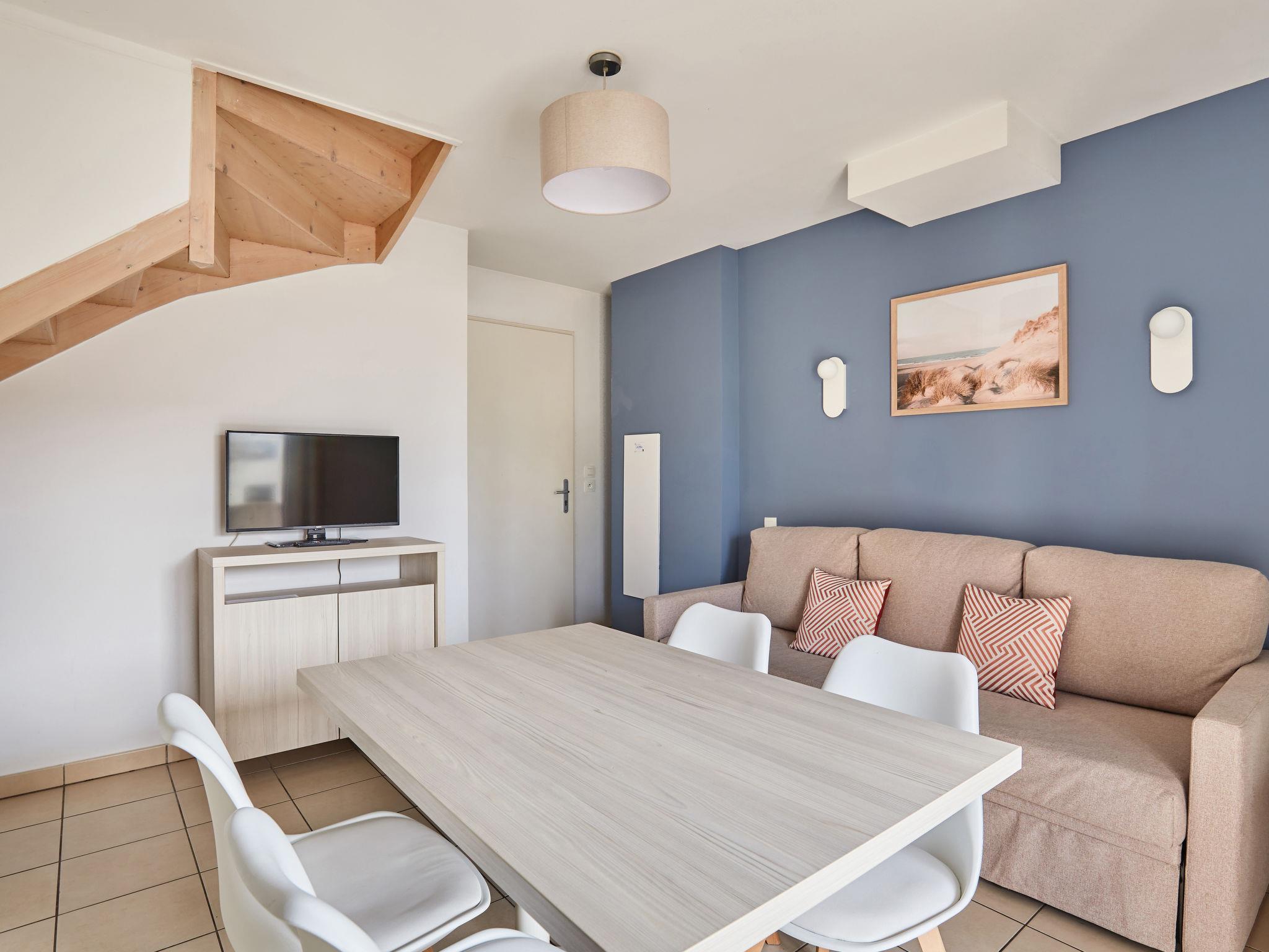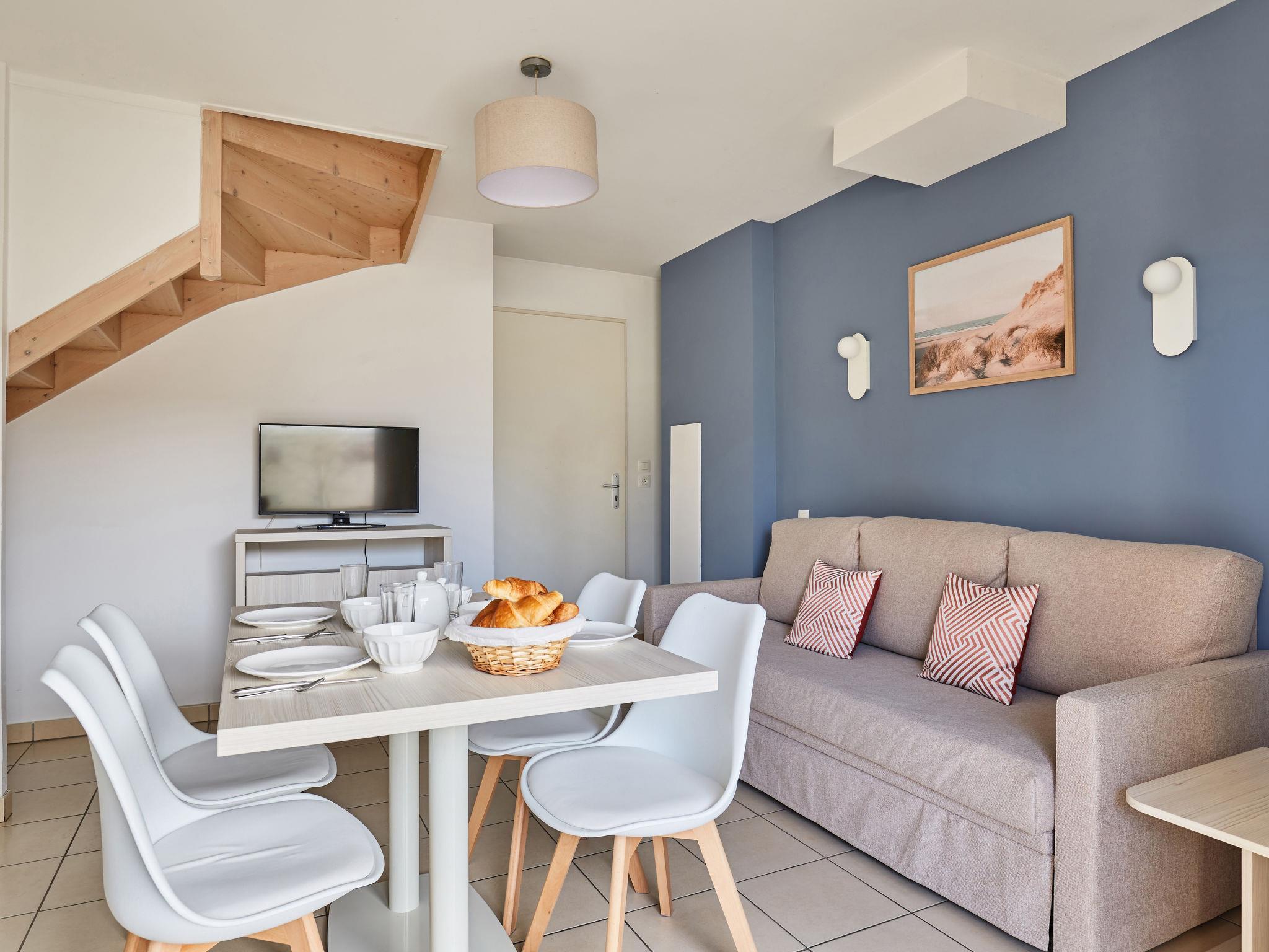 "Odalys Référence le Mas des Flamants", 2-room terraced house 35 m2 on 2 levels. Bright: living/sleeping room with 1 double sofabed, dining table and TV. Exit to the terrace. Small, open kitchen (dishwasher, 2 ceramic glass hob hotplates, kettle, microwave, freezer, electric coffee machine). Upper floor: 1 room with 1 french bed. Sep. WC, bath or shower. Electric heating. Terrace. Terrace furniture. Facilities: children's high chair, baby cot (extra). Internet (WiFi, free). Please note: non-smoking house. Maximum 1 pet/ dog allowed. Smoke alarm.
