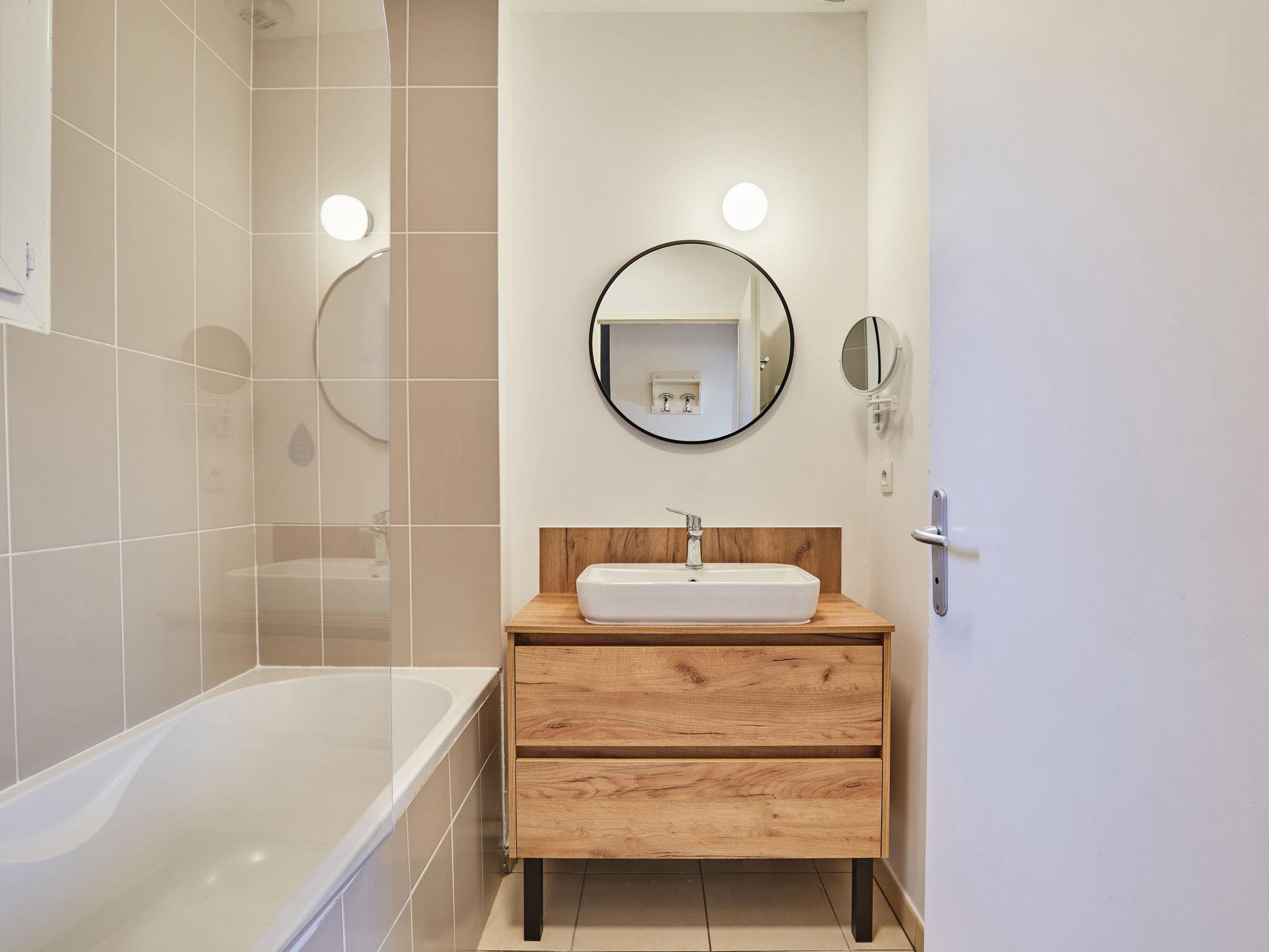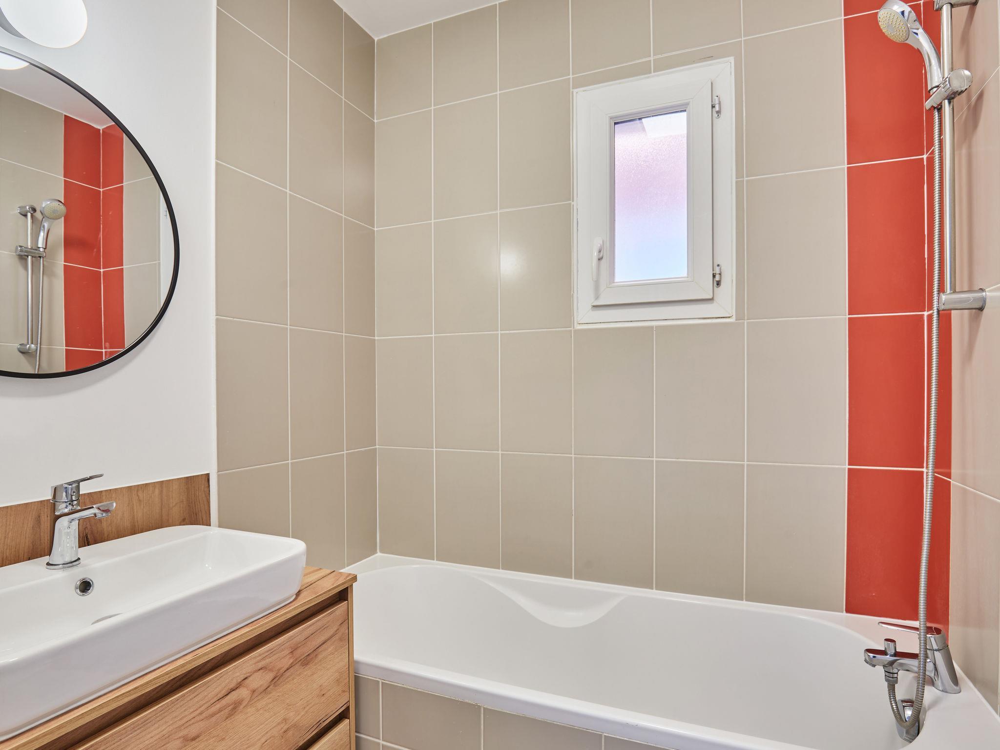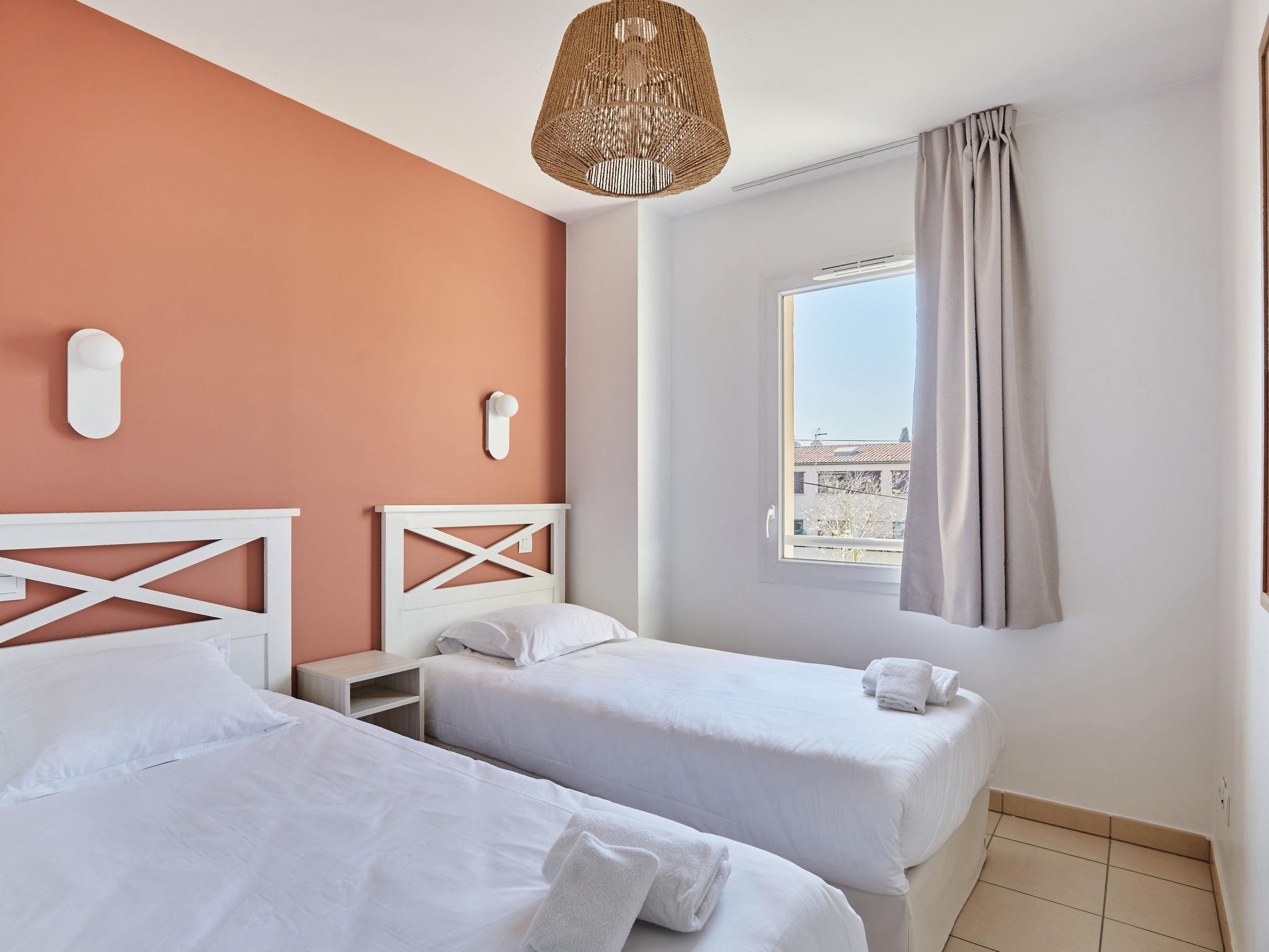 "Odalys Référence le Mas des Flamants", 2-room terraced house 35 m2 on 2 levels. Bright: living/sleeping room with 1 double sofabed, dining table and TV. Exit to the terrace. Small, open kitchen (dishwasher, 2 ceramic glass hob hotplates, kettle, microwave, freezer, electric coffee machine). Upper floor: 1 room with 1 french bed. Sep. WC, bath or shower. Electric heating. Terrace. Terrace furniture. Facilities: children's high chair, baby cot (extra). Internet (WiFi, free). Please note: non-smoking house. Maximum 1 pet/ dog allowed. Smoke alarm.