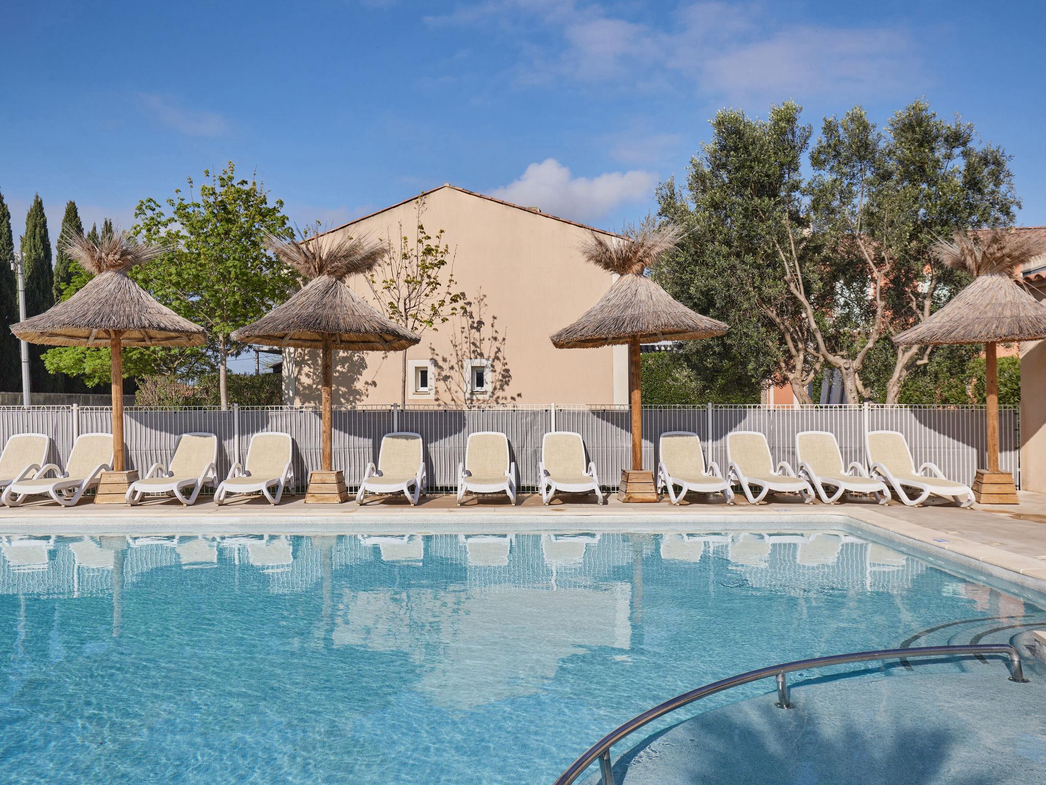 Beautiful resort "Odalys RéférenceLe Mas des Flamants". 64 houses in the residence. 1 km from the centre of Aigues Mortes, 31 km from the centre of Montpellier, 38 km from the centre of Nîmes, 7 km from the sea. For shared use: property (fenced) with plants, swimming pool heated (11 x 8 m, seasonal availability: 15.Apr. - 15.Sep.). Children's pool. In the complex: reception, washing machine (for shared use, extra). Parking on the premises. Shop 1 km, sandy beach 7 km. Please note: the photograph shows a typical example. The holiday properties may differ in living space, floorplan, equipment and furnishing.