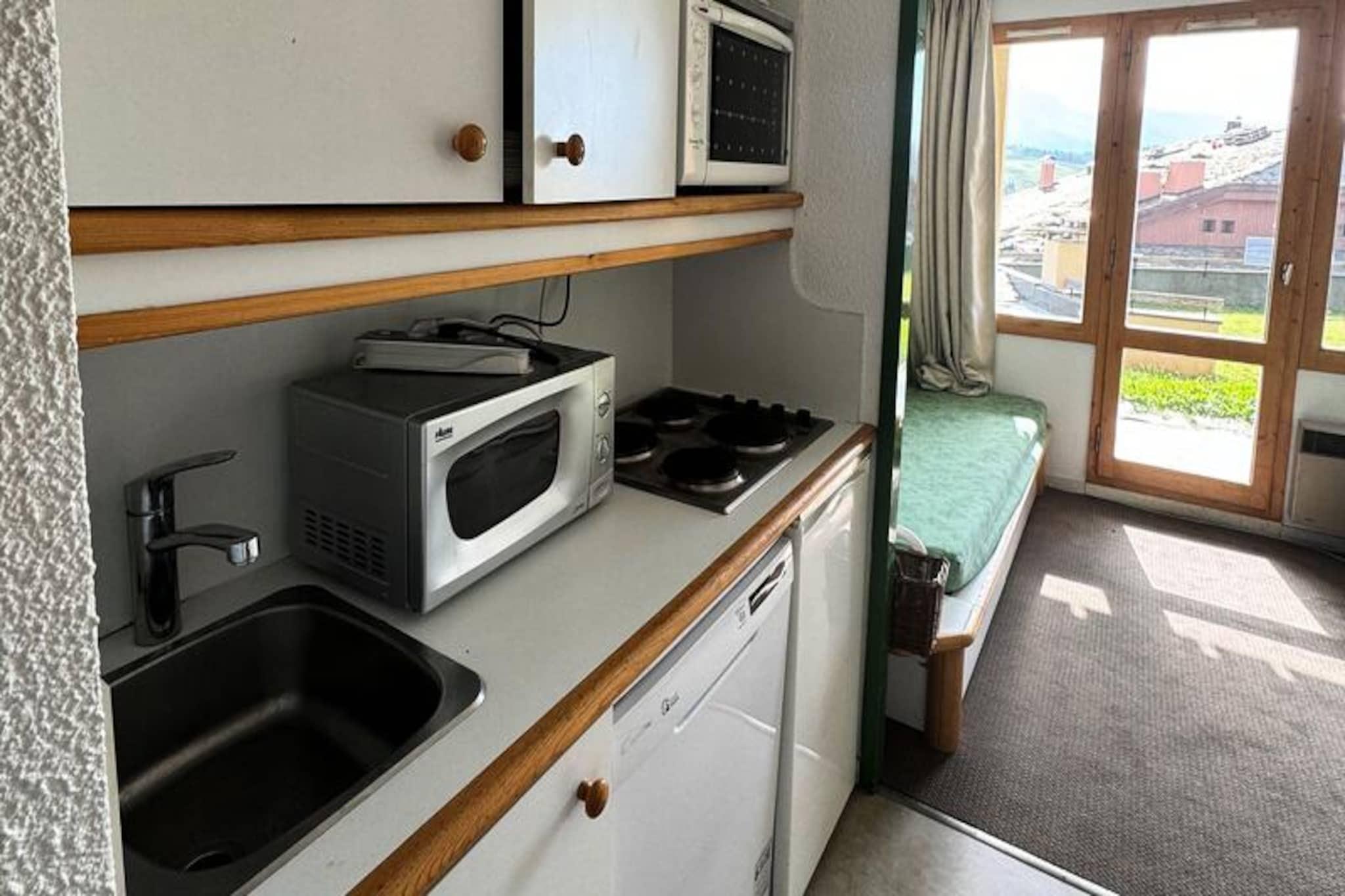 Højt over det charmerende Belle Plagne-skisportssted tilbyder dette hyggelige studie en plads på første række til det alpine eventyrland. Med direkte adgang til pisterne kan du træde ud af din dør og ud i den uberørte sne, klar til at udforske det store Paradiski-skiområde. Boligen, der ligger i den øvre del af skisportsstedet, kombinerer bekvemmelighed med en betagende udsigt over bjergene, hvilket gør det til et ideelt tilflugtssted for både vintersportsentusiaster og naturelskere. Fra din vestvendte balkon kan du nyde fredfyldte solnedgange over pisterne efter en spændende dag i sneen. Kompakt, men gennemtænkt designet, har dette 23 m² store studie komfortabel plads til op til 4 gæster. Opholdsstuen har to enkeltsenge og en udtræksseng, mens en hyggelig sovealkove tilbyder køjesenge, perfekt til familier eller små grupper. Køkkenet, der er udstyret med moderne apparater, herunder ovn, mikrobølgeovn, opvaskemaskine og køleskab, inviterer dig til at tilberede solide måltider efter en dag med eventyr. Et fladskærms-tv og en varm, indbydende atmosfære sikrer afslapning og komfort under dit ophold. Badeværelset har badekar og toilet, og der er tæpper til rådighed for din bekvemmelighed. Residensen kan prale af praktiske faciliteter såsom elevator, individuelle skibokse og betalt parkeringskælder med direkte adgang. Butikker, restauranter og resortfaciliteter ligger kun 100 meter væk, hvilket sikrer, at alt hvad du behøver er inden for rækkevidde. For ekstra bekvemmelighed er der betalt Wi-Fi tilgængeligt på resortet, så du kan holde dig forbundet, mens du nyder din alpine ferie. Uanset om du er her for at grave dig gennem frisk puddersne, nyde de fantastiske bjergudsigter eller blot slappe af i den friske alpeluft, tilbyder dette studie i Belle Plagne den perfekte base for uforglemmelige minder i hjertet af de franske alper.