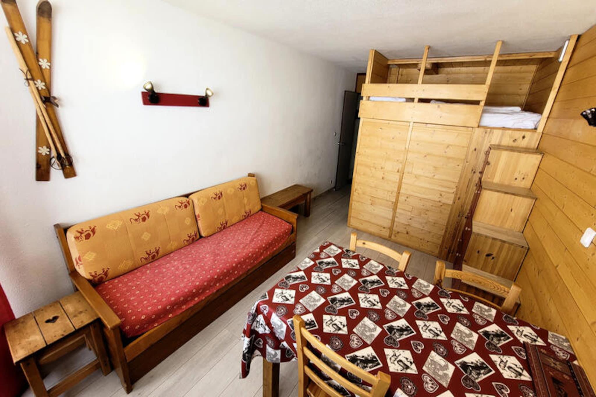 Højt over Tarentaise-dalen tilbyder denne charmerende studiohytte et hyggeligt tilflugtssted i det ikoniske Paquebot des Neiges, en unik krydstogtskibsinspireret bolig i Aime 2000. Med sin ski-in/ski-out-bekvemmelighed og betagende sydvendte udsigt over pisterne er denne ejendom perfekt til dem, der søger en uforglemmelig alpin ferie. Fra det øjeblik du ankommer, vil den pulserende atmosfære på feriestedet og den nemme adgang til skiløb i verdensklasse betage dig. Uanset om du er her for de pudrede pister eller de fredfyldte bjergudsigter, lover denne studiolejlighed et mindeværdigt ophold. Det 26 m² store studio er omhyggeligt designet til at rumme op til fire gæster, hvilket gør det ideelt for par eller små familier. Stuen har en komfortabel sovesofa og et fladskærms-tv, mens mezzaninen tilbyder en hyggelig dobbeltseng. Et separat soveområde med køjesenge sikrer privatliv og komfort for alle. Det kompakte køkken, udstyret med mikrobølgeovn, elektriske kogeplader og køleskab, giver dig mulighed for at tilberede solide måltider efter en dag på pisterne. Badeværelset har et badekar, perfekt til at nyde dagens eventyr. Træd ud på den sydvendte balkon for at nyde den fantastiske udsigt over de omkringliggende toppe og skråninger. Beliggende i Paquebot des Neiges tilbyder boligen uovertruffen bekvemmelighed. Butikker, restauranter og svævebanestationen er alle tilgængelige på niveau G, mens en gratis shuttlebus til resortet sikrer, at du nemt kan udforske området. For ekstra komfort er der gratis udendørs parkering og betalt overdækket parkering. Om vinteren kan du nyde direkte adgang til pisterne, og om sommeren kan du opleve Alpernes skønhed med vandrestier og udendørsaktiviteter. Uanset om du er her for at stå på ski, slappe af eller udforske, kombinerer denne studiohytte i Aime 2000 komfort, bekvemmelighed og en fantastisk natur for en uforglemmelig bjergferie.