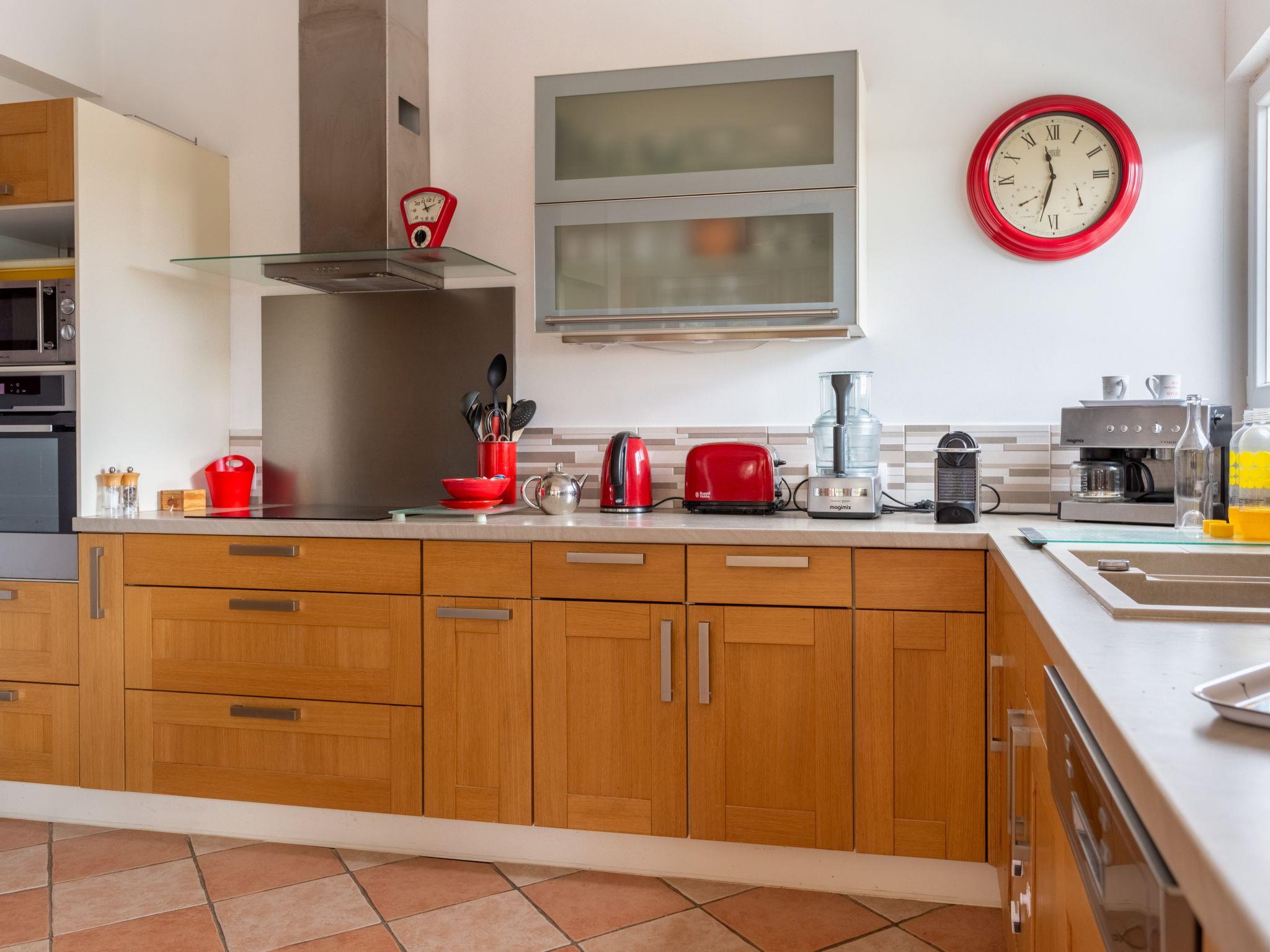 5-room villa 170 m2 on 2 levels. Practical and beautiful furnishings: living/dining room 40 m2 with TV (flat screen), radio, CD-player, DVD, wood-burning stove and fan. Exit to the terrace. 1 room with Dressing room with 1 french bed (1 x 160 cm, length 200 cm), air conditioning. Exit to the terrace. 1 room with 1 french bed (1 x 140 cm, length 190 cm), air conditioning. Exit to the terrace. Open kitchen (oven, dishwasher, 3 induction hot plates, toaster, kettle, microwave, freezer, electric coffee machine). Shower/WC, sep. WC. Electric heating. Upper floor: 1 room with 1 french bed (1 x 140 cm, length 190 cm), air conditioning and fan. 1 room with 2 beds (90 cm, length 190 cm), air conditioning. Bath/WC. Terrace 35 m2 partly roofed, garden. Terrace furniture, barbecue, deck chairs (4). Facilities: washing machine, iron, children's high chair, baby cot, hair dryer. Internet (WiFi). Parking (2 cars). Please note: non-smoking house. Smoke alarm. FR6679.603.1