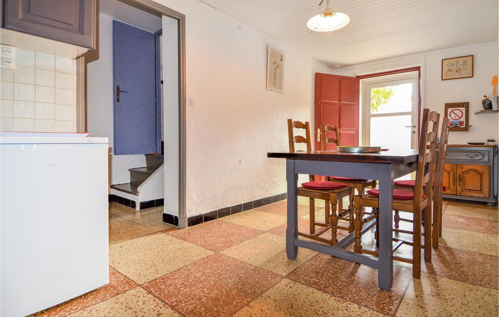 Dette enkelt indrettede feriehus ligger på en landbrugsejendom og egner sig godt til et par eller en lille familie, der søger en pause fra hverdagen midt i naturen. Boligen strækker sig over to etager og har en jordnær indretning, der afspejler stemningen i et autentisk landhjem. Hyg jer i den enkle opholdsstue, tag plads i sofaen, eller tilbered lette måltider i det funktionelt udstyrede køkken. Spisepladsen indbyder til fælles stunder, mens de store vinduer lukker dagslyset ind.