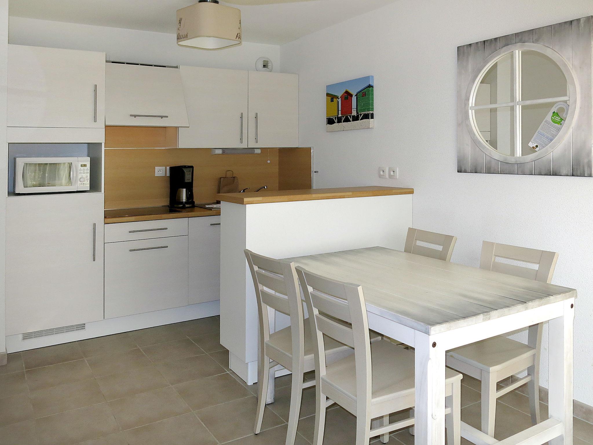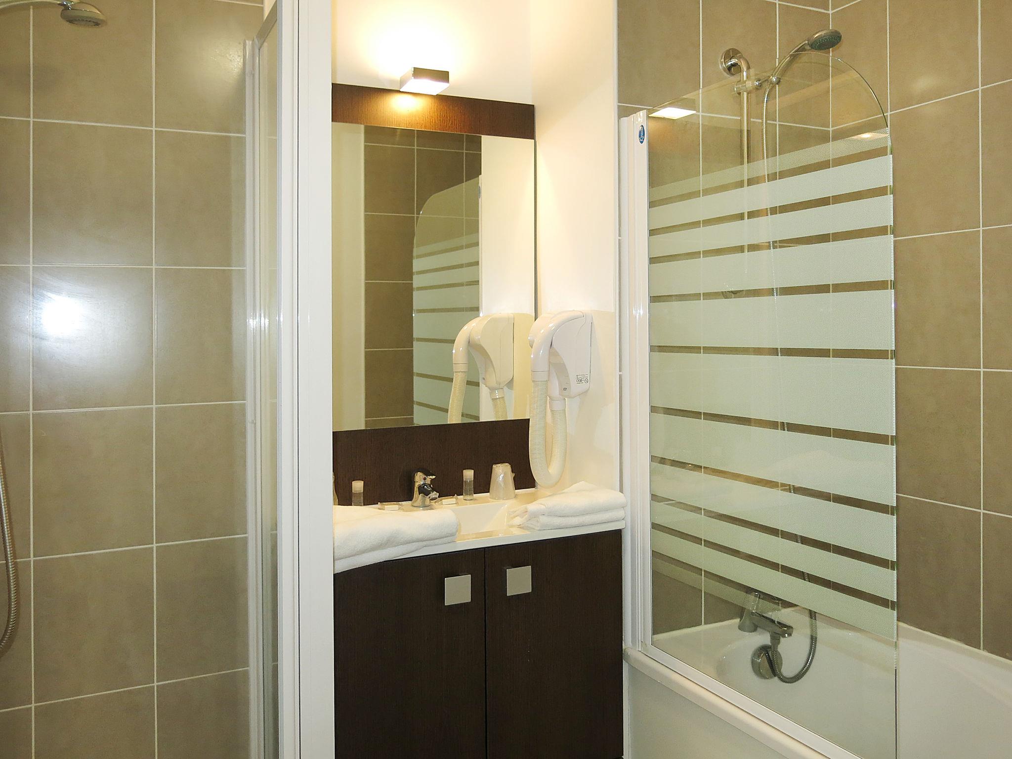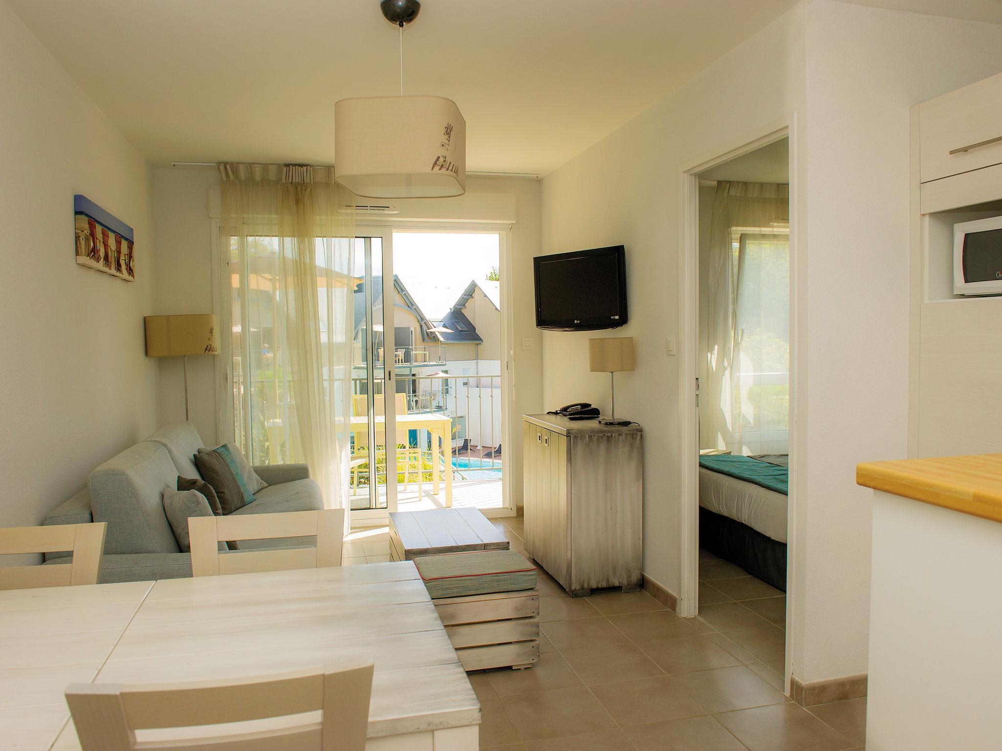 "Les Jardins d'Arvor", 2-room apartment 33 to 41 m2. Comfortable and modern furnishings: living/sleeping room with 1 double sofabed, dining table and TV. 1 room with 2 beds. Small, open kitchen (dishwasher, 4 ceramic glass hob hotplates, toaster, kettle, microwave, electric coffee machine). Bath/shower, sep. WC. Electric heating. Balcony or terrace. Balcony furniture. Facilities: Internet (WiFi, free). Please note: non-smokers only. Maximum 1 small pet/ dog allowed. Smoke alarm.