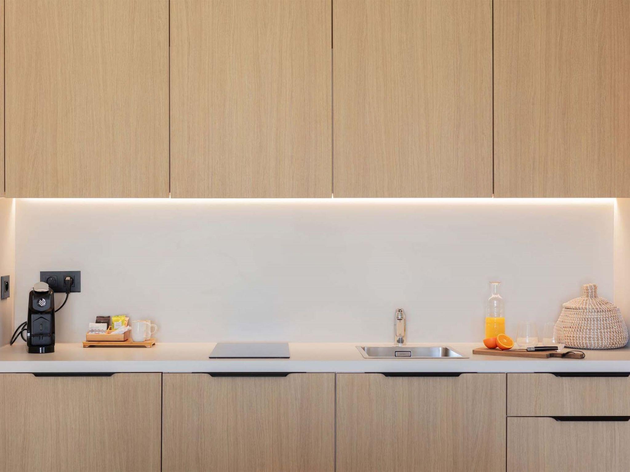 "Le Domaine de Massane", 2-room apartment 50 m2. Very modern furnishings: living/dining room with dining table and TV (flat screen). Exit to the balcony, to the terrace. 1 room with 1 french bed (160 cm, length 200 cm). Kitchenette (2 ceramic glass hob hotplates, toaster, kettle, microwave, electric coffee machine). Shower, sep. WC. Air-conditioning, forced-air heating. Small balcony or small terrace. Balcony furniture. View of the garden. Facilities: safe, children's high chair, baby cot, hair dryer. Internet (WiFi, free). Please note: maximum 1 pet/ dog allowed. Smoke alarm. The property is one of a type of property or apartment.