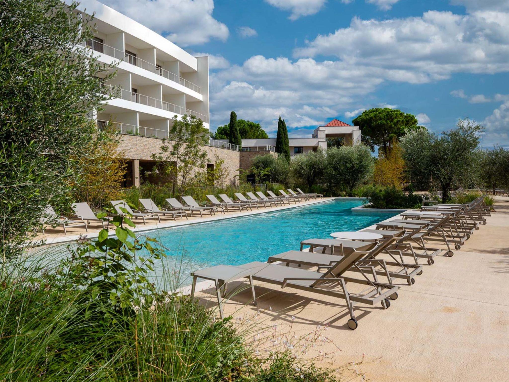 Modern, beautiful aparthotel "Horizon Resort Massane". 39 apartments in the residence. 3 km from the centre of Baillargues, 17 km from the centre of Montpellier, 27 km from the centre of La Grande Motte, 27 km from the sea, 27 km from the beach, on the golf course. For shared use: swimming pool heated, fenced (seasonal availability: 15.Apr. - 15.Oct.). In the complex: restaurant, bar, WiFi, sauna (extra). Fitness room. Parking. E-charging station. Shop 1.5 km, supermarket 1.5 km, bus stop "Gare de Baillargues" 1 km. Golf course (18 hole). Nearby attractions: Montpellier 17 km, Plages de la Méditerranée 27 km, Nimes / Aigues Mortes 40 km, Saintes Maries de la Mer 60 km, Arles 70 km, Béziers / Avignon 80 km. Please note: the photograph shows a typical example. The holiday properties may differ in living space, floorplan, equipment and furnishing.