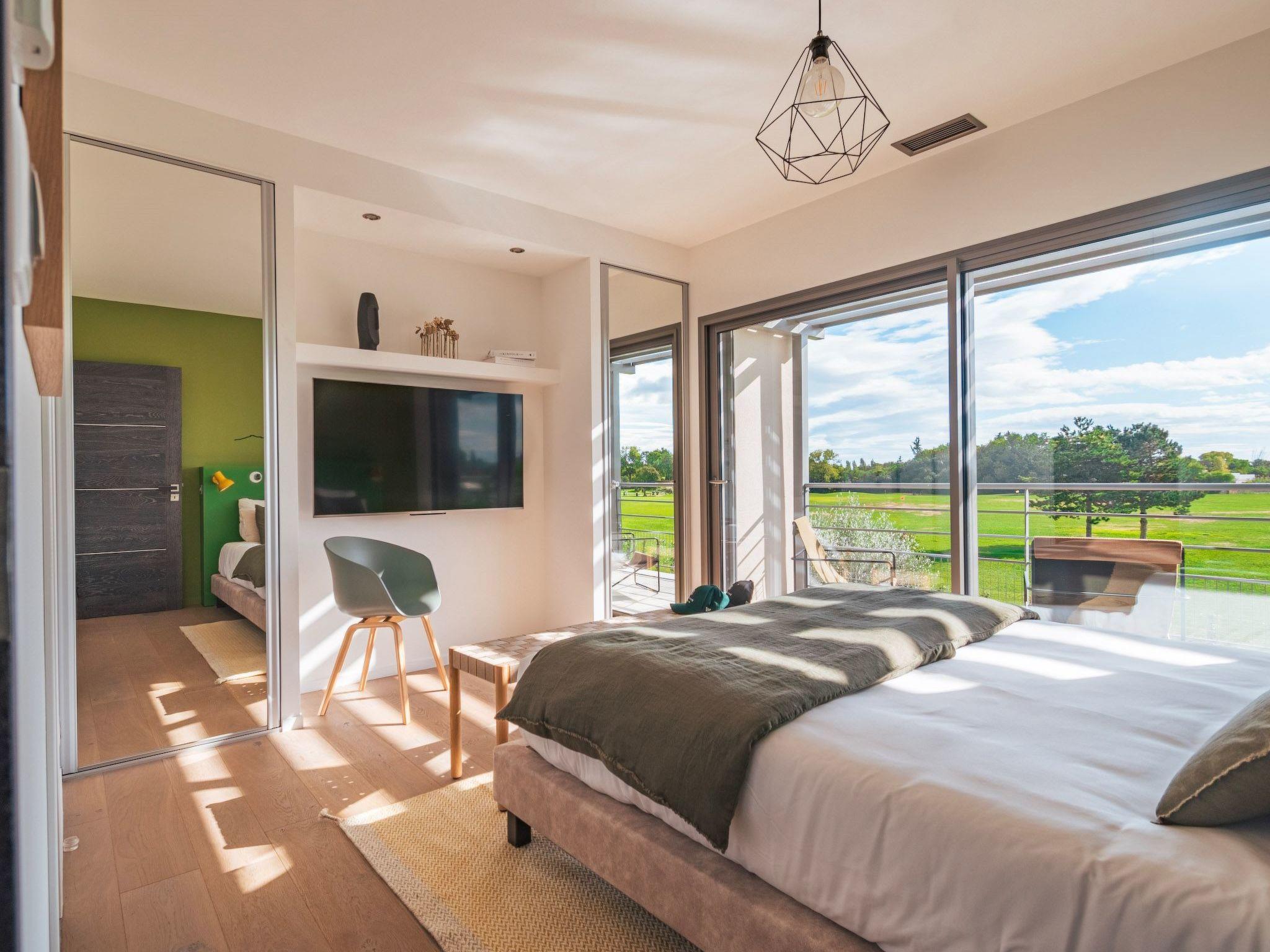 "Villa Horizon Resort Massane", 5-room villa 270 m2 on 2 levels. Spacious and bright, comfortable and modern furnishings: large living/dining room with winter garden with open-hearth fireplace, dining table and TV (flat screen). Exit to the terrace, to the swimming pool. Open kitchen (oven, dishwasher, 4 ceramic glass hob hotplates, toaster, kettle, microwave, freezer, electric coffee machine, cooking island). Exit to the terrace. Sep. WC. Upper floor: 1 room with Dressing room with 1 french bed (160 cm, length 200 cm), shower/WC and TV (flat screen). Exit to the balcony. 1 large room with 1 french bed (160 cm, length 200 cm), shower/WC and TV (flat screen). 1 room with 1 french bed (160 cm, length 200 cm), shower/WC and TV (flat screen). Exit to the balcony. 1 room with 2 beds (90 cm, length 190 cm), shower/WC. Exit to the balcony. Air-conditioning, forced-air heating. Large balcony, large terrace. Terrace furniture, balcony furniture, deck chairs (8). View of golf course. Facilities: washing machine, telephone, safe, children's high chair, baby cot, hair dryer. Internet (WiFi, free). Garage on the property (2 cars). Please note: maximum 1 pet/ dog allowed. Smoke alarm.