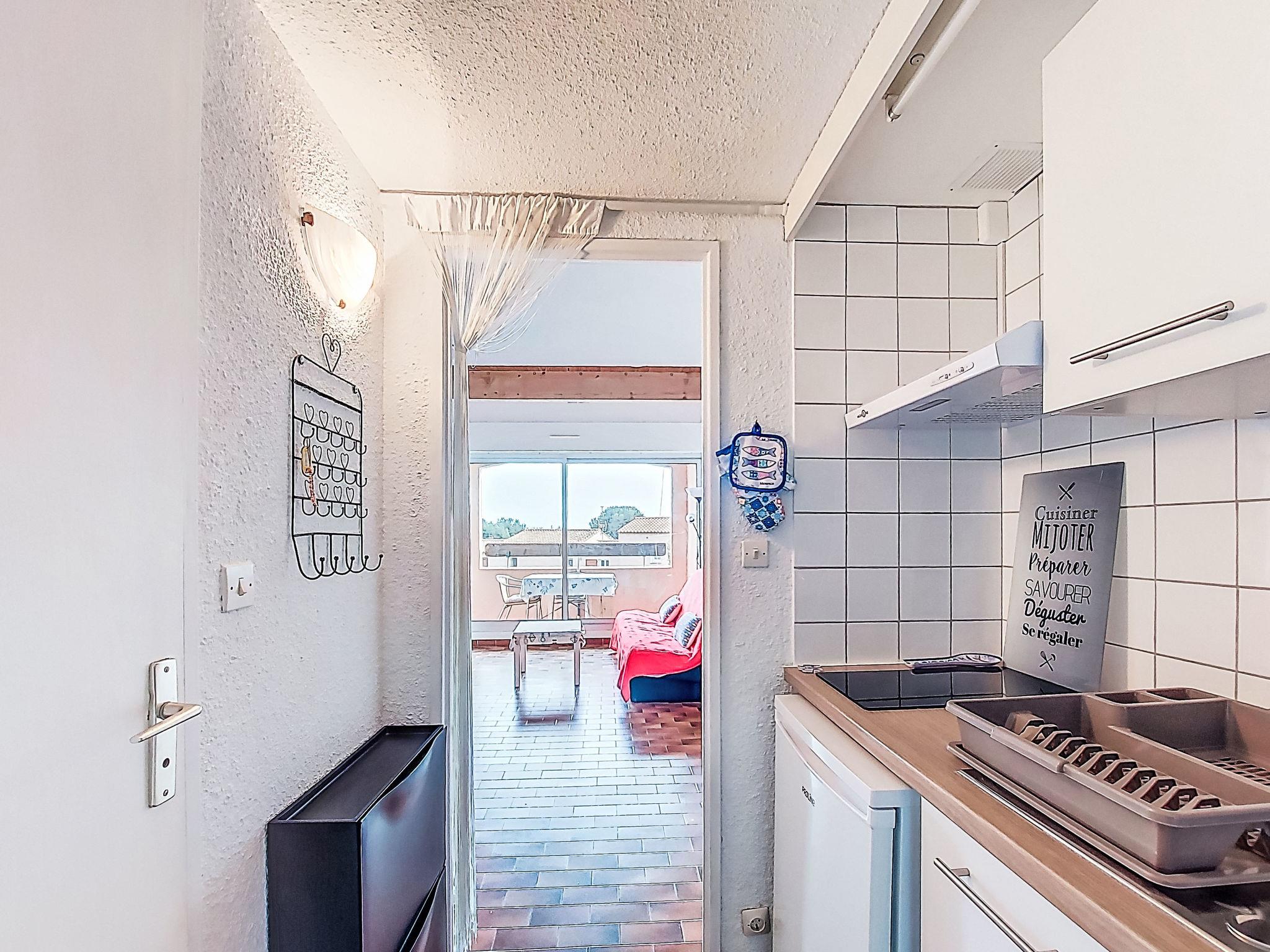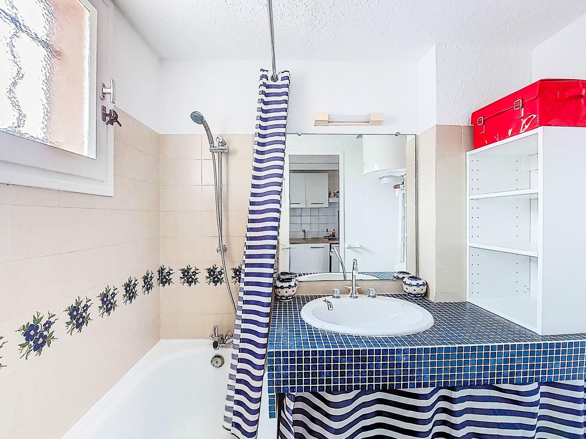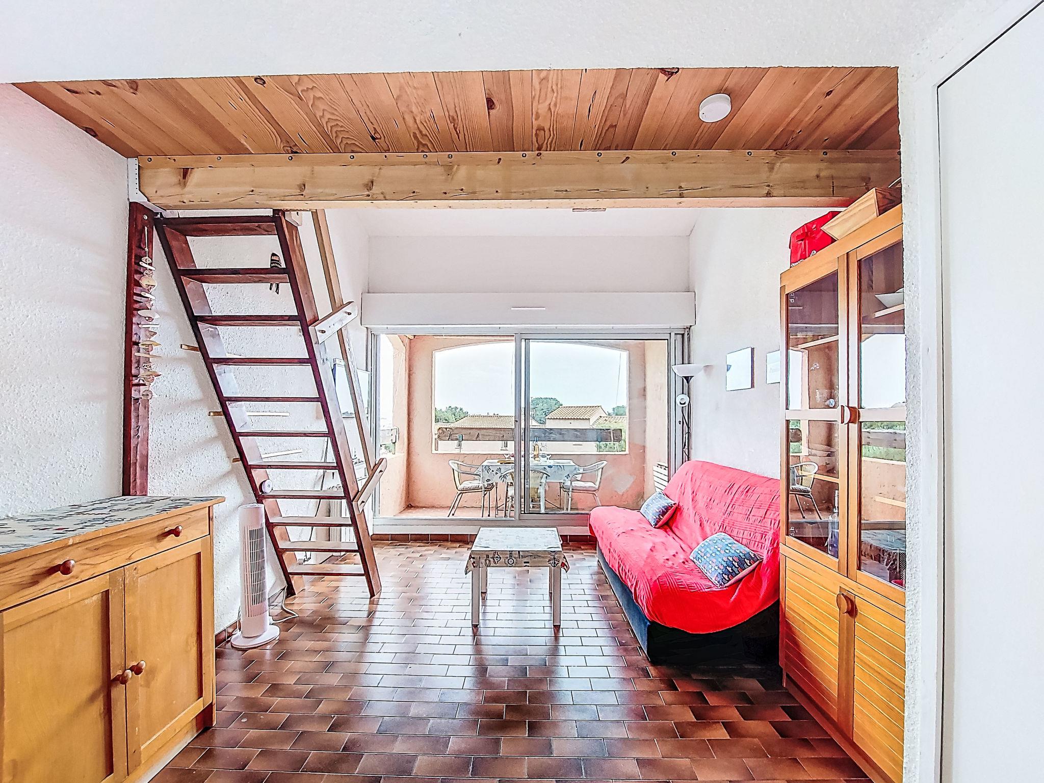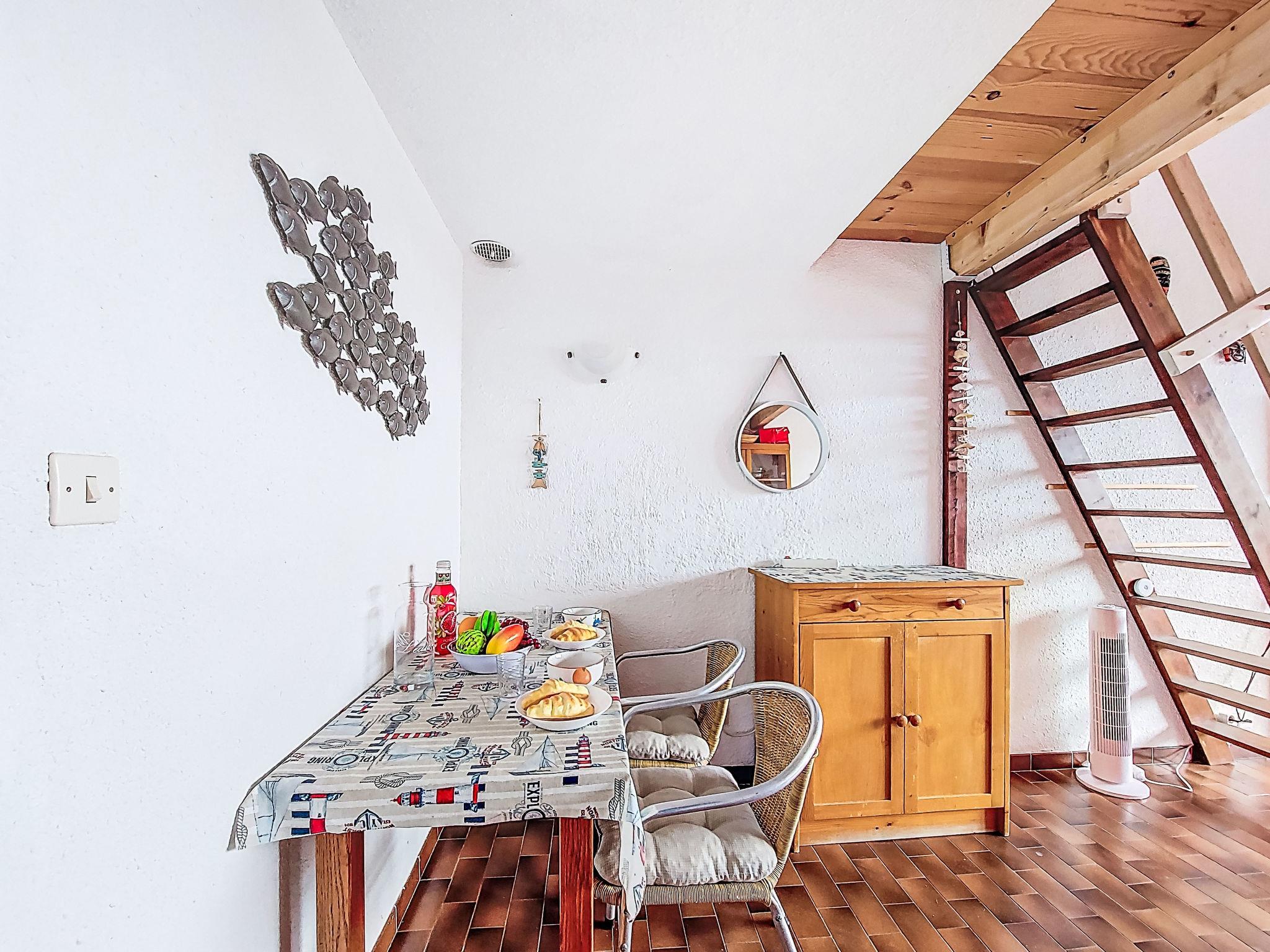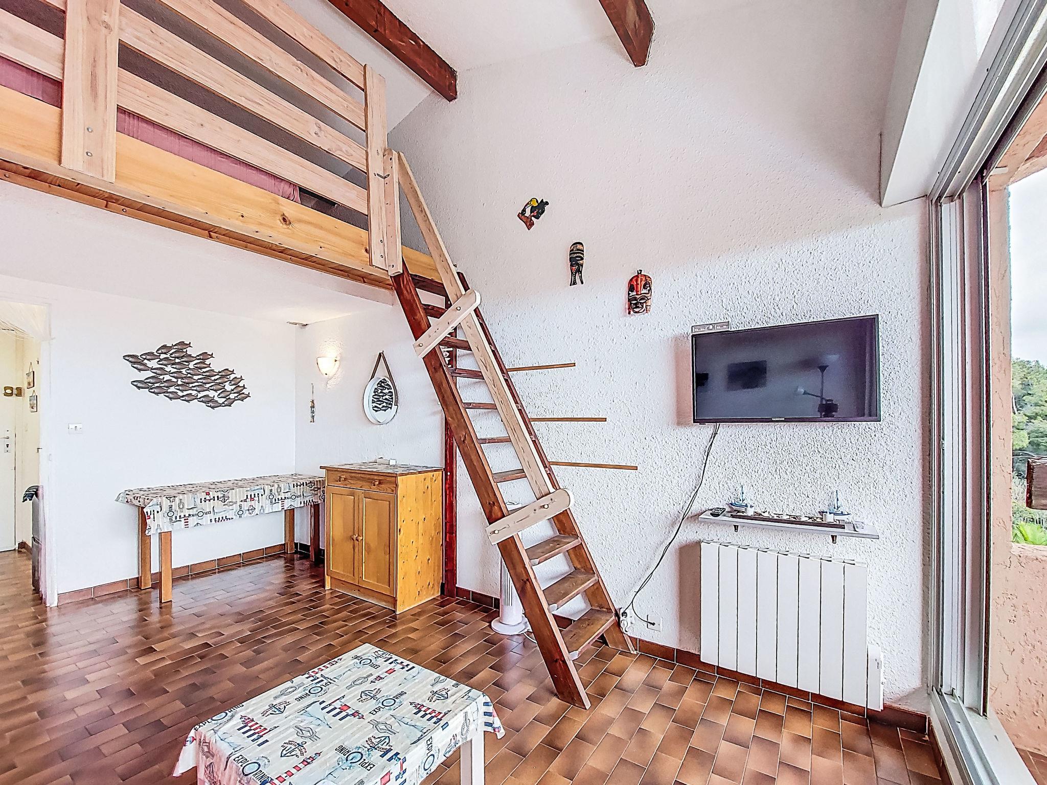 1-room studio 28 m2 on 2 levels on 1st floor. Simple and practical furnishings: living/dining room with 1 double sofabed (130 cm, length 190 cm), TV and fan. Exit to the terrace. Kitchenette in the entrance (2 ceramic glass hob hotplates, kettle, microwave, electric coffee machine). Bath/WC. Electric heating. Upper floor: (steep stair) open gallery with sloping ceilings, ceiling height 65 - 140 cm with 1 french bed (140 cm, length 190 cm), fan. Terrace 6 m2, roofed, south-east facing position. Terrace furniture. View of the sea. Facilities: Internet (WiFi, extra). Parking space n 63. Please note: TV only FR. Smoke alarm. 83009 000020 RR