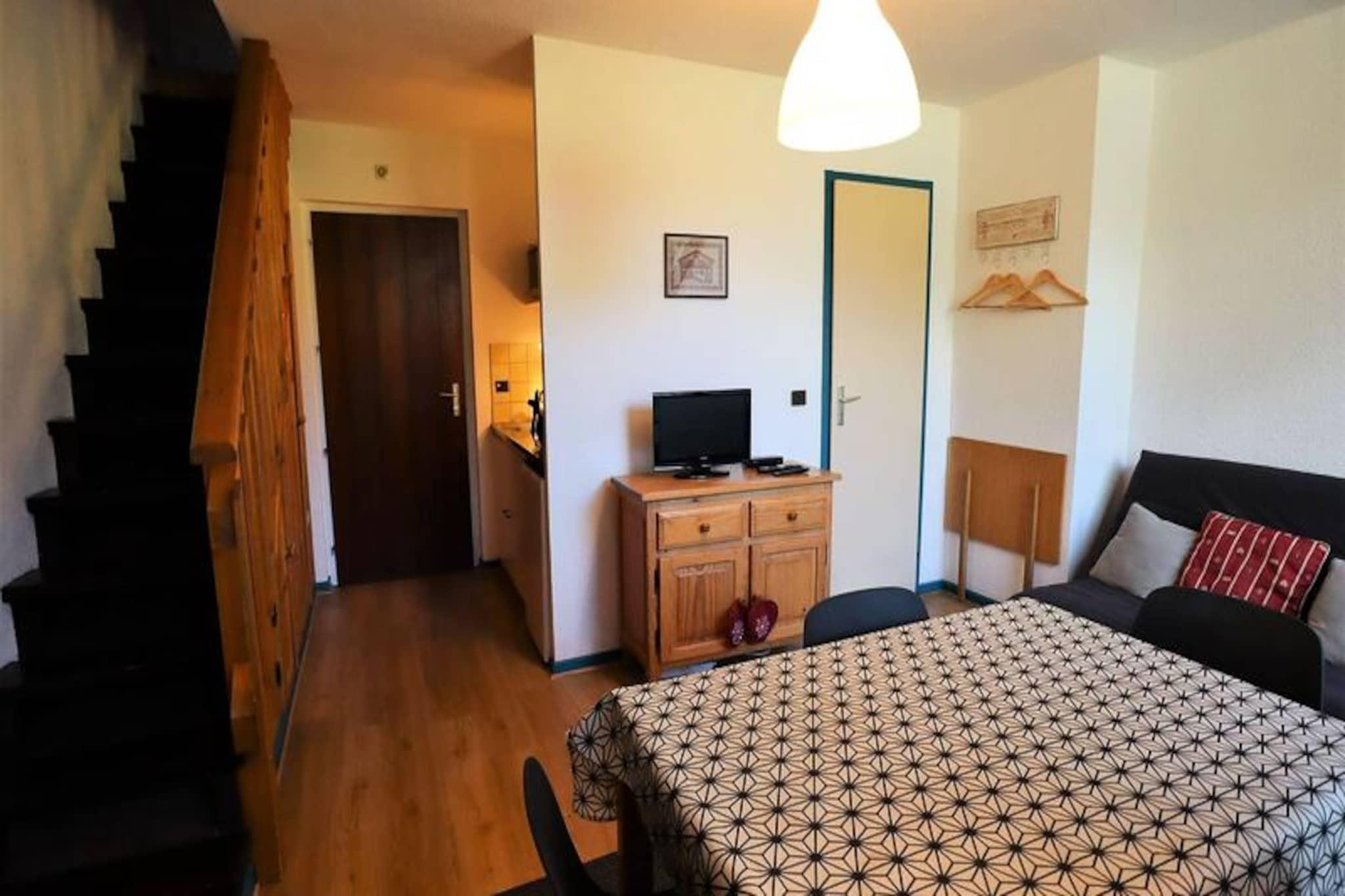 Denne charmerende sydvendte duplexlejlighed, badet i sollys og tilbyder et roligt alpint tilflugtssted, er en dejlig oase i hjertet af de franske alper. Beliggende på 4. sal i en fredelig bolig med kun 30 lejligheder, lover den ro og en betagende udsigt. Den delvist lukkede loggia tilbyder et privat sted at nyde bjergstemningen, hvilket gør den til det perfekte sted at nyde din morgenkaffe eller slappe af efter en dag med eventyr. Indenfor er den 40 m² store lejlighed omhyggeligt designet til komfort og praktisk anvendelighed. Stuen med sin hyggelige sovesofa åbner ud til loggiaen og har et fuldt udstyret tekøkken, inklusive en elektrisk ovn til hjemmelavede måltider. Ovenpå er der et rummeligt soveværelse med plads til op til fire gæster med en dobbeltseng og to enkeltkøjesenge, hvilket gør den ideel til familier eller små grupper. Et badeværelse med toilet er bekvemt placeret i underetagen. Boligen ligger kun 1 km fra lokale butikker og få skridt fra et shuttle-stoppested og tilbyder nem adgang til det omkringliggende område. Uanset om du er her for at stå på ski på de uberørte pister om vinteren eller udforske de frodige vandrestier om sommeren, er denne lejlighed perfekt beliggende. I nærheden finder du charmerende landsbyer, lokale markeder og masser af muligheder for at fordybe dig i den alpine livsstil. Med sin blanding af komfort, bekvemmelighed og fantastiske omgivelser er denne duplexlejlighed en indbydende base for at skabe uforglemmelige bjergminder. Uanset om du søger eventyr eller afslapning, har denne alpine perle det hele.