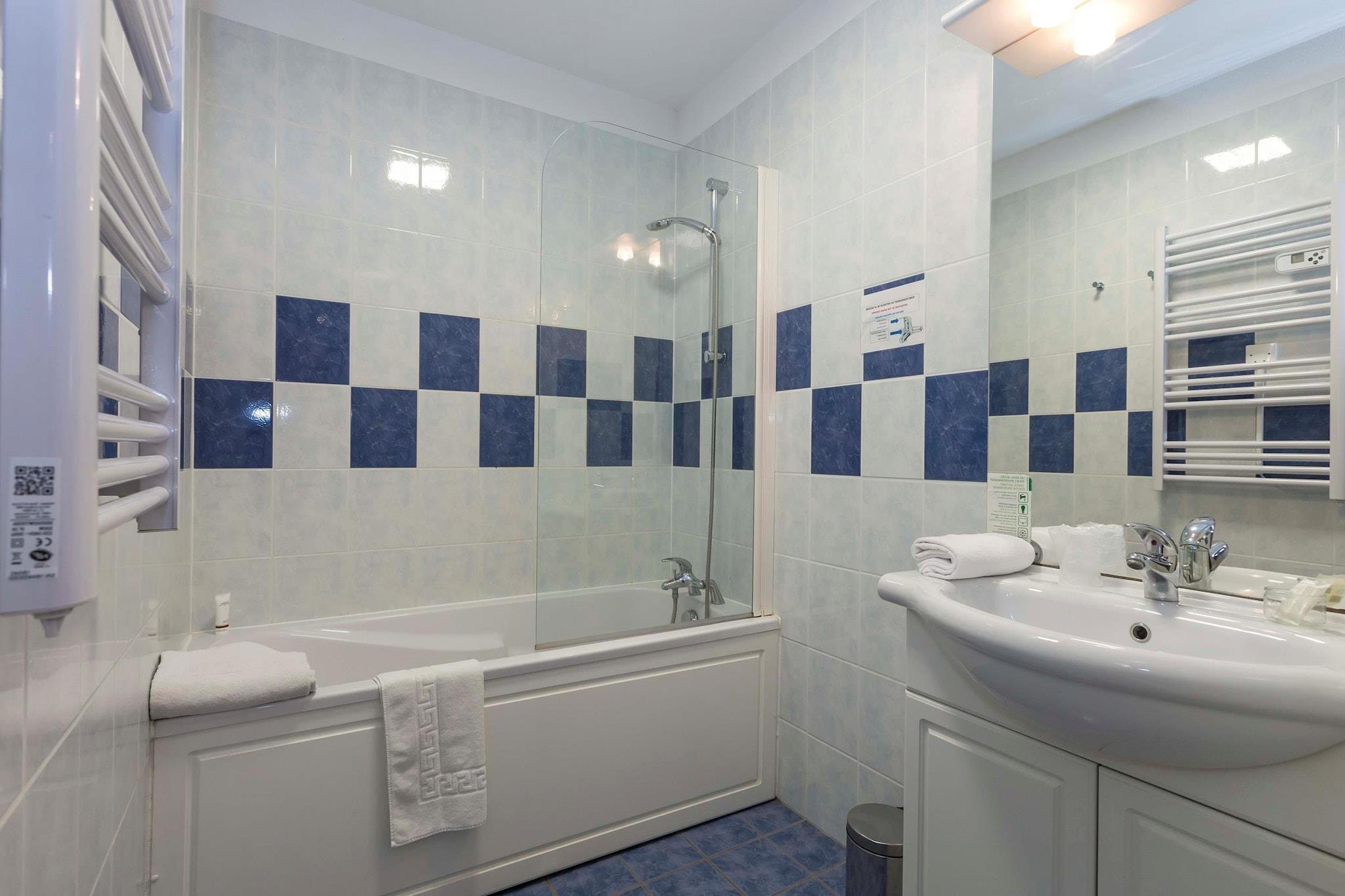 Tekøkken(kogeplade, mikrobølgeovn, opvaskemaskine , køleskab), Stue/soveværelse(enkeltskabsseng, dobbeltskabsseng), badeværelse(badekar med bruser, toilet), swimmingpool(deles med andre gæster, indendørs)
