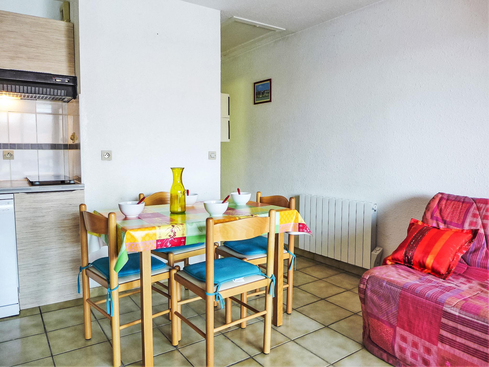 1-room studio 27 m2 on 1st floor. Simple and comfortable furnishings: living room with 1 double sofabed (1 x 140 cm, length 190 cm), TV (flat screen). Exit to the terrace. Sleeping alcove with 1 x 2 bunk beds (90 cm, length 190 cm). Kitchenette (oven, dishwasher, 2 ceramic glass hob hotplates, microwave, freezer, electric coffee machine). Shower, sep. WC. Electric heating. Terrace furniture. Facilities: washing machine, iron, hair dryer. Internet (WiFi, free). Parking space n 109. Please note: maximum 1 pet/ dog allowed. Smoke alarm. Instead of an enclosed bedroom, some sleeping areas are located in an open-plan area (gallery, alcove, etc.). 641250011992F