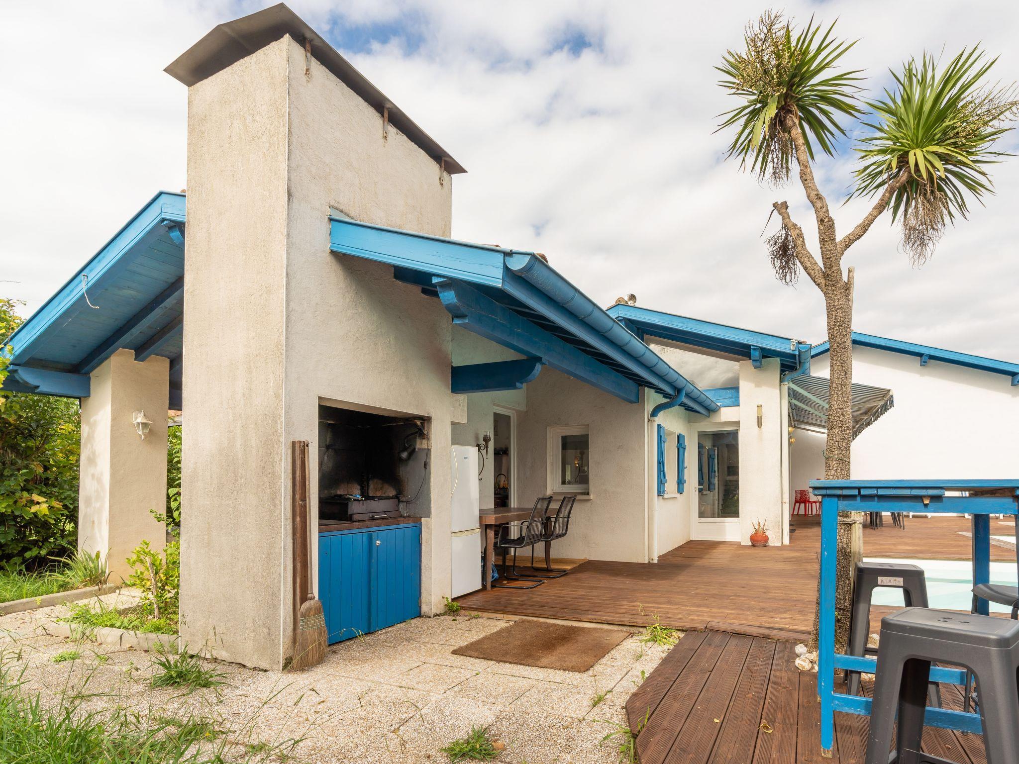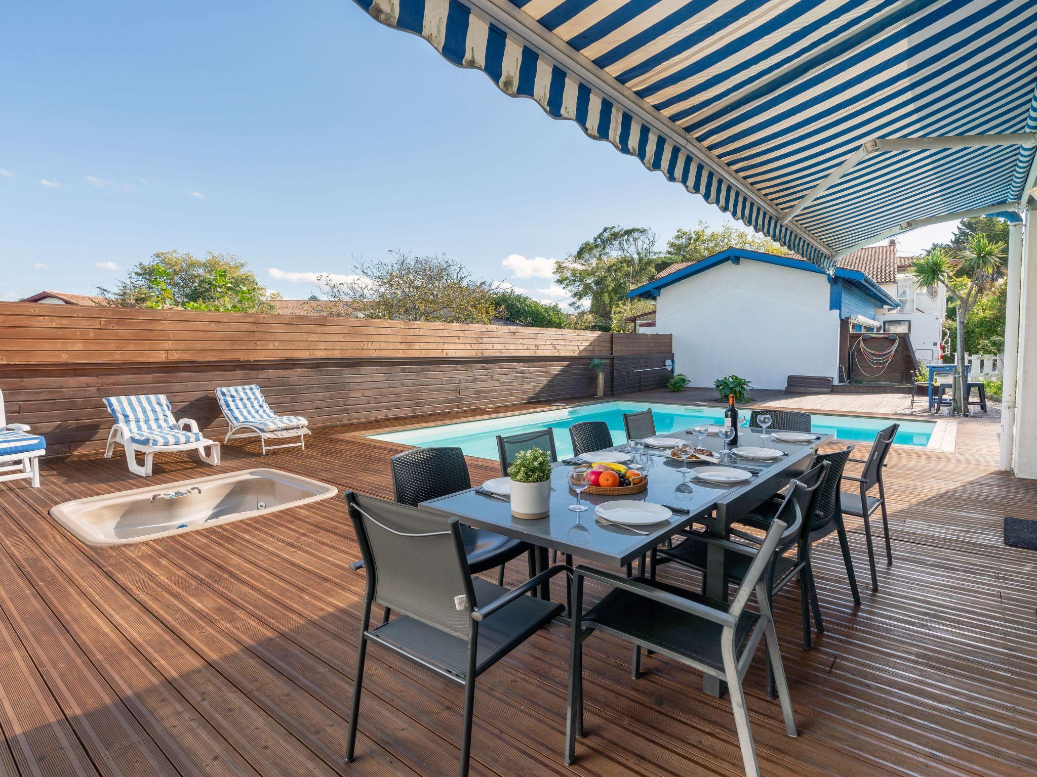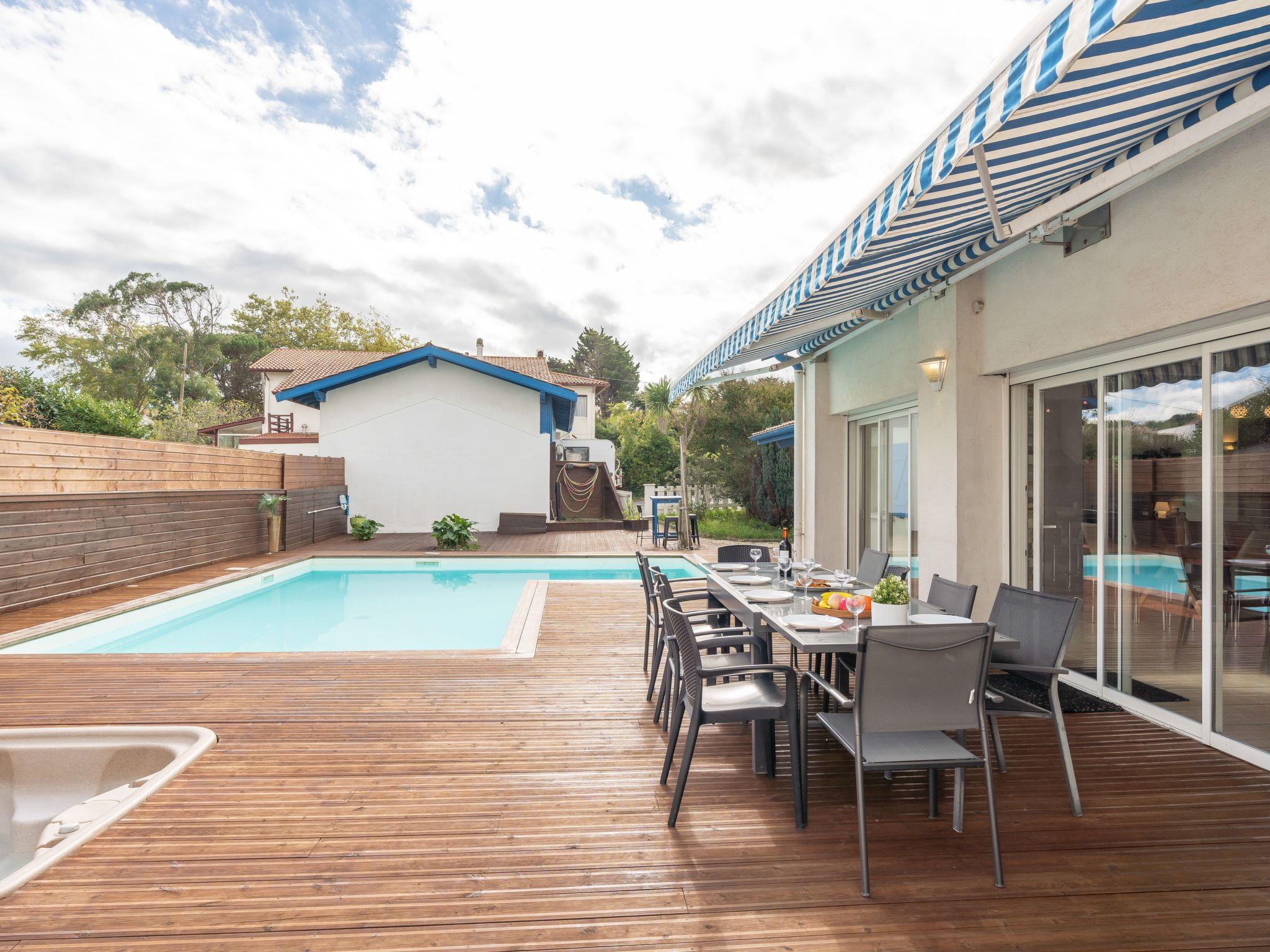 Bidart: Large villa "Villa Suerte", 3 storeys. In the district of Maribel, in a quiet position, from the sea, 650 m from the beach, in a cul-de-sac. Private: swimming pool heated (8 x 6 m, depth 180 cm, seasonal availability: 01.Jun. - 31.Dec.). Outdoor shower, hot tub, table tennis, barbecue. In the house: fitness room. Shop 600 m, grocery 1.3 km, supermarket 5 km, shopping centre 5 km, restaurant 600 m, bar, bakery 1.3 km, café, bus stop "Uhabia" 550 m, railway station "Biarritz" 7 km, sandy beach "Uhabia" 650 m, thermal baths "Helianthal" 7 km. Sports harbour 2.4 km, golf course (18 hole) 9 km, surf school 650 m. Nearby attractions: Bidaparc 1.5 km, Musée Saraleguinea 2.7 km, Citée de l'Océan 5.4 km, Pointe de Sainte Barbe 8.4 km. Hiking paths: la Rhune.