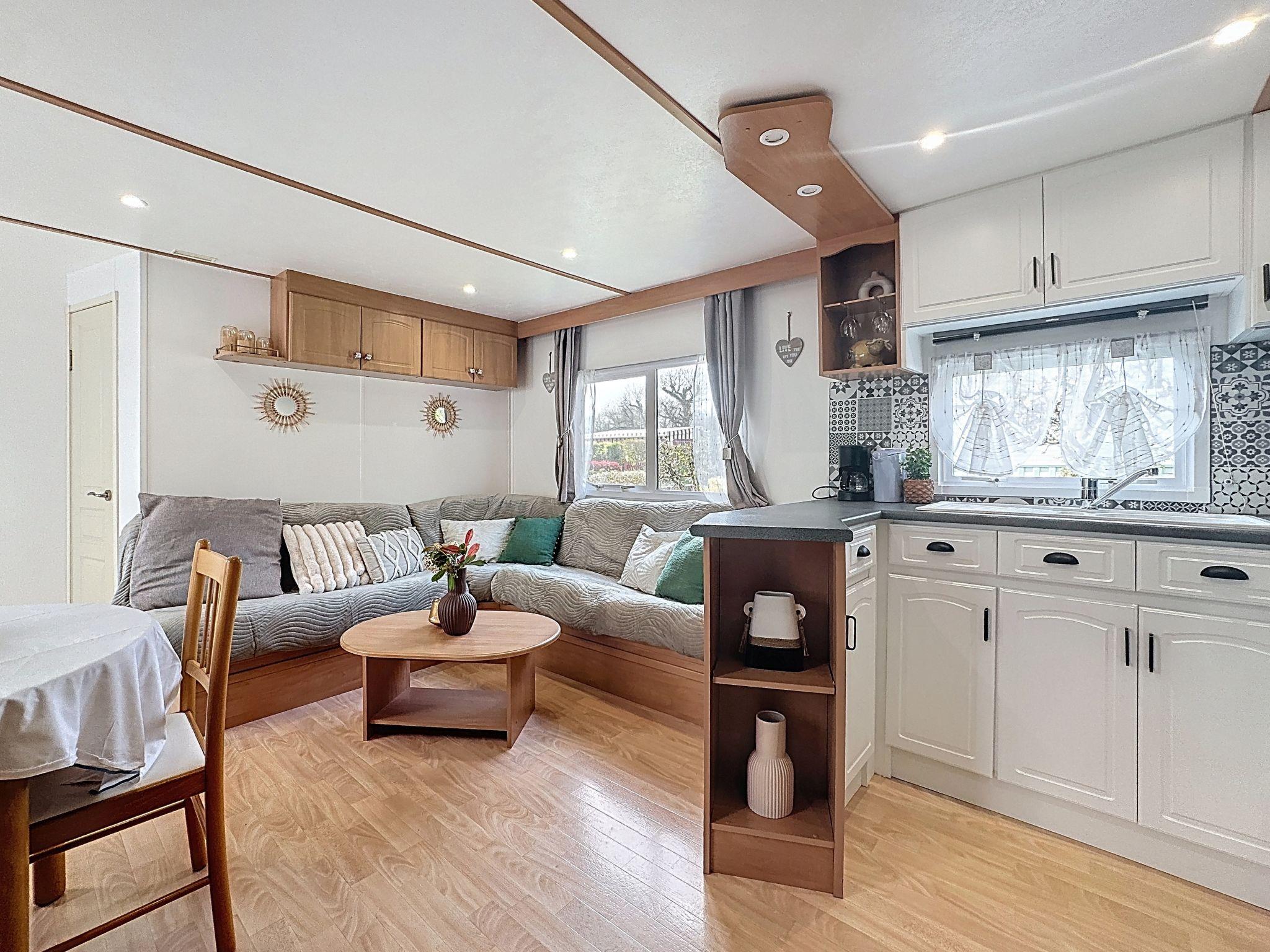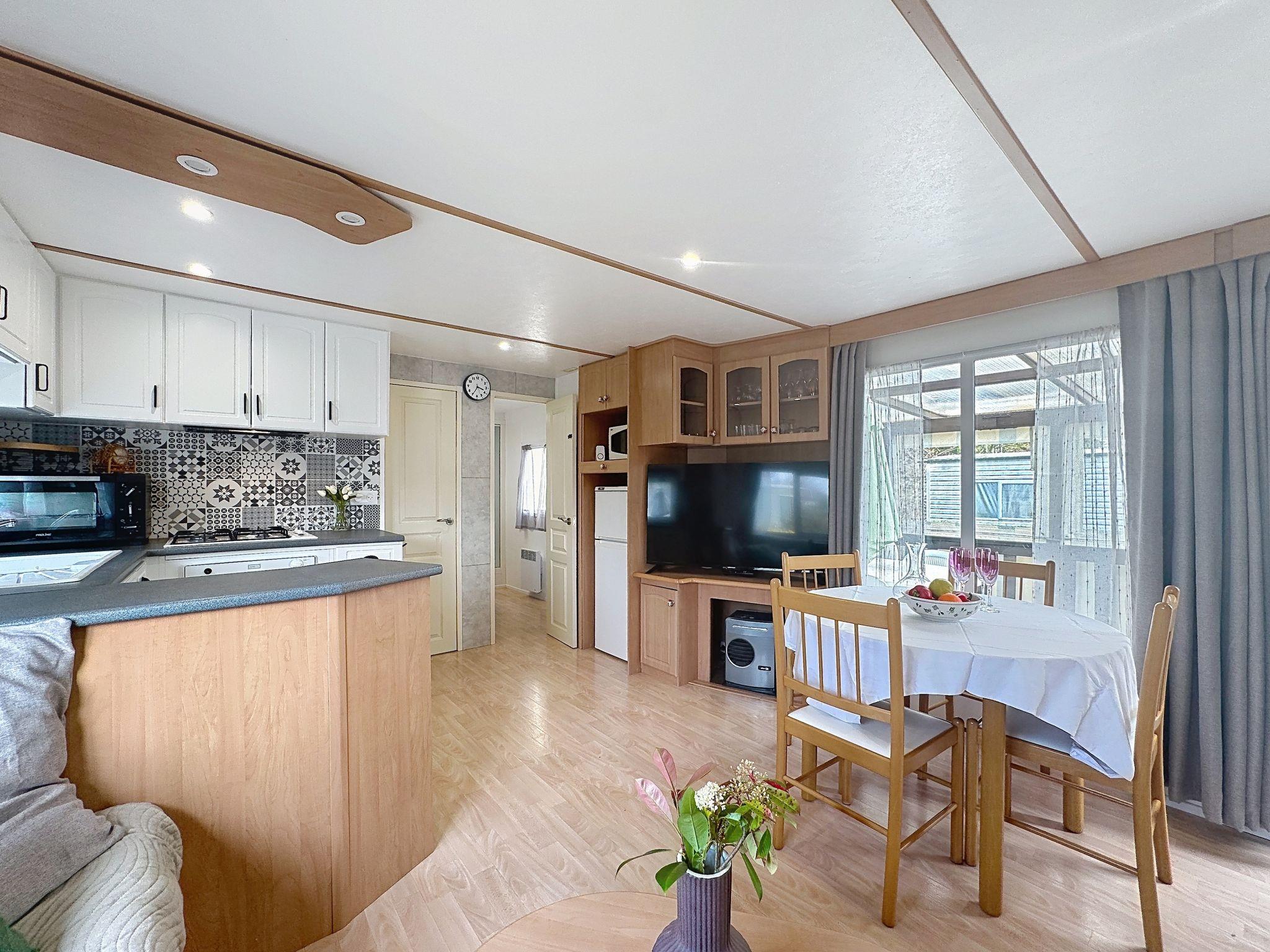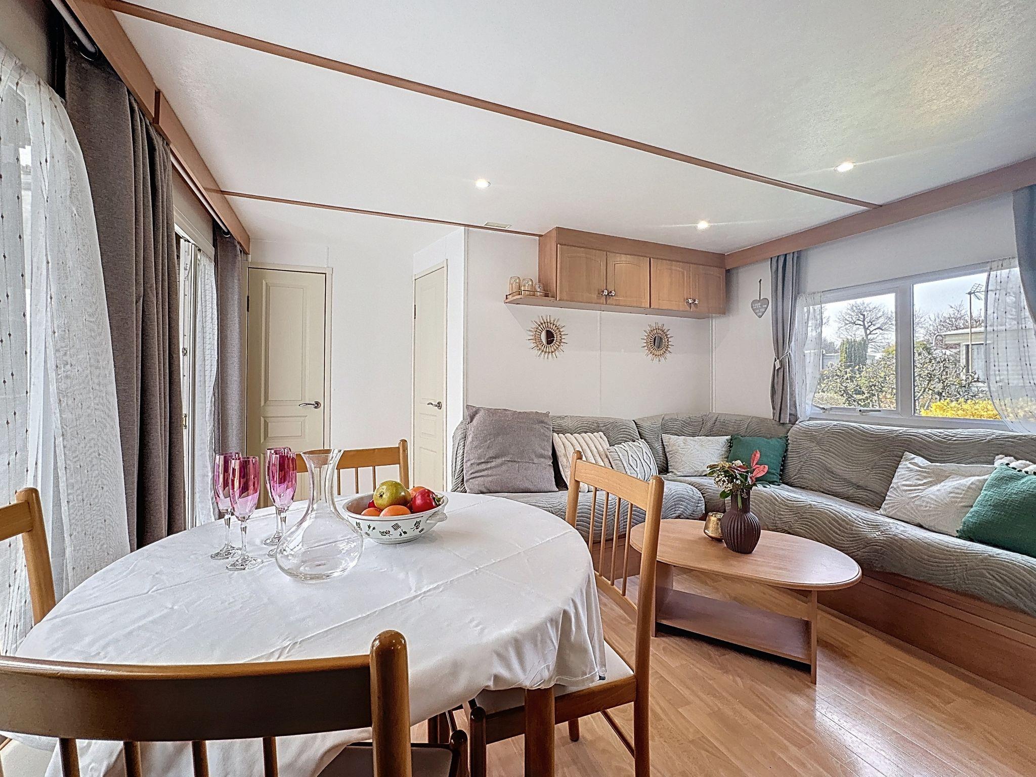 "Le Lieu Bill", 3-room mobile home 40 m2. Living/dining room with TV (flat screen). Exit to the terrace. 1 room with 1 french bed (1 x 140 cm, length 190 cm). 1 room with 1 french bed (1 x 140 cm, length 190 cm). Open kitchen (4 hot plates, dishwasher, toaster, kettle, microwave, electric coffee machine). Shower, sep. WC. Electric heating. Large terrace 10 m2. Terrace furniture. Facilities: Internet (WiFi, extra). Parking (2 cars). Please note: non-smokers only. 1 pet/ dog allowed. Smoke alarm.