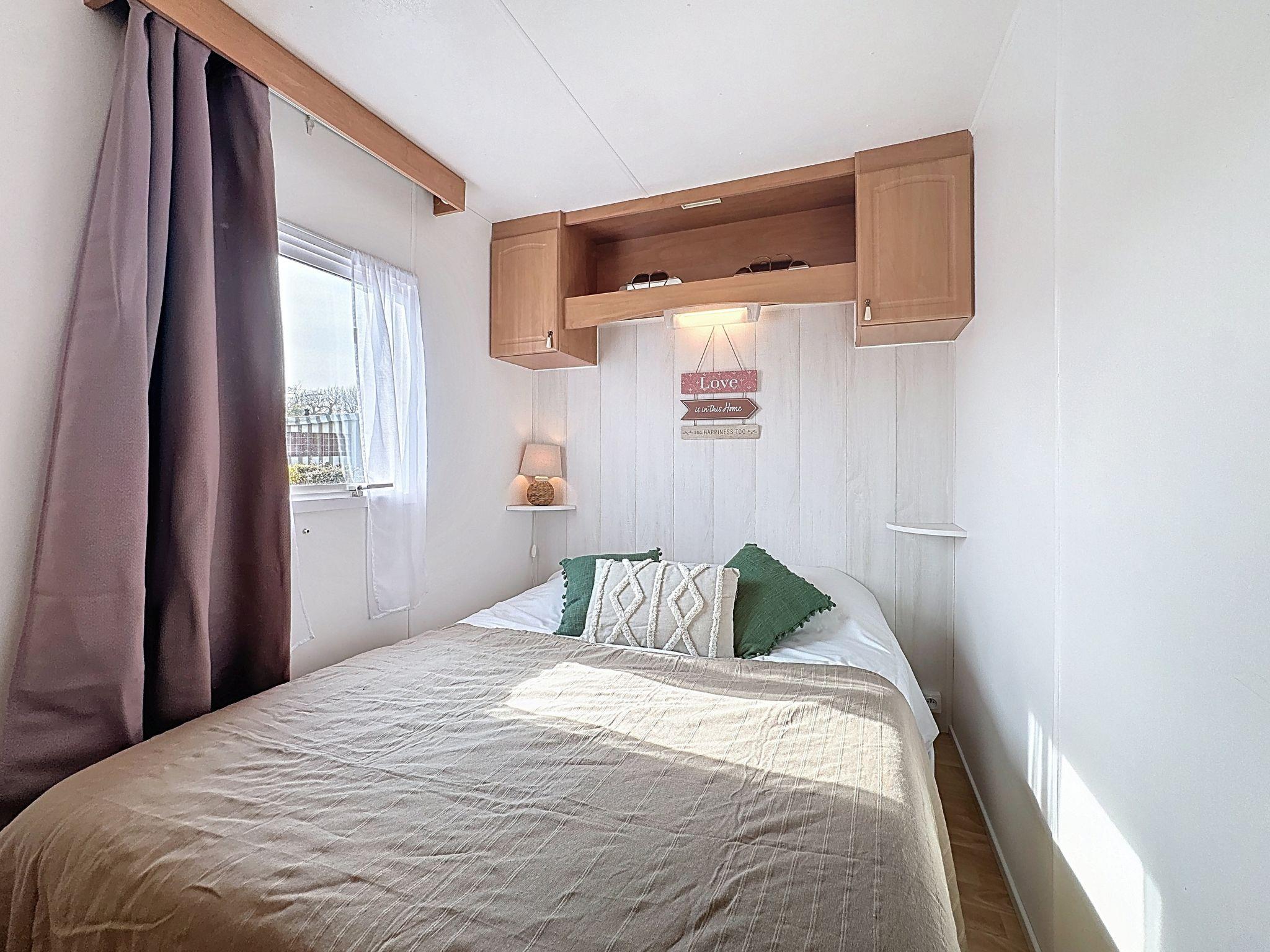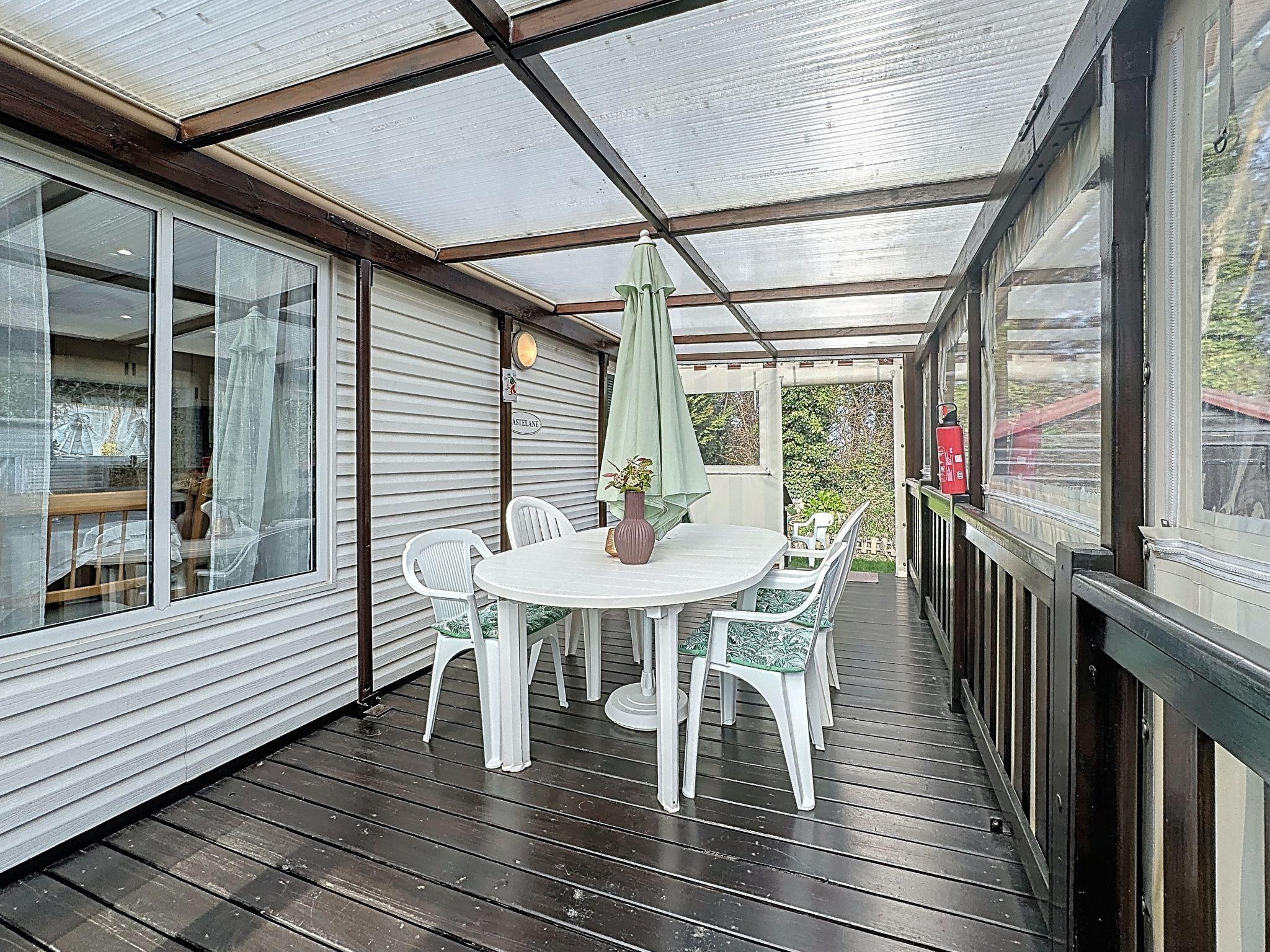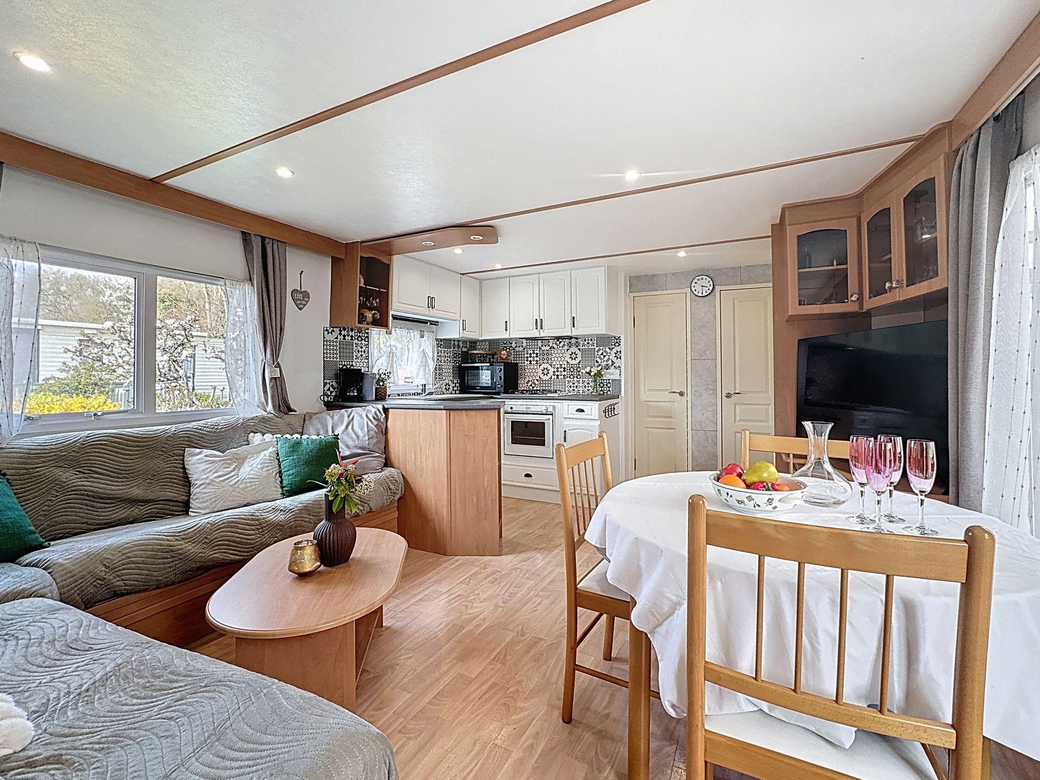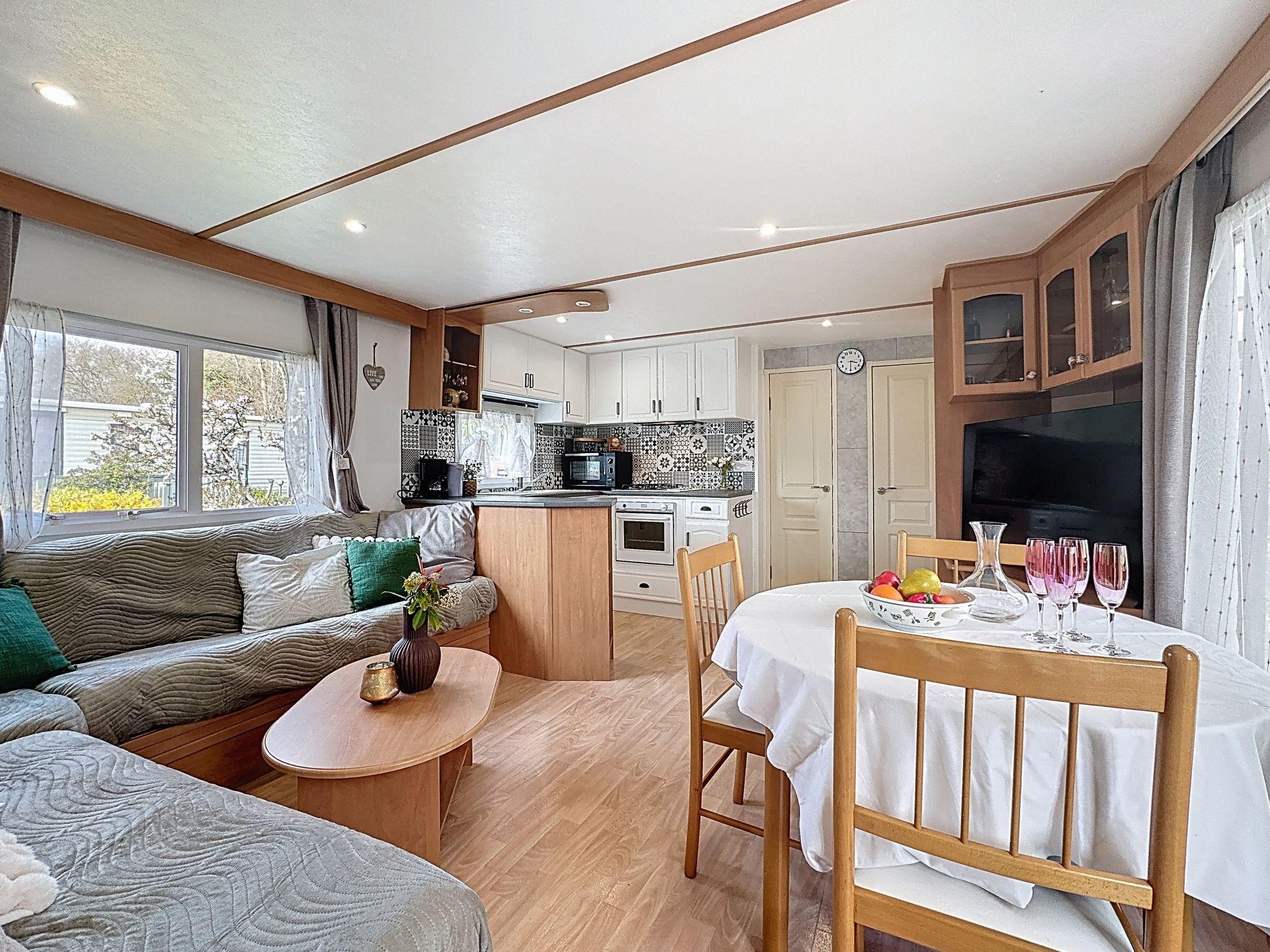 "Le Lieu Bill", 3-room mobile home 40 m2. Living/dining room with TV (flat screen). Exit to the terrace. 1 room with 1 french bed (1 x 140 cm, length 190 cm). 1 room with 1 french bed (1 x 140 cm, length 190 cm). Open kitchen (4 hot plates, dishwasher, toaster, kettle, microwave, electric coffee machine). Shower, sep. WC. Electric heating. Large terrace 10 m2. Terrace furniture. Facilities: Internet (WiFi, extra). Parking (2 cars). Please note: non-smokers only. 1 pet/ dog allowed. Smoke alarm.
