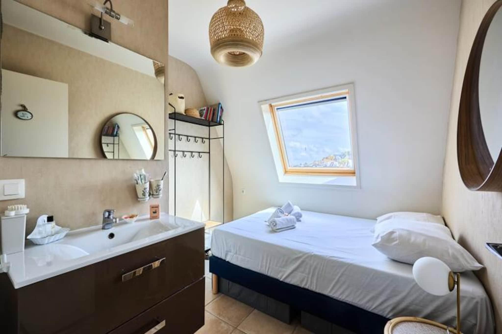 Vågn op til den beroligende lyd af bølger og duften af ??havluft i denne charmerende lejlighed på 40 m² i Blonville-sur-Mer, perfekt beliggende på Côte Fleurie. Med panoramaudsigt over havet og direkte adgang til stranden tilbyder dette tilflugtssted en idyllisk oase for op til fire gæster, der søger afslapning og kystskønhed. Uanset om du planlægger en romantisk getaway eller en rolig familieferie, tilbyder denne lejlighed den perfekte blanding af komfort og bekvemmelighed. Lejligheden, der ligger på 5. sal i en bygning med elevator, er omhyggeligt designet til et hyggeligt, men funktionelt ophold. Stuen har en komfortabel dobbeltsovesofa og et skrivebordsområde, ideelt til at slappe af eller indhente arbejdet. Det fuldt udstyrede køkken med spiseplads inkluderer moderne apparater såsom opvaskemaskine, ovn og mikrobølgeovn, hvilket gør madlavning til en leg. Soveværelset kan prale af en luksuriøs queensize-seng og et eget badeværelse med bruser, mens et separat toilet giver ekstra bekvemmelighed. Yderligere faciliteter inkluderer vaskemaskine, tørretumbler, Wi-Fi og endda et udvalg af bøger til rolige aftener indendørs. Blonville-sur-Mer tilbyder mere end bare fantastiske strande. Gå en tur gennem de maleriske gader, spis på berømte lokale restauranter som \