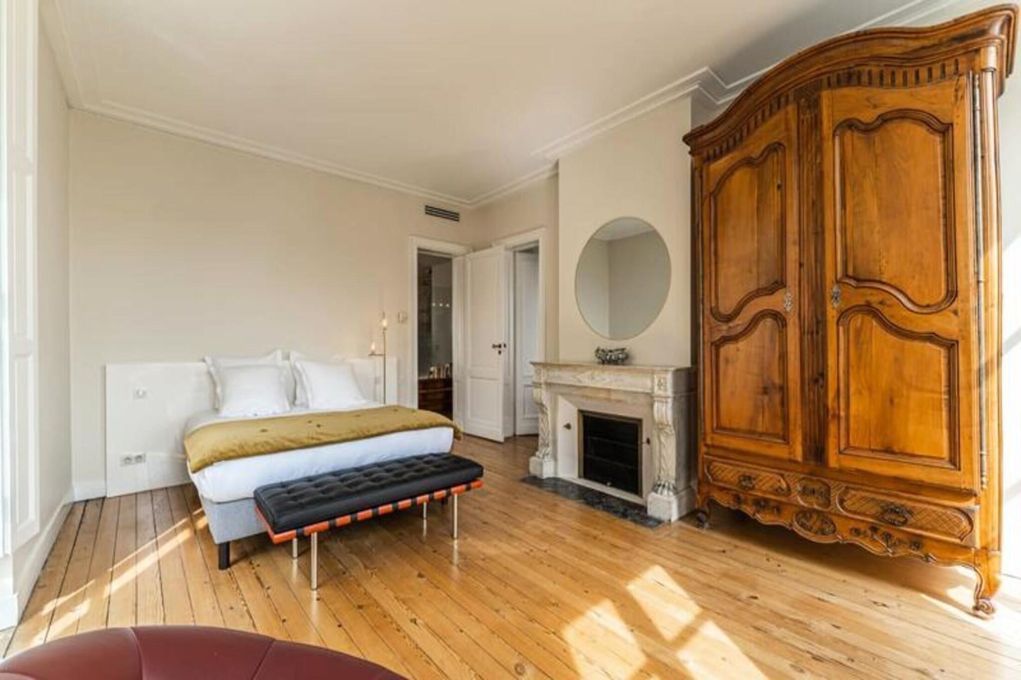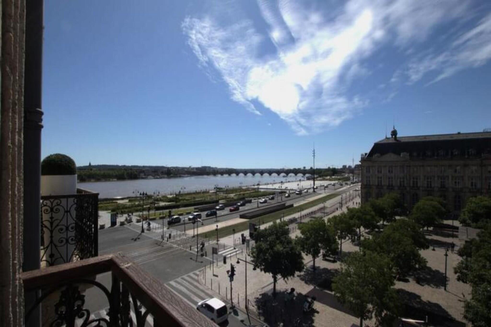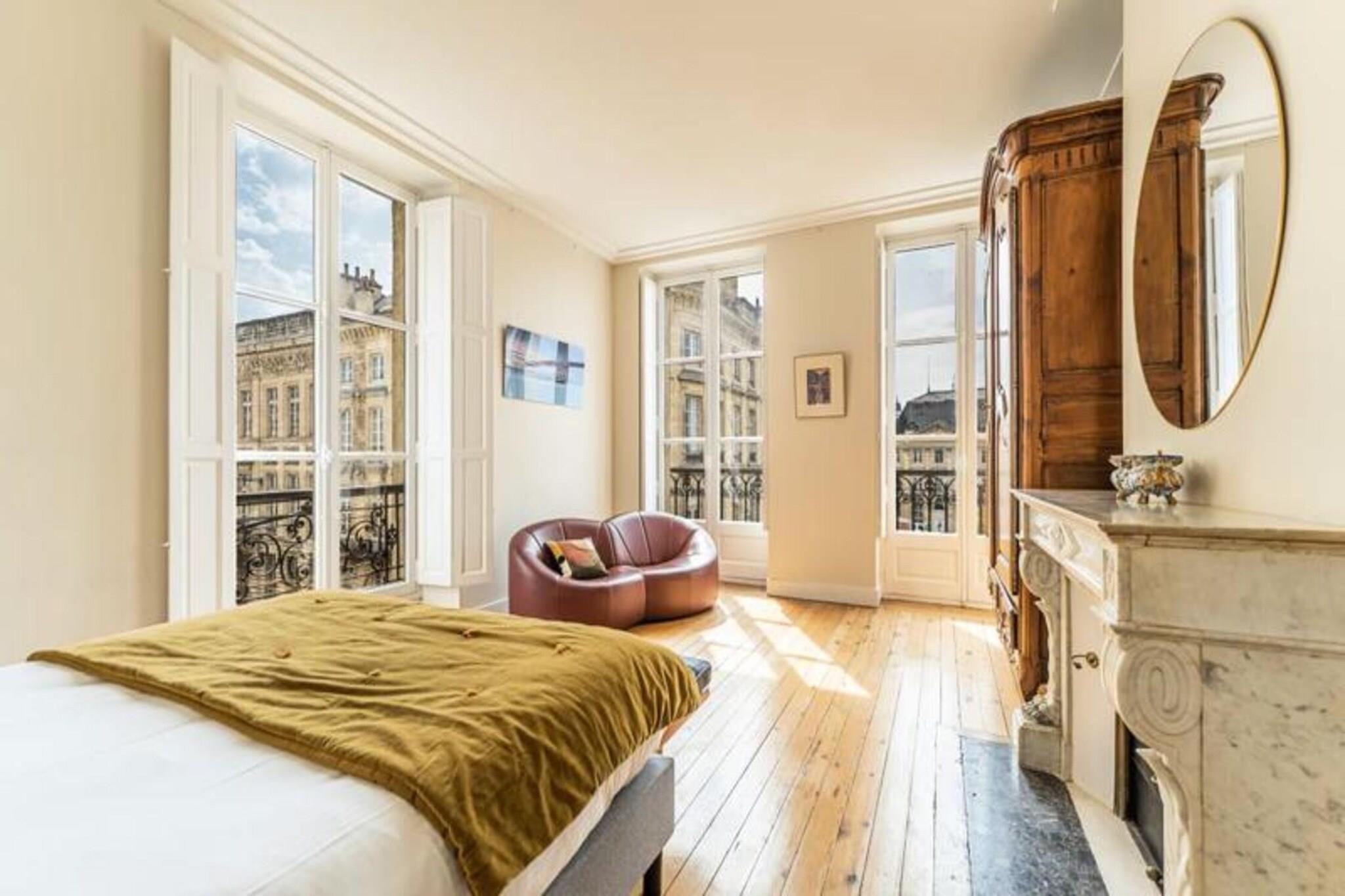 Denne udsøgte lejlighed i Haussmann-stil på 140 m² er beliggende i et af Bordeauxs mest prestigefyldte distrikter, og tilbyder et luksuriøst tilflugtssted med en spektakulær udsigt over Garonne, Place Jean Jaurès og det berømte vandspejl. Beliggende mellem Place des Quinconces og Place de la Bourse, kombinerer lejligheden smukt elegancen fra en svunden tid med moderne bekvemmeligheder, hvilket giver de perfekte rammer for op til fire gæster. Lejligheden har to elegant indrettede soveværelser, herunder et fredeligt soveværelse med dobbeltseng, antik garderobe og et skrivebord med panoramaudsigt over Garonne. Den anden suite, der er lige så raffineret, inkluderer et 4K-tv og et badeværelse med glasmosaikfliser. Den ekspansive stue med dens antikke pejs, panoramaudsigt og luksuriøse siddepladser er et fredfyldt sted at slappe af, mens spisepladsen med en anden charmerende pejs er ideel til at dele måltider. Det moderne køkken er udstyret med alt det nødvendige for en gourmetoplevelse, herunder ovn, kogeplader, vinkælder og køleskab. Bekvemmelighed er sikret med reversibelt klimaanlæg, Wi-Fi, en vaskemaskine og en valgfri morgenmadsservice. Lejligheden inkluderer også adgang til en nærliggende offentlig parkeringskælder, hvilket gør dit ophold lettere. Bordeauxs smarte kvarter er omgivet af luksusbutikker, forestillingssale og restauranter i topklasse, med vartegn som Palais Rohan, Saint-André-katedralen og Pey-Berland Tower kun en kort gåtur væk. Den Gyldne Trekant og Place des Quinconces er også i nærheden, hvilket gør denne lejlighed til den ideelle base for at udforske byens rige kultur og historie.