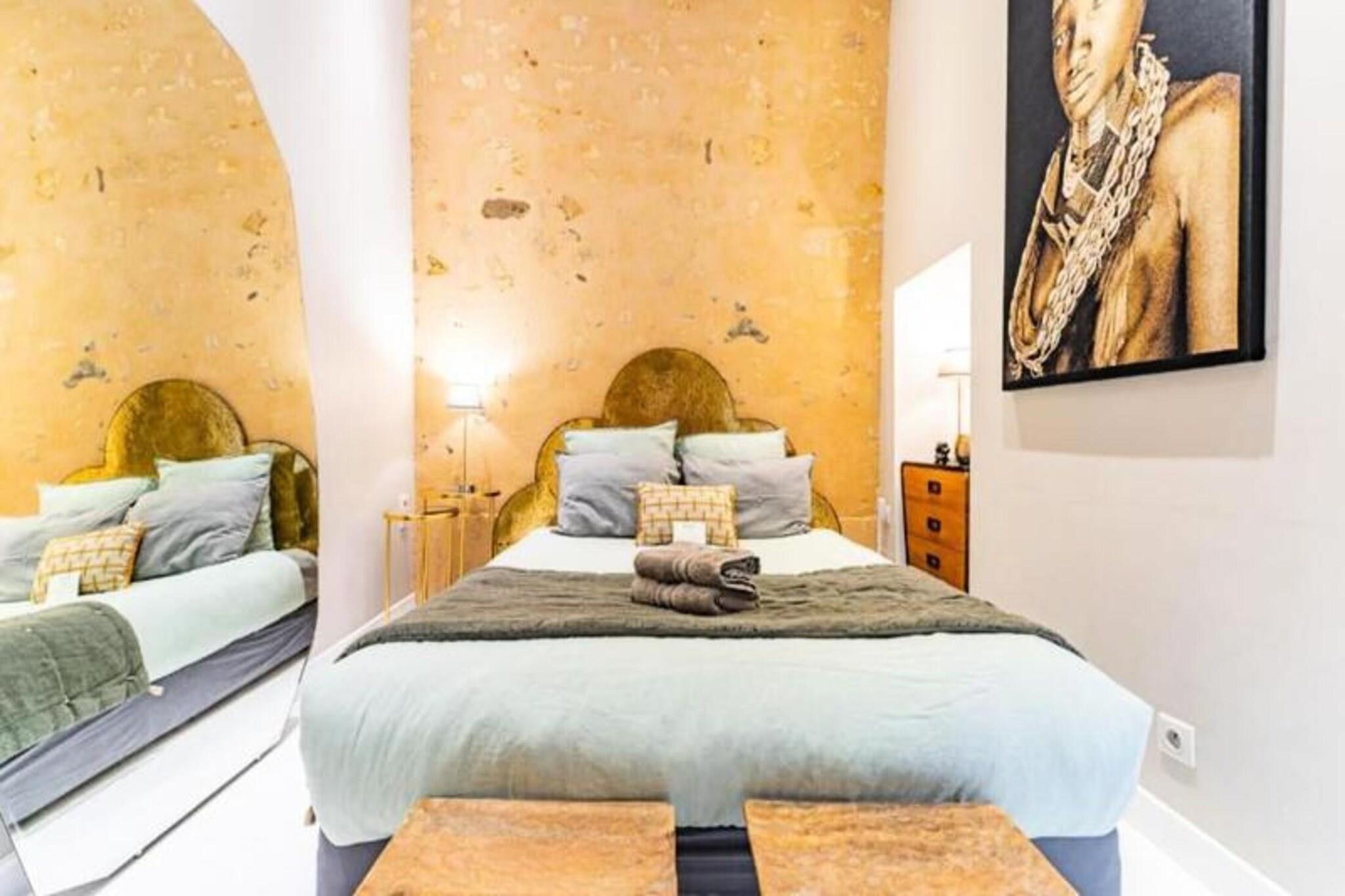 Ejendom sammen med en chik og elegant atmosfære tilbyder en nyligt renoveret lejlighed i hjertet af Bordeauxs historiske distrikt. Kun få skridt fra museer, teatre, biografer, restauranter og butikker har lejligheden eksklusive faciliteter, herunder en Nespresso-kaffemaskine, Bluetooth-højttaler, fladskærms-tv med Chromecast og et fjernbetjent stearinlys. Gæsterne kan slappe af på en privat terrasse. Et depositum på 250 euro er påkrævet, sikkert behandlet via Swikly. Lejligheden er beliggende i en stille bygning fra det 18. århundrede i et pulserende, men roligt kvarter med nem adgang til Bordeauxs kulturelle og historiske attraktioner. Det er bekvemt beliggende nær Mérignac Lufthavn og St Jean Station, med en offentlig parkeringsplads 150 meter væk og gratis parkering på gaden på udvalgte tidspunkter. Denne placering giver en chance for at udforske Bordeaux, et UNESCOs verdensarvssted kendt for sin livlige atmosfære og rige historie. Gæsterne har også adgang til levering af morgenmad. Bordeaux, der er berømt for sin vinkultur og moderne livlighed, tilbyder den perfekte base for at udforske dens elegante gader og kulturelle scene.