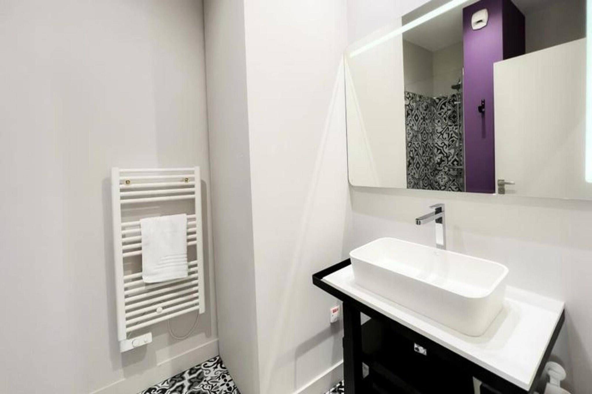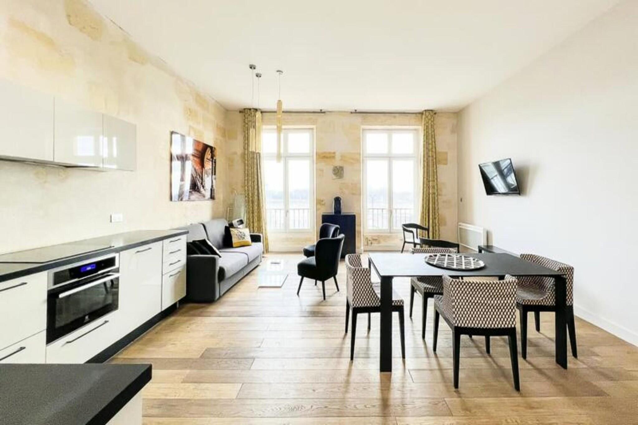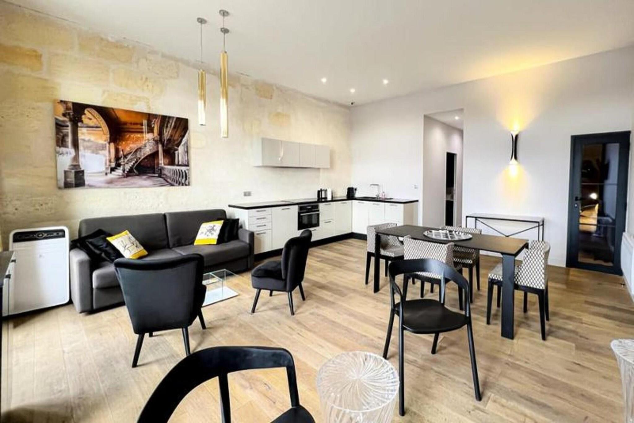 Denne 72 m² møblerede lejlighed kan komfortabelt rumme op til 6 personer. Den har et soveværelse med en 160 x 200 cm dobbeltseng og et andet soveværelse med to 90 x 200 cm enkeltsenge. Den rummelige stue indeholder en sovesofa, to lænestole, et sofabord og et tv, hvilket giver rigelig plads til afslapning. Lejligheden er kæledyrsvenlig, og husholdningslinned (lagner, håndklæder og viskestykker) er forsynet med opredte senge ved ankomst. Selvom der ikke er en balkon, vil gæsterne nyde bekvemmeligheden ved et fuldt udstyret åbent køkken, aircondition og Wi-Fi. Derudover er en privat parkeringsplads inkluderet, med ekstra lejemuligheder som en sen check-in service tilgængelig efter anmodning. Beliggende i centrum af Bordeaux, er lejligheden kun en kort gåtur fra det berømte Museum of Contemporary Art (CAPC) og de naturskønne Garonne-flodkajer. Det er også bekvemt beliggende i nærheden af ??sporvognen (sporvogn B), der giver nem adgang til Bordeauxs pulserende bymidte. Byens berømte vinregion, UNESCO-listede vartegn og kulturelle attraktioner er alle i umiddelbar nærhed. Bordeaux togstation ligger kun 10 minutters gang væk, med busser og sporvognsstoppesteder i nærheden. Gæsterne kan nå Bordeaux-Mérignac Lufthavn på 30 minutter med transport, hvilket gør denne lejlighed til en ideel base for at udforske både byen og de omkringliggende attraktioner. Lejligheden byder på et fuldt udstyret køkken med moderne apparater, herunder en ovn/mikroovn, opvaskemaskine, køleskab, kogeplader, elkedel, Nespresso kaffemaskine og brødrister. For ekstra bekvemmelighed er lejligheden udstyret med en vaskemaskine, tørretumbler, strygejern og strygebræt. Badeværelset har bruser, håndvask, håndklædetørrer og toilet. Lejligheden er designet med alt det nødvendige for at gøre dit ophold behageligt, og et sikkert depositum på 750 euro er påkrævet for reservationer.