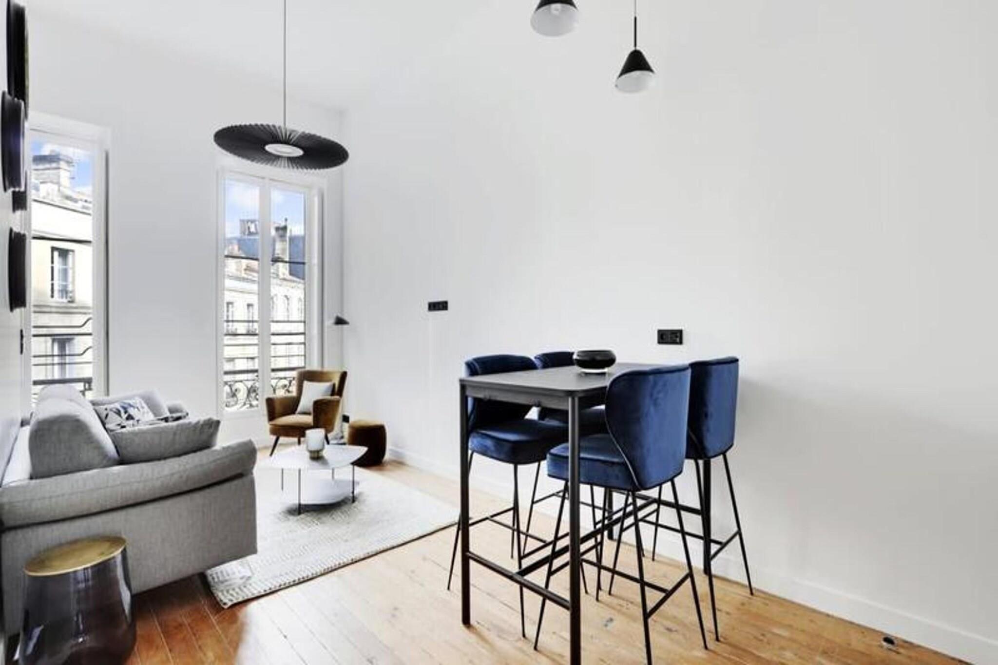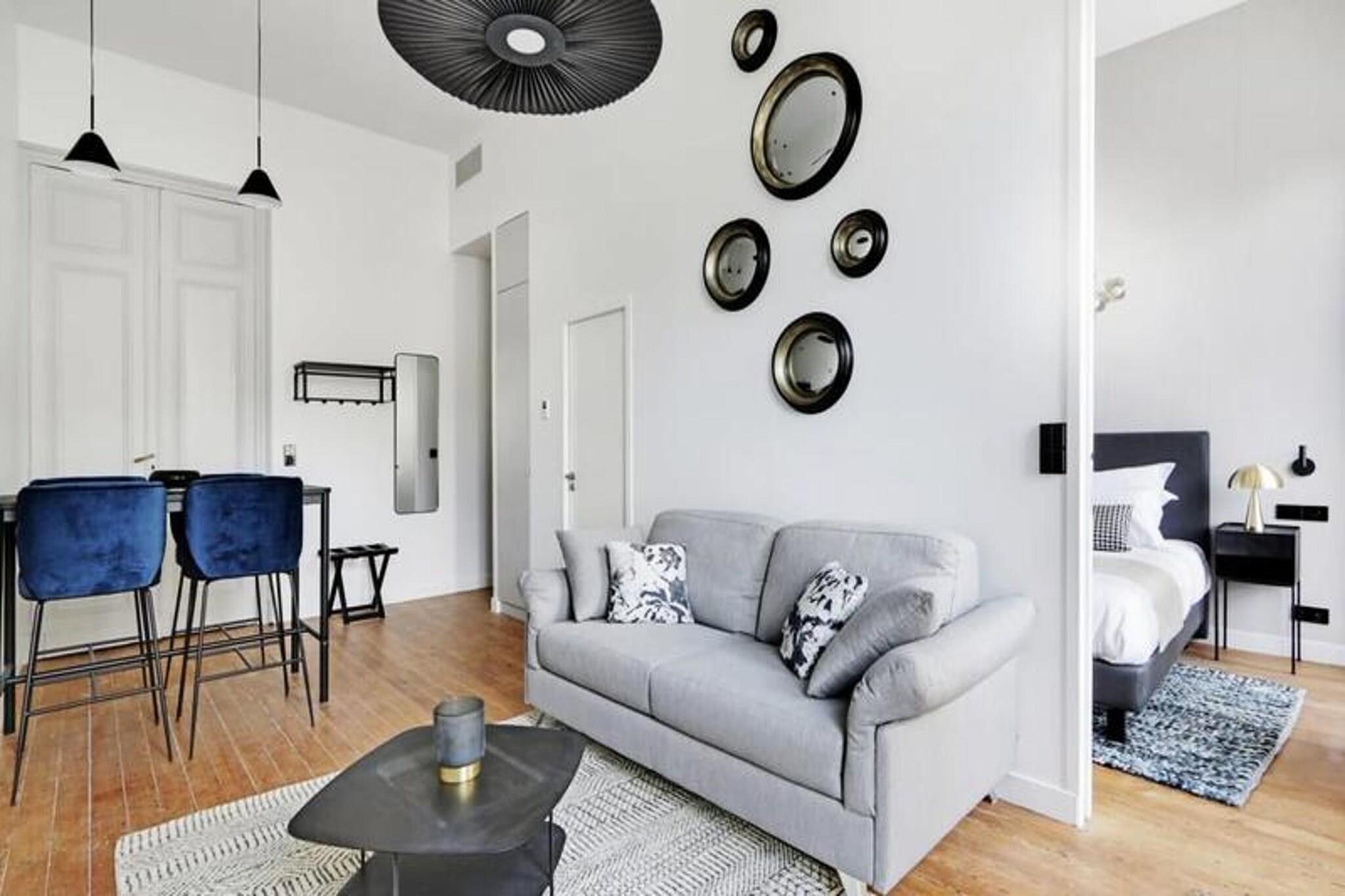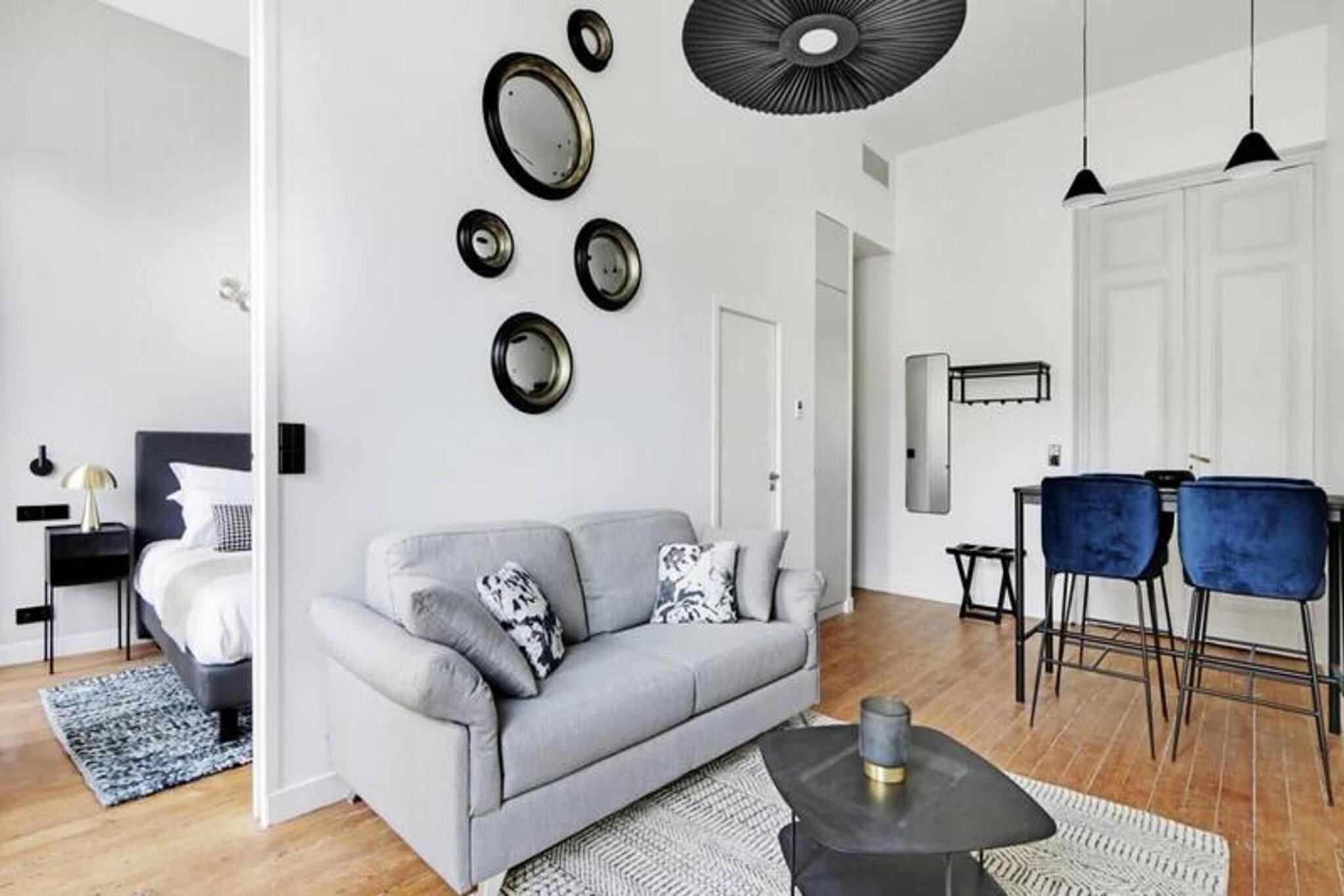 Nyd fordelene ved et hotel i en lejlighed med denne fremragende 35 m² store suite beliggende på første sal i et tidligere privat palæ med en fantastisk udsigt over den ikoniske rue d'Aviau. Denne lejlighed kan rumme 1 til 4 personer og byder på et privat soveværelse med en kingsize seng, der kan adskilles i to enkeltsenge, og en fremragende sovesofa i stuen. Soveværelset har en karnap, der fører til badeværelset med et stort bruseniche. Det fuldt udstyrede køkken er perfekt til at tilberede retter med sydlandsk smag, og stuen inviterer til at nyde måltiderne omkring spisebordet. Lejligheden er beliggende i et smart og roligt boligområde, tæt på den storslåede offentlige have, ideel til gåture. Det er kun 5 minutter fra sporvognslinje C, som giver adgang til de vigtigste seværdigheder i Bordeaux. Nærliggende attraktioner omfatter den offentlige have, lokale restauranter, butikker og tjenester. Suiten tilbyder en blanding af bekvemmelighed og afslapning, perfekt til venner, familie eller forretningsrejser. Bemærk, at rygning er strengt forbudt i lejligheden, og et depositum på EURO500 er påkrævet. Suiten er designet til uovertruffen komfort og tilbyder autonom adgang med et tilsluttet låsesystem, aircondition, pengeskab, satellit-tv og højhastigheds-Wi-Fi.