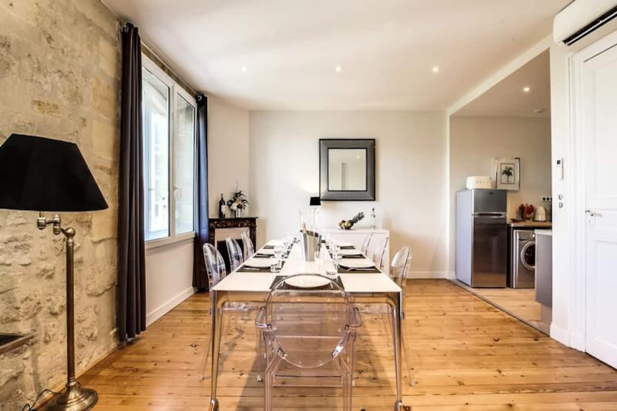 Træd ind i hjertet af Bordeaux og oplev denne exceptionelle lejlighed på 110 m², beliggende på tredje sal i en historisk bygning med udsigt over den pulserende Place Gambetta. Med sin førsteklasses beliggenhed inviterer denne ejendom dig til at fordybe dig i byens rige kulturarv, fra den ikoniske Place de la Bourse og den fortryllende Miroir d'Eau til de charmerende brostensbelagte gader i Saint-Pierre-distriktet. Lejlighedens panoramaudsigt og elegante atmosfære gør den til en sand perle for rejsende, der søger både komfort og kultur. Indenfor finder du tre rummelige dobbeltværelser, der kan omdannes til enkeltsenge efter anmodning, hvilket sikrer fleksibilitet for familier eller grupper. Hvert af de tre badeværelser tilbyder en blanding af brusere og badekar, hvilket giver et luksuriøst tilflugtssted efter en dag med udforskning. Den lyse opholdsstue, komplet med en komfortabel sovesofa, stort tv og højhastigheds-WiFi, er perfekt til at slappe af eller planlægge dit næste eventyr. Det fuldt udstyrede åbne køkken med opvaskemaskine, Nespresso-maskine og vaskemaskine/tørretumbler giver dig mulighed for at nyde hjemmets komfort, mens du nyder smagen af ??Bordeaux. Beliggende i det dynamiske Place Gambetta-kvarter er du omgivet af elegante butikker, berømte restauranter og livlige caféer. En kort gåtur fører dig til den travle Rue Sainte-Catherine, de arkitektoniske vidundere i Grand Théâtre og de fredfyldte grønne områder i den nyligt renoverede Place Gambetta. For kunst- og historieentusiaster ligger Musée des Beaux-Arts og Saint-André-katedralen kun få øjeblikke væk. Uanset om du besøger byen for fritid eller forretning, tilbyder denne lejlighed en uovertruffen kombination af Bordeauxs historiske charme og moderne bekvemmeligheder. Med nem adgang til offentlig transport og nærliggende parkeringsmuligheder har det aldrig været nemmere at udforske byen og dens legendariske vinregion. Lad denne exceptionelle ejendom være din port til Bordeaux' elegance og livlighed.